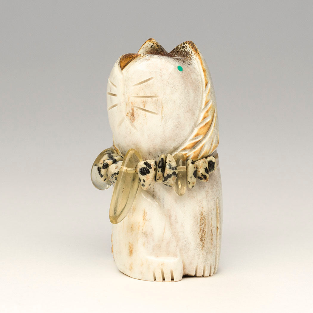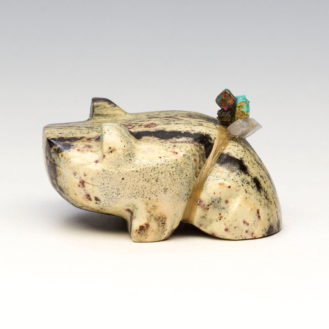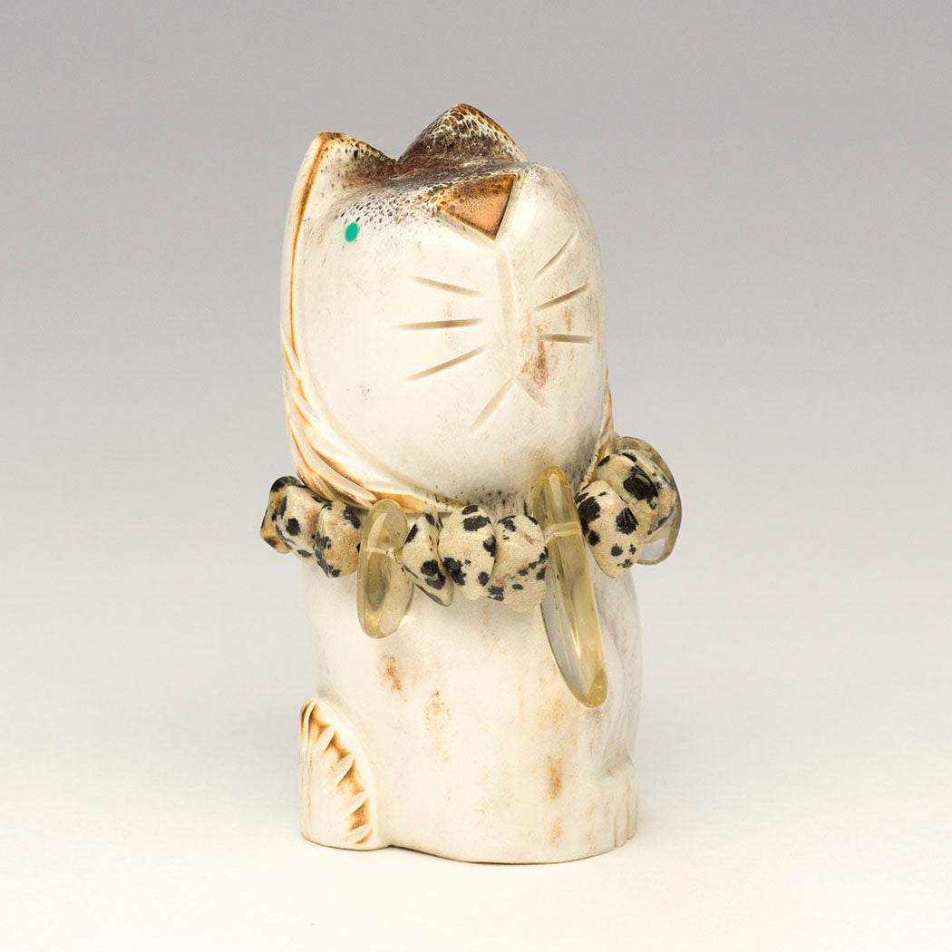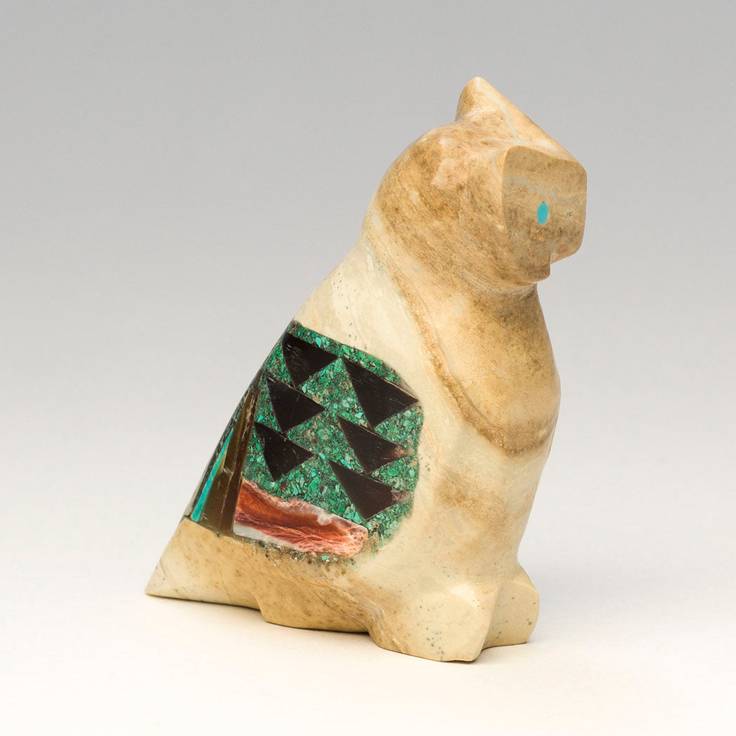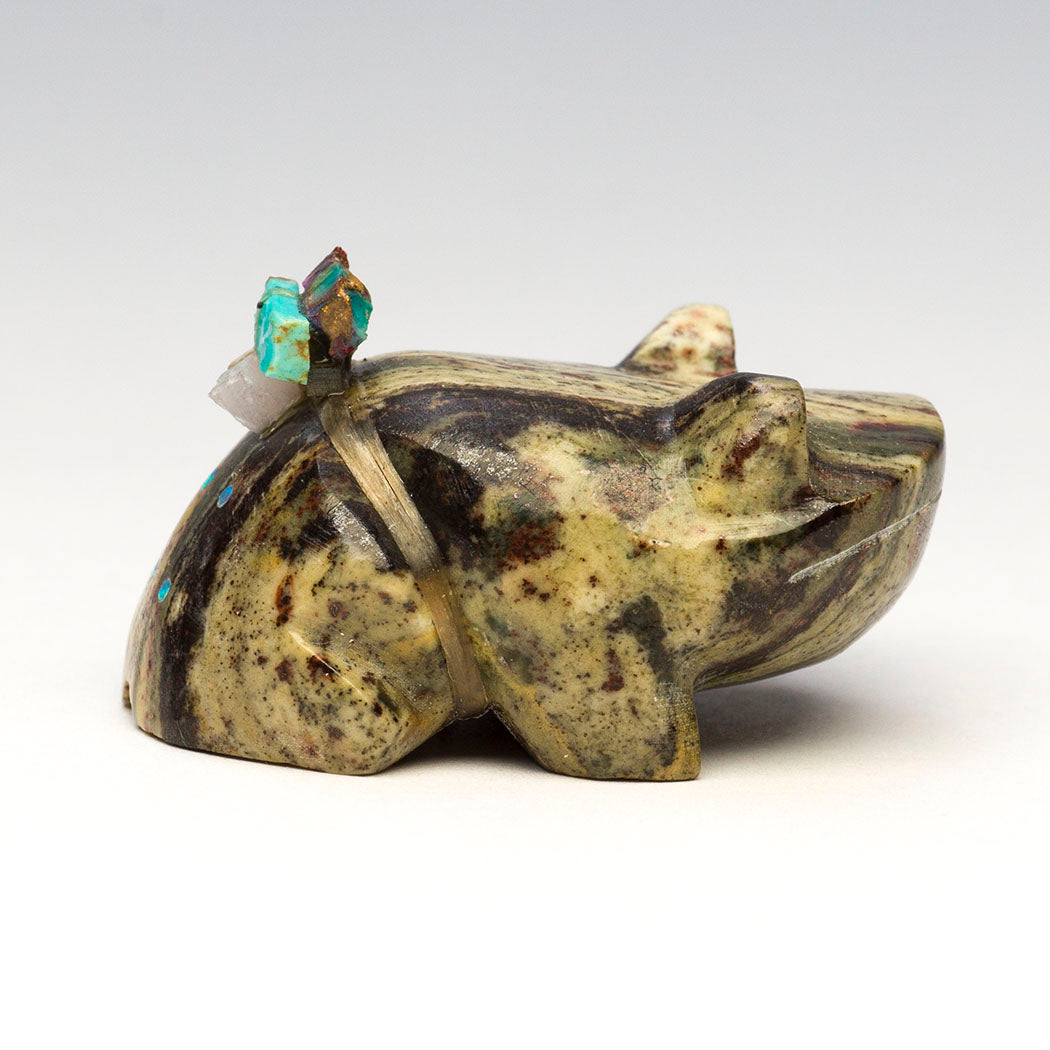 Felinae. With about 33 species, this group includes bobcats, cheetahs, ocelots, cougars and our beloved domestic house cats. Melvin Sandoval's poised wildcat as bobcats are sometimes called, is presented in an onyx with rustic colors blessing it with hunting camouflage. Fur changes color depending on the season too. Thankful for the wildcat's independent ways, Melvin secured a lovely offering bundle from a gorgeous serpentine point, bright turquoise and heishe beads. Approximately 2" long, 5/8" wide and 1 3/8" tall.