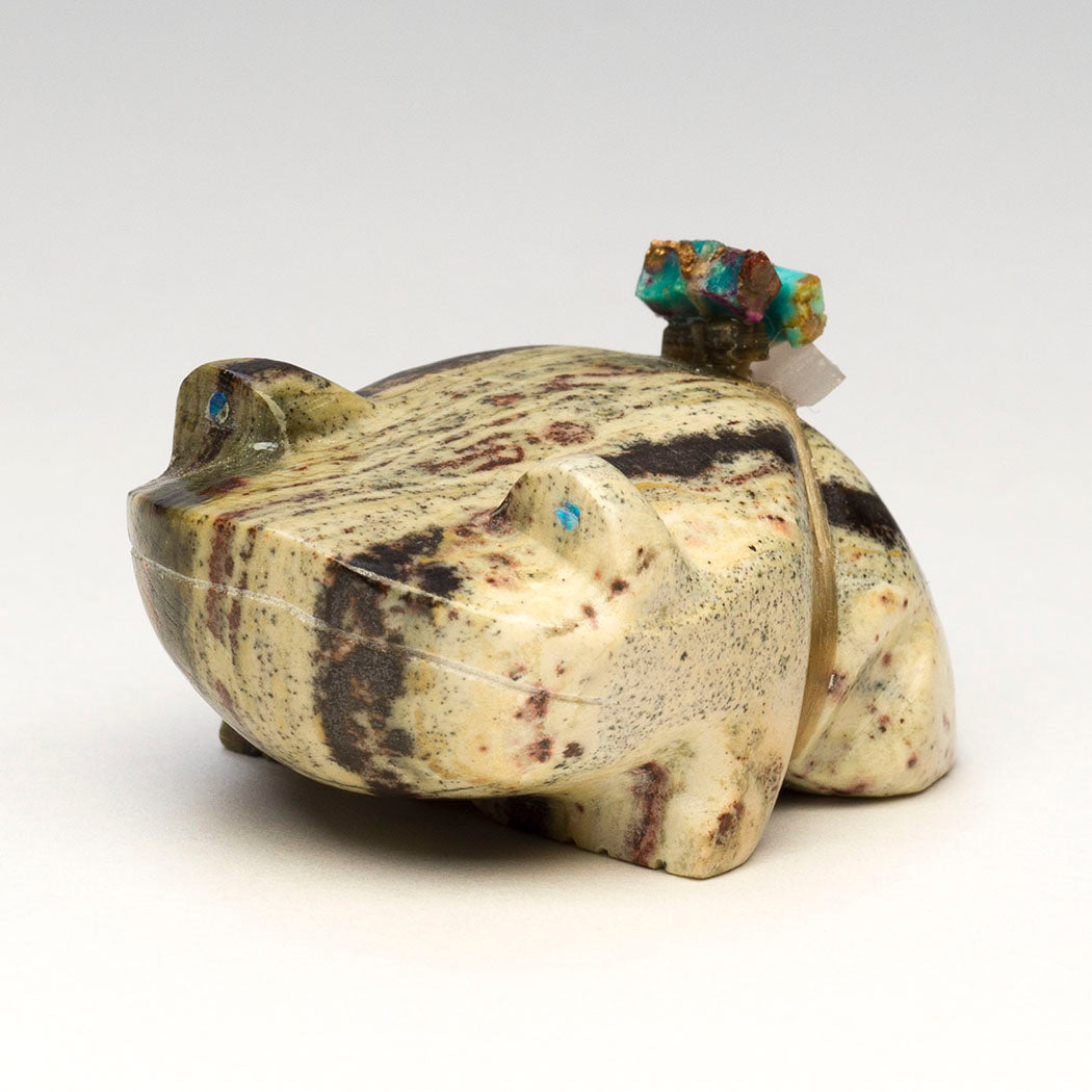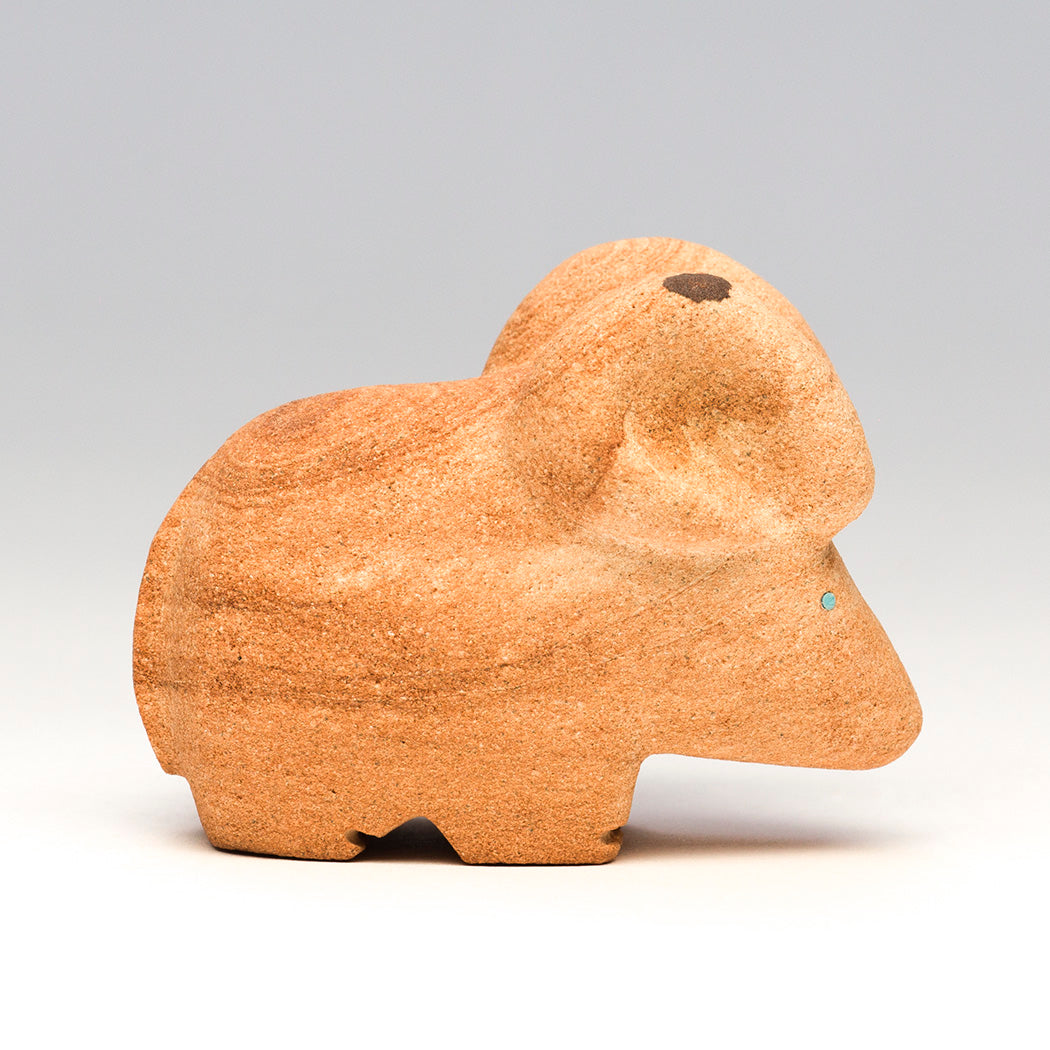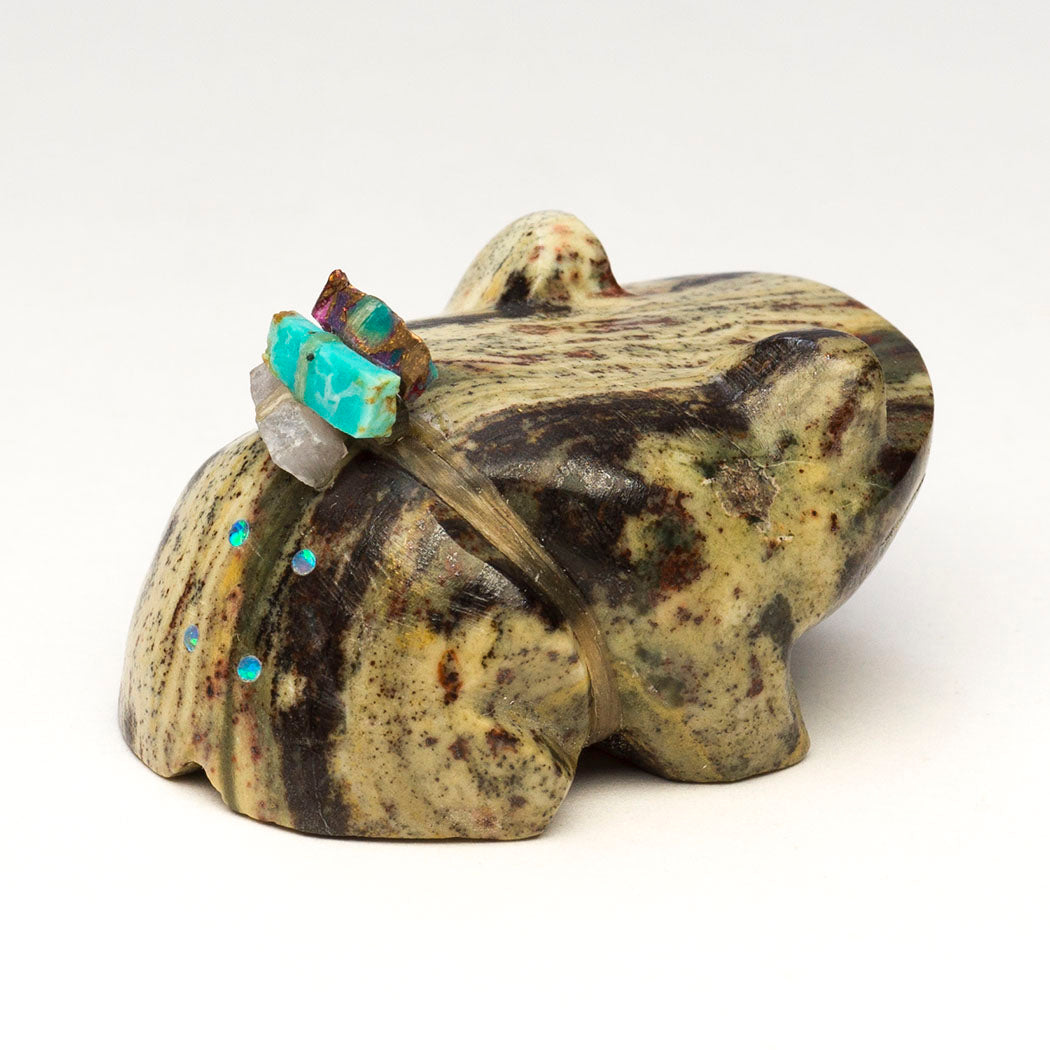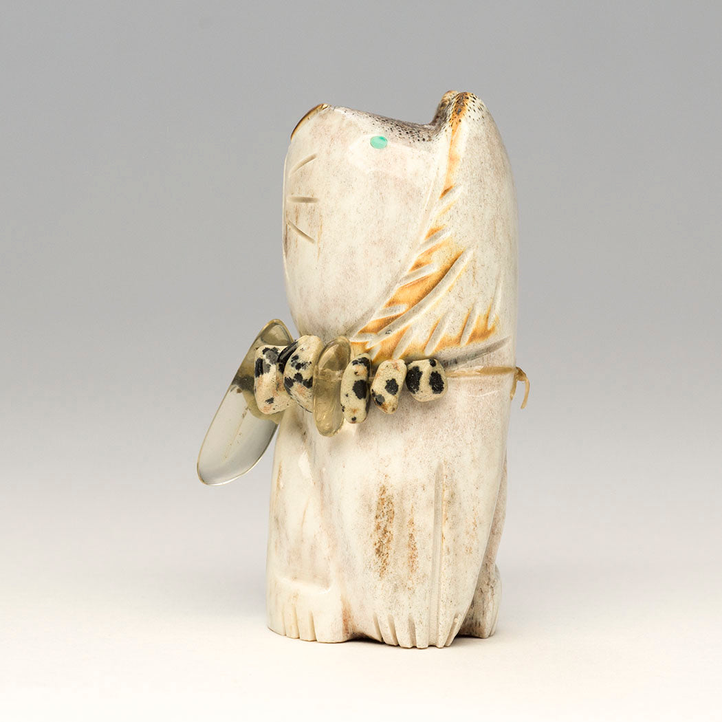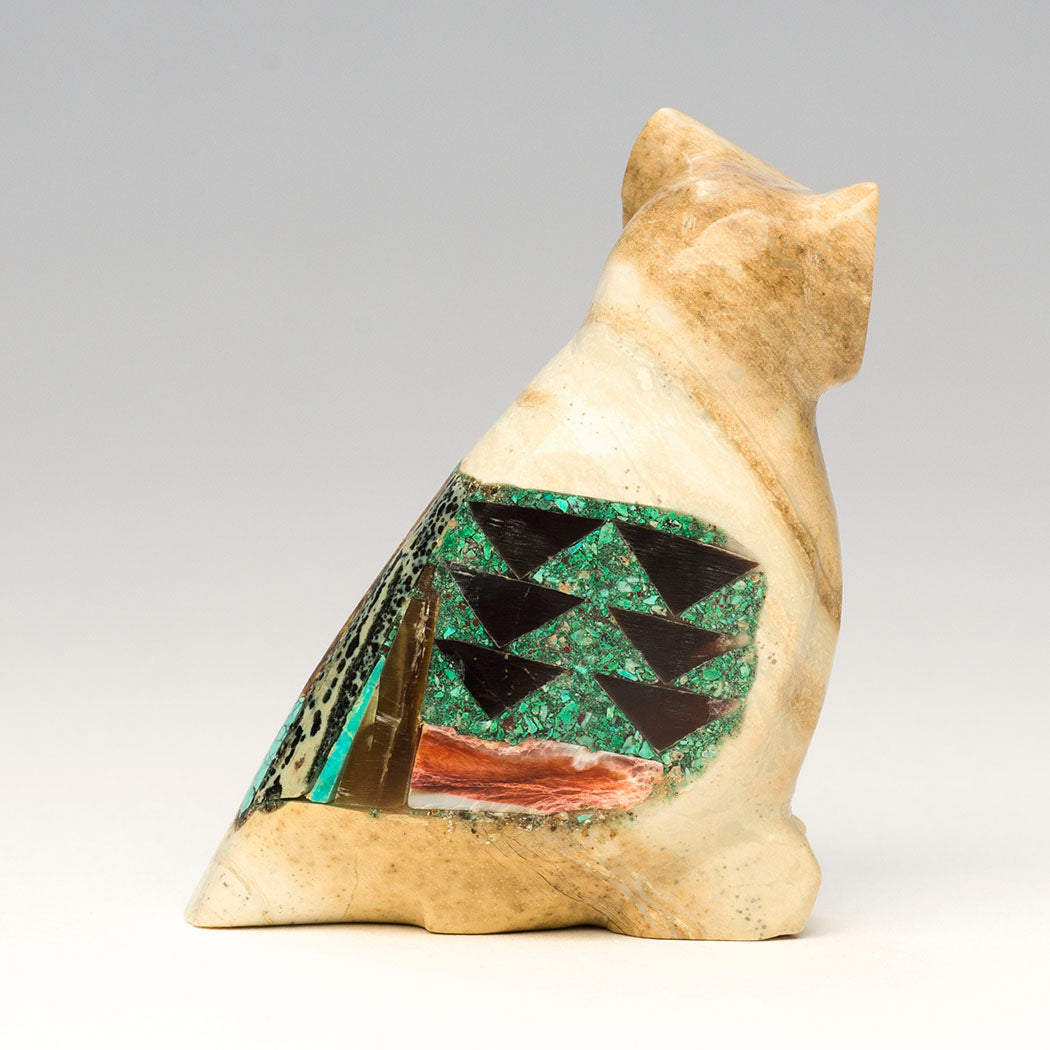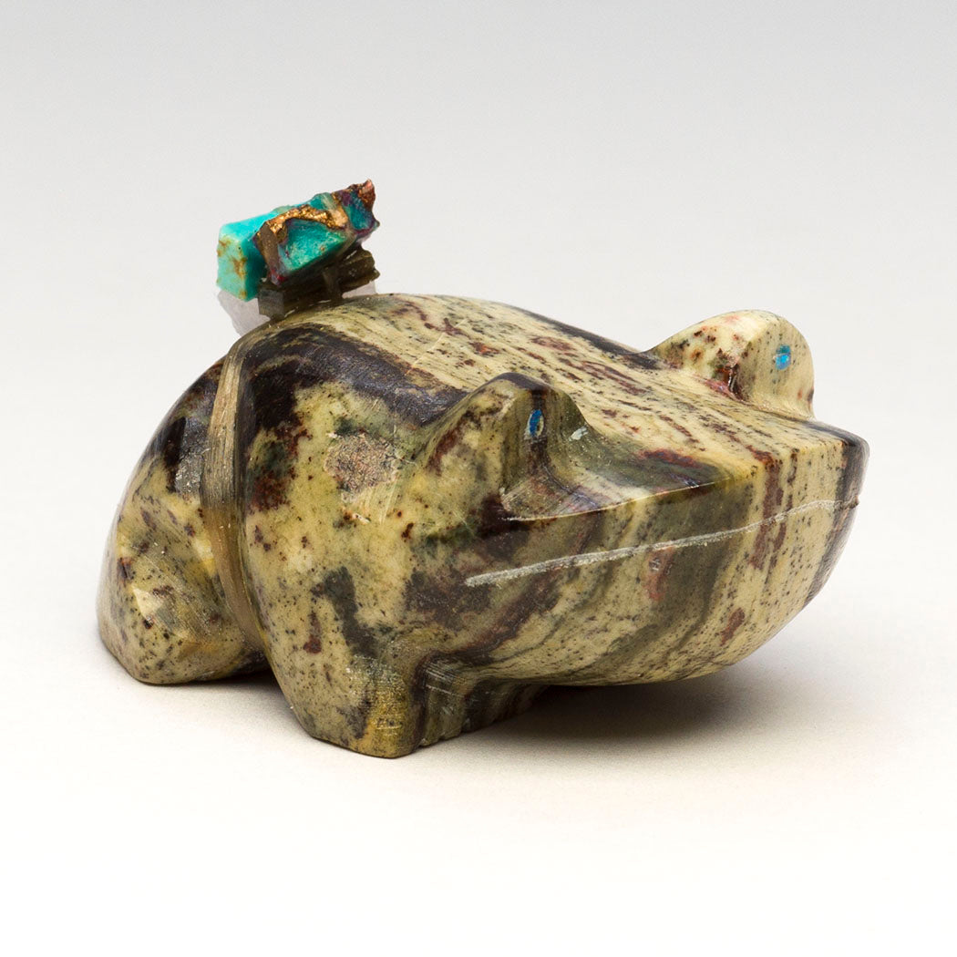 Felinae. With about 33 species, this group includes bobcats, cheetahs, ocelots, cougars and our beloved domestic house cats. Melvin Sandoval's poised wildcat as bobcats are sometimes called, is presented in an onyx with rustic colors blessing it with hunting camouflage. Fur changes color depending on the season too. Thankful for the wildcat's independent ways, Melvin secured a lovely offering bundle from a gorgeous serpentine point, bright turquoise and heishe beads. Approximately 2" long, 5/8" wide and 1 3/8" tall.