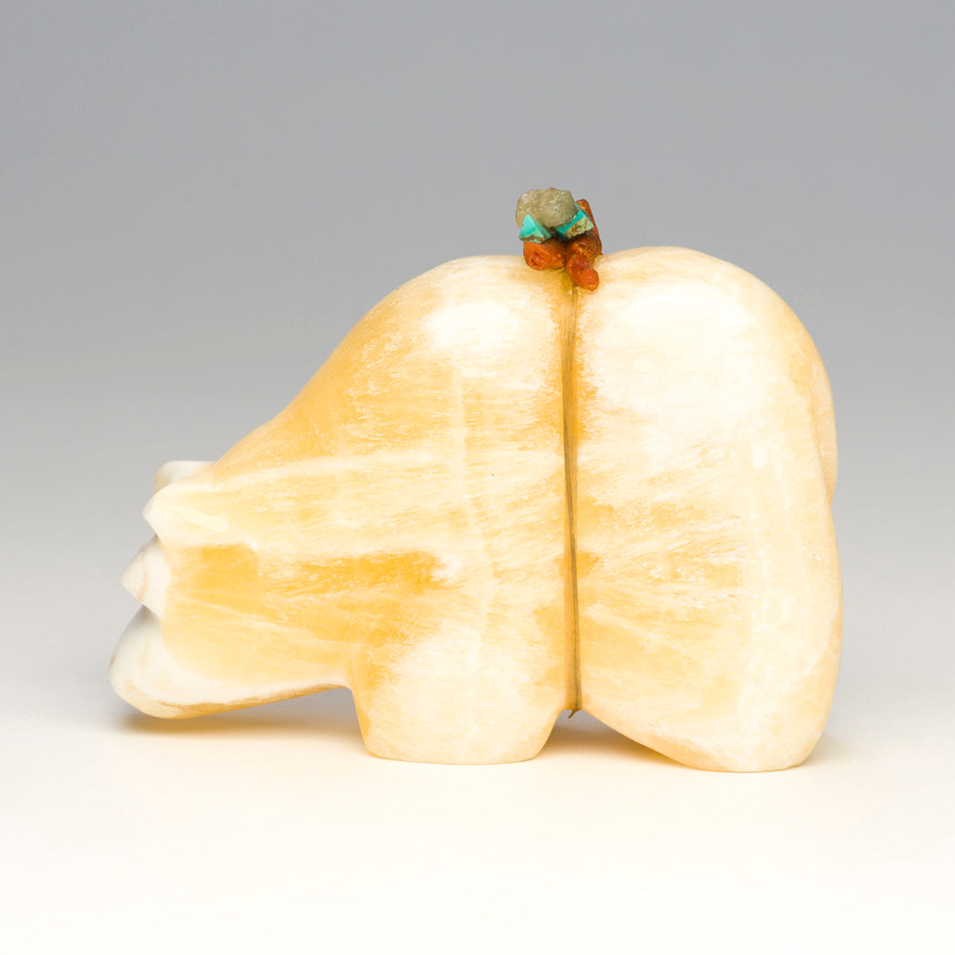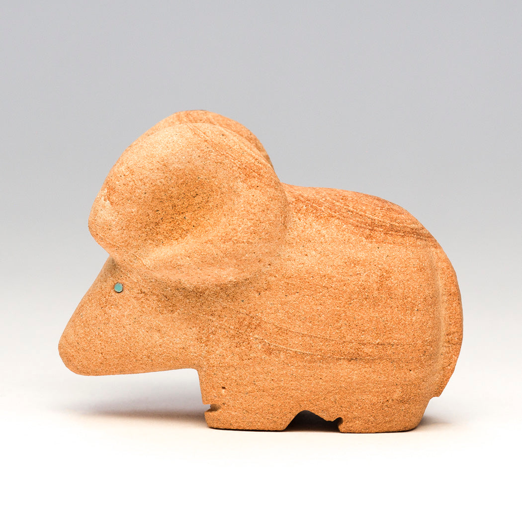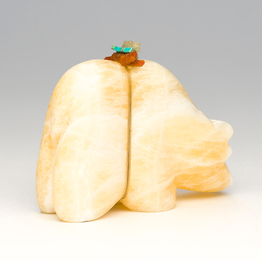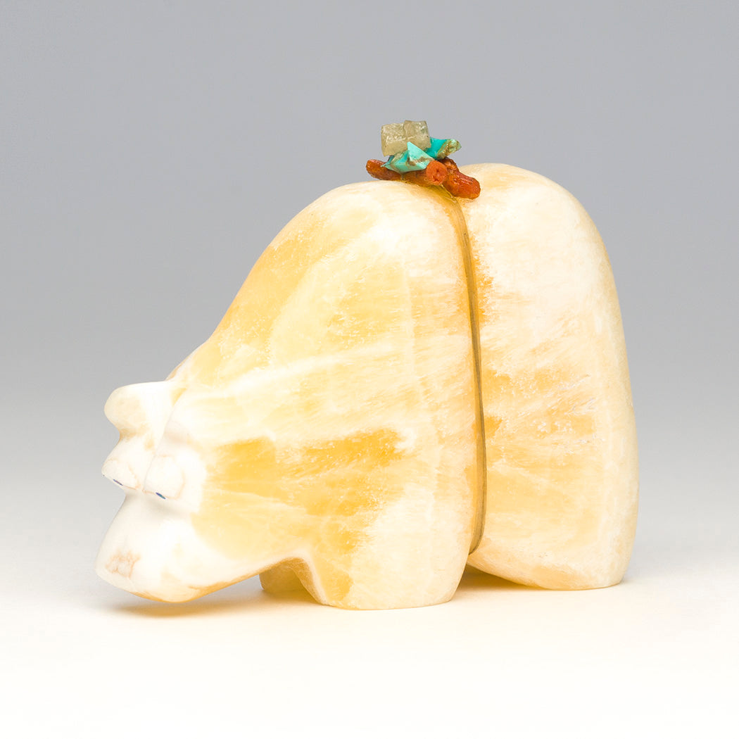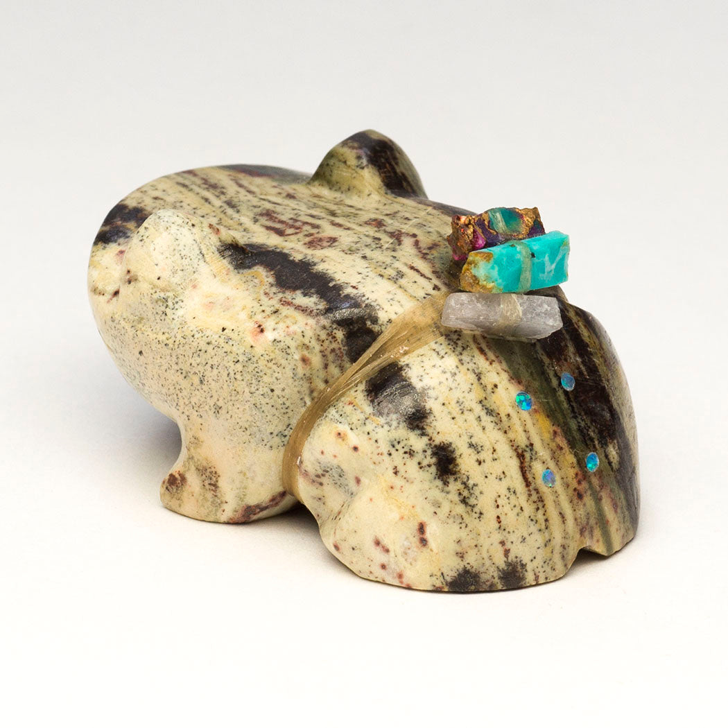 Felinae. With about 33 species, this group includes bobcats, cheetahs, ocelots, cougars and our beloved domestic house cats. Melvin Sandoval's poised wildcat as bobcats are sometimes called, is presented in an onyx with rustic colors blessing it with hunting camouflage. Fur changes color depending on the season too. Thankful for the wildcat's independent ways, Melvin secured a lovely offering bundle from a gorgeous serpentine point, bright turquoise and heishe beads. Approximately 2" long, 5/8" wide and 1 3/8" tall.