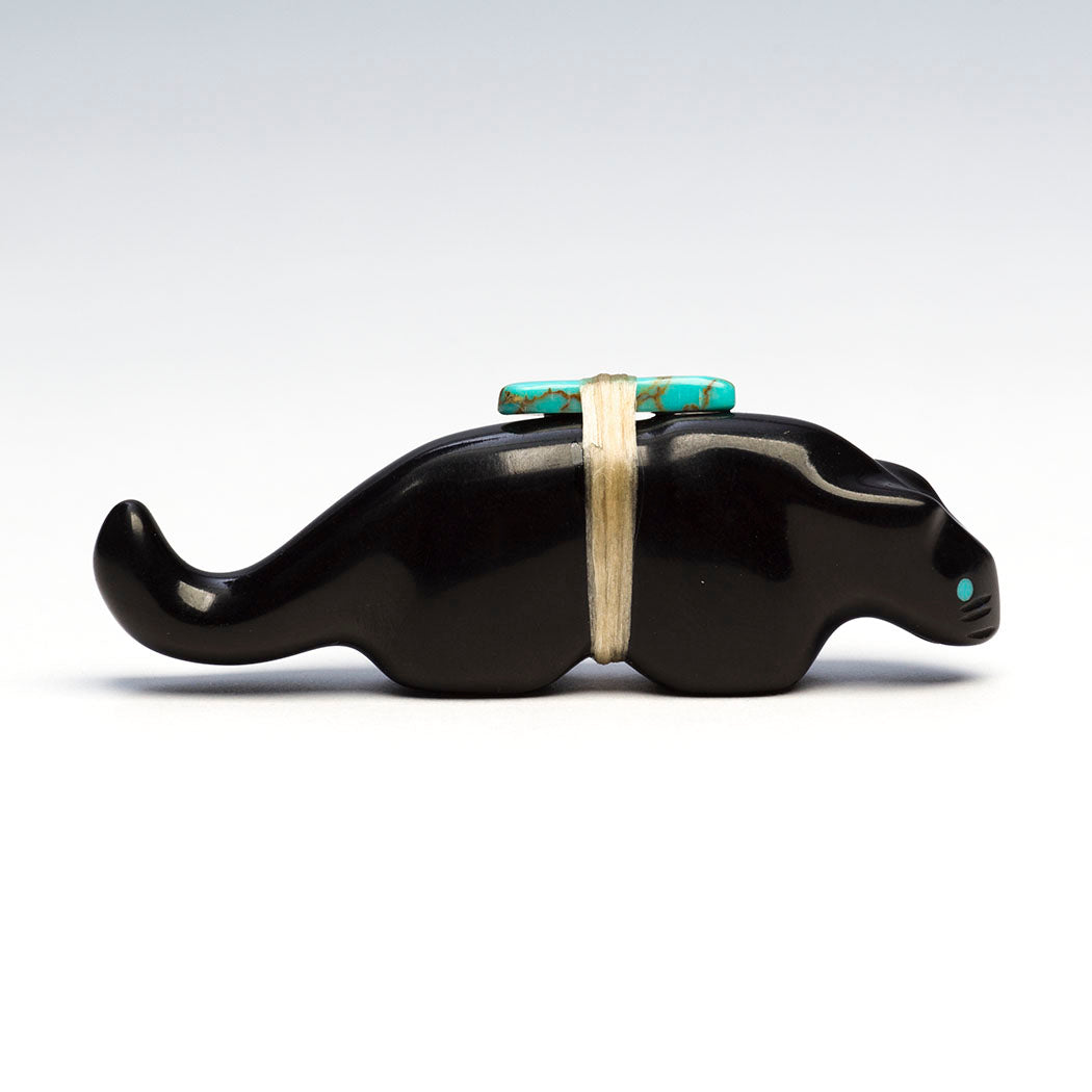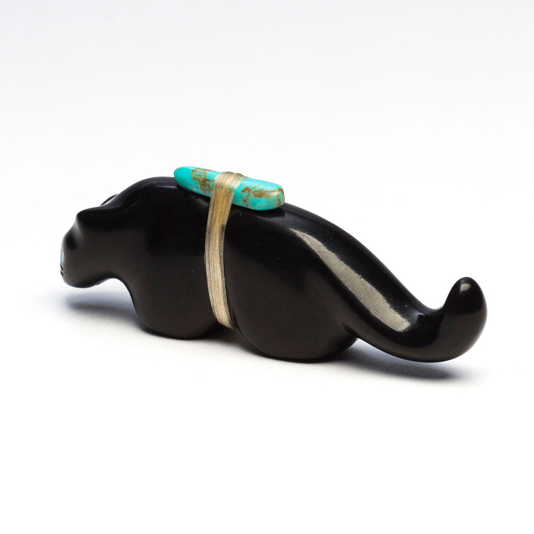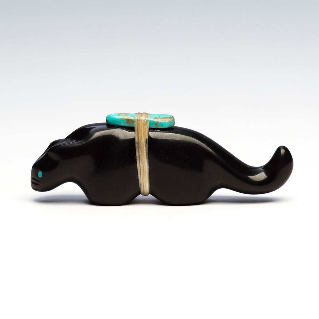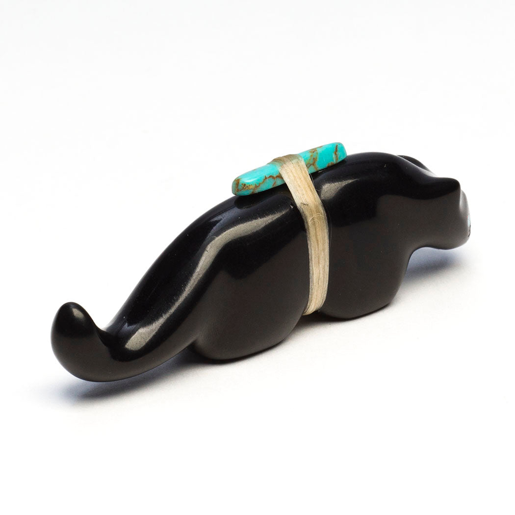 Mountain Lion (puma, leopard, panther or cougar) hunts through eyes from crushed lapis and turquoise. Because mountain lions are stealthy in nature, Zuni men will bring along a mountain lion carving for success in the hunt. For the A:Shiwi (The People) a mountain lion is the Eldest Brother and most important of the