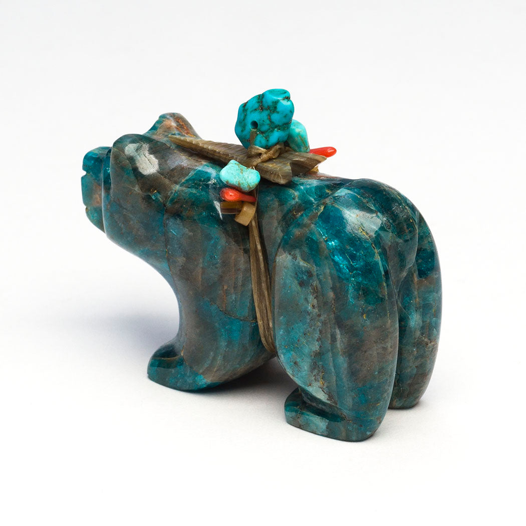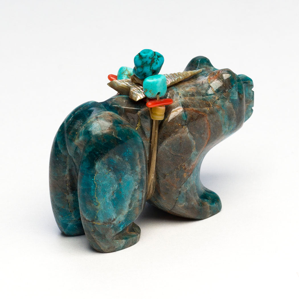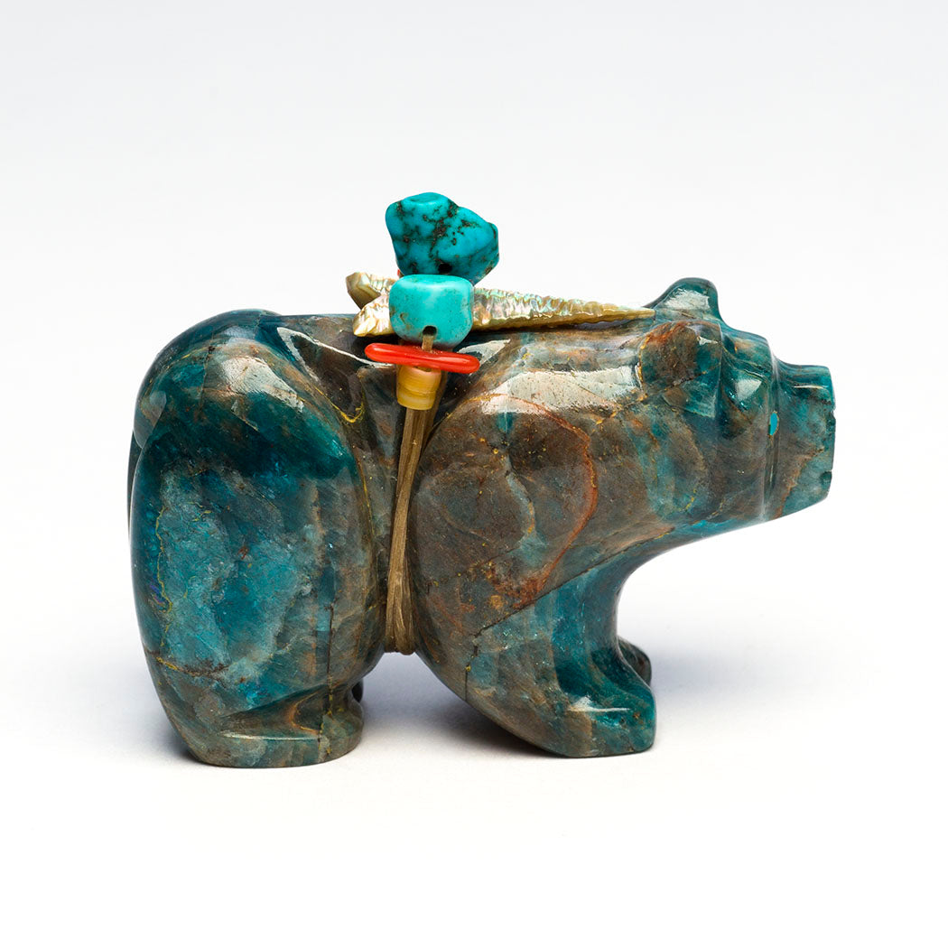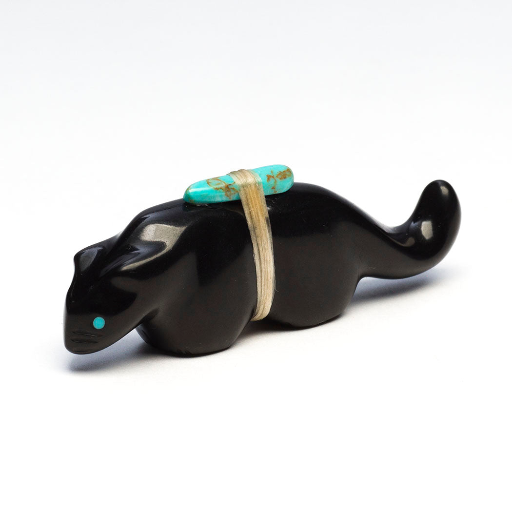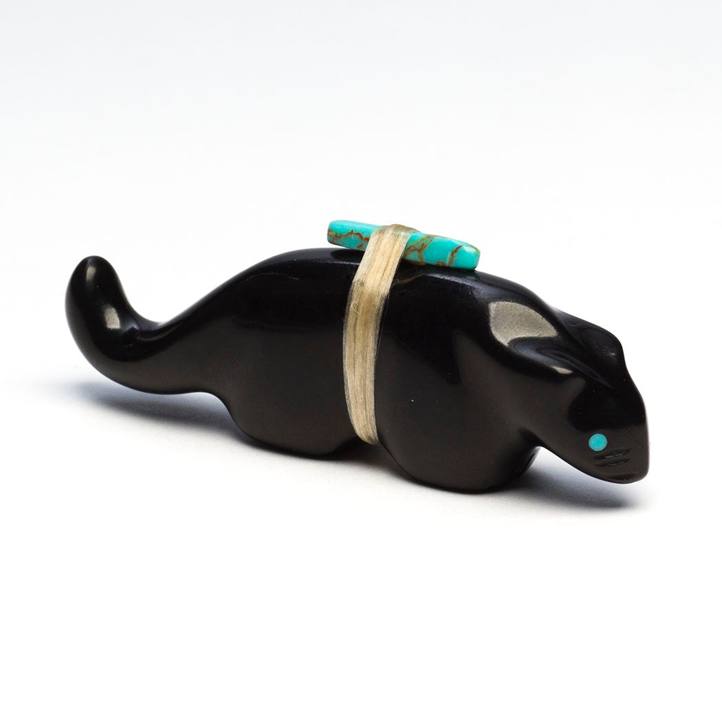 Mountain Lion (puma, leopard, panther or cougar) hunts through eyes from crushed lapis and turquoise. Because mountain lions are stealthy in nature, Zuni men will bring along a mountain lion carving for success in the hunt. For the A:Shiwi (The People) a mountain lion is the Eldest Brother and most important of the