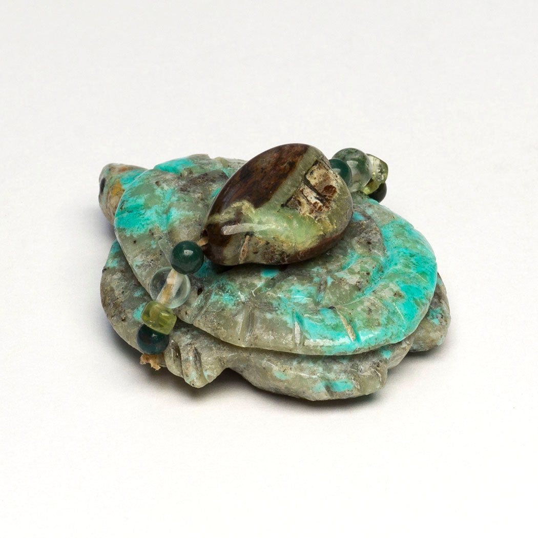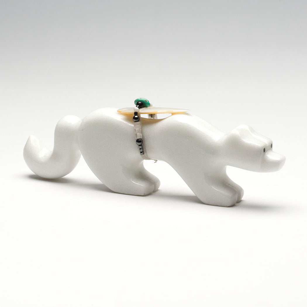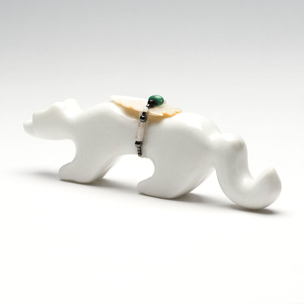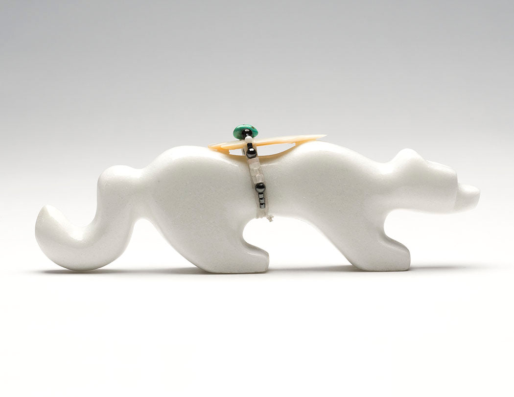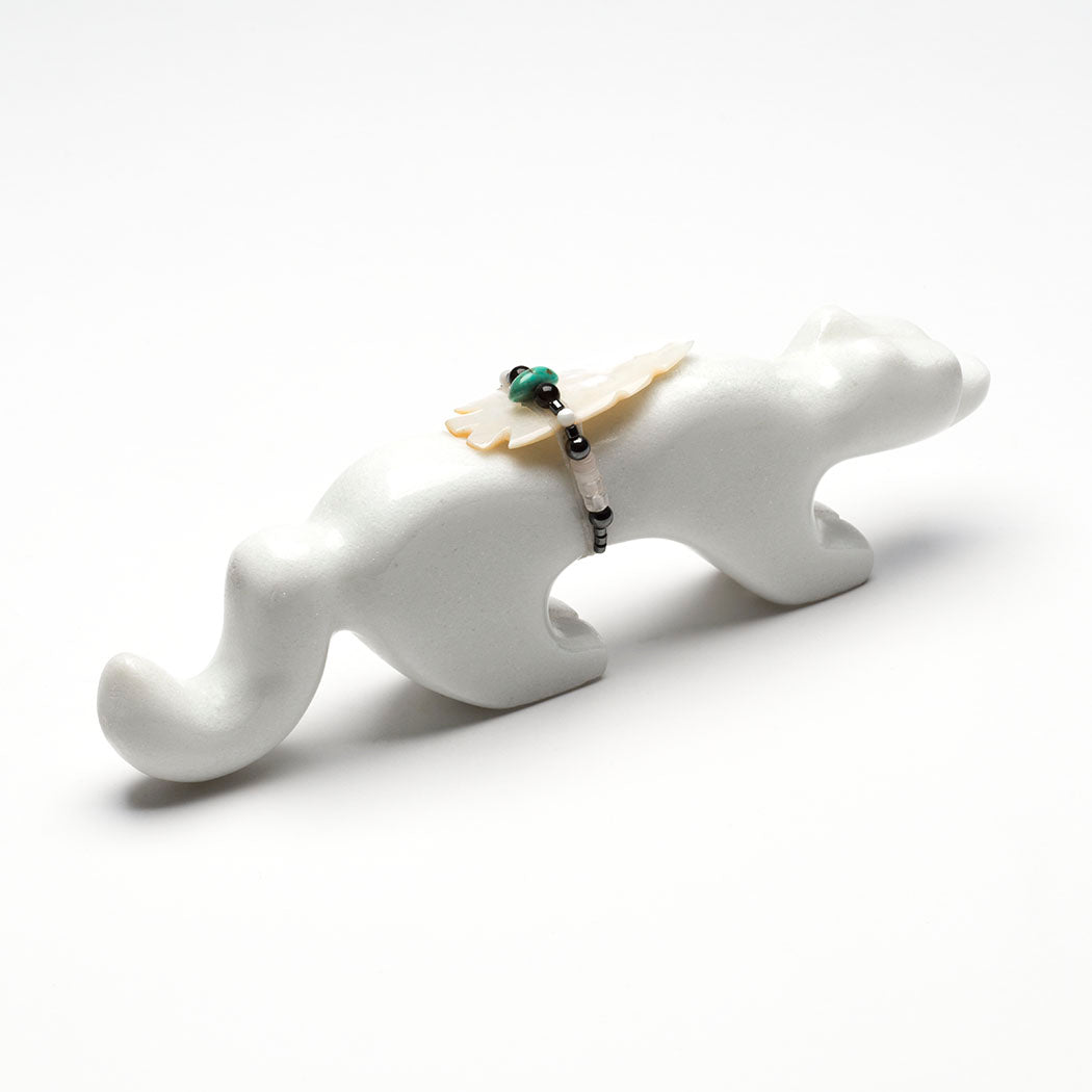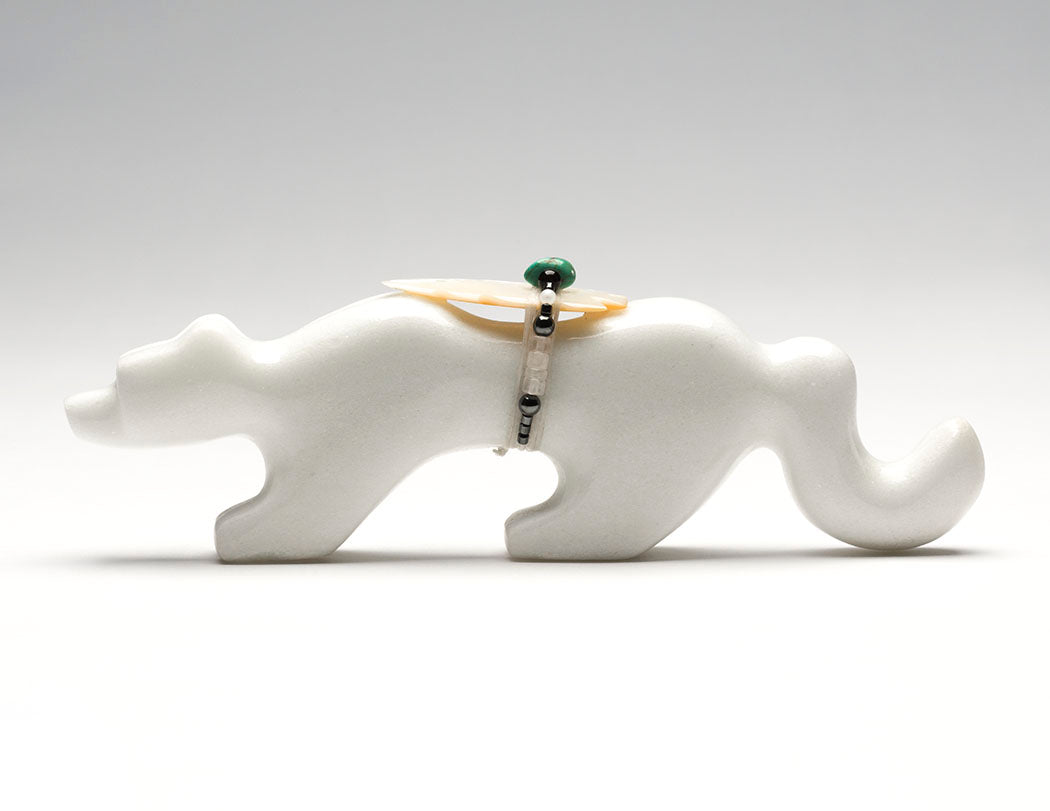 Six-Directional animals. Smoothly sculpted from sugar stone marble, measurements are nice at about 7" long, 7/8" wide and 2 3/8" tall. A lovely offering bundle contains an iridescent gold lip shell point, hematite, turquoise, selenite, tourmaline and perhaps crystal quartz beads.