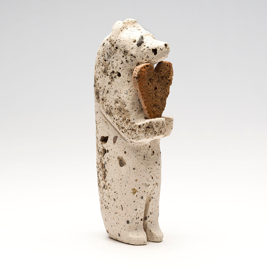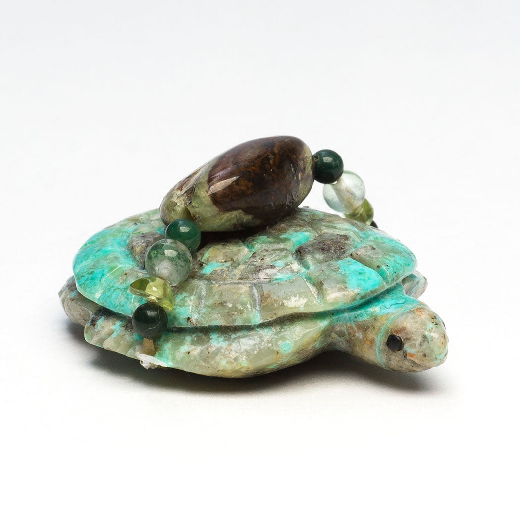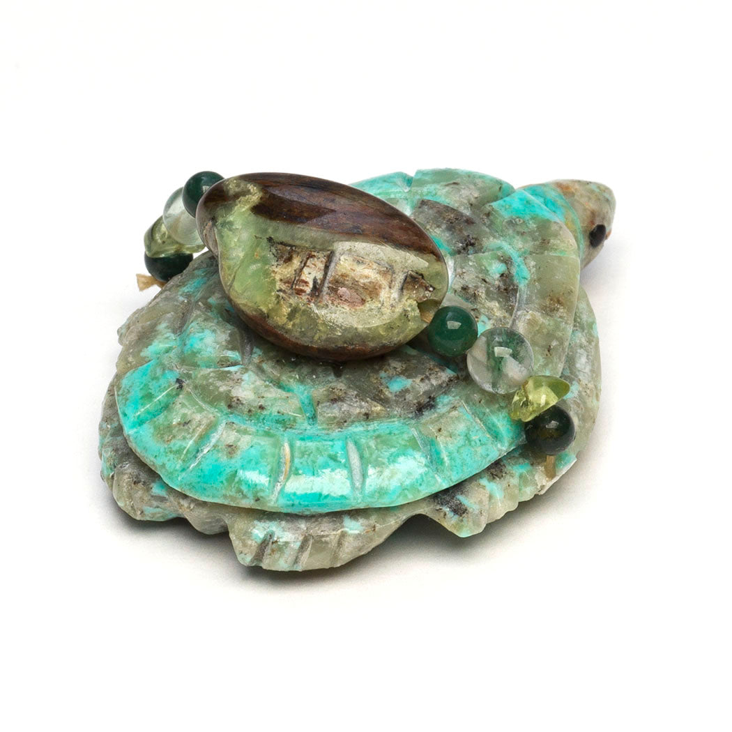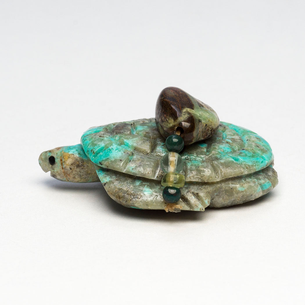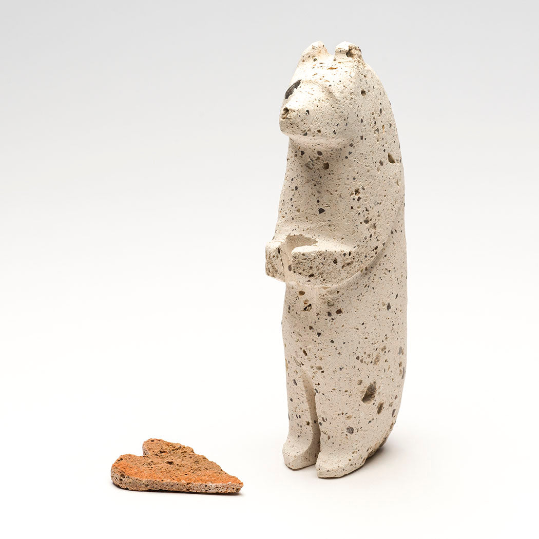 Six-Directional animals. Smoothly sculpted from sugar stone marble, measurements are nice at about 7" long, 7/8" wide and 2 3/8" tall. A lovely offering bundle contains an iridescent gold lip shell point, hematite, turquoise, selenite, tourmaline and perhaps crystal quartz beads.