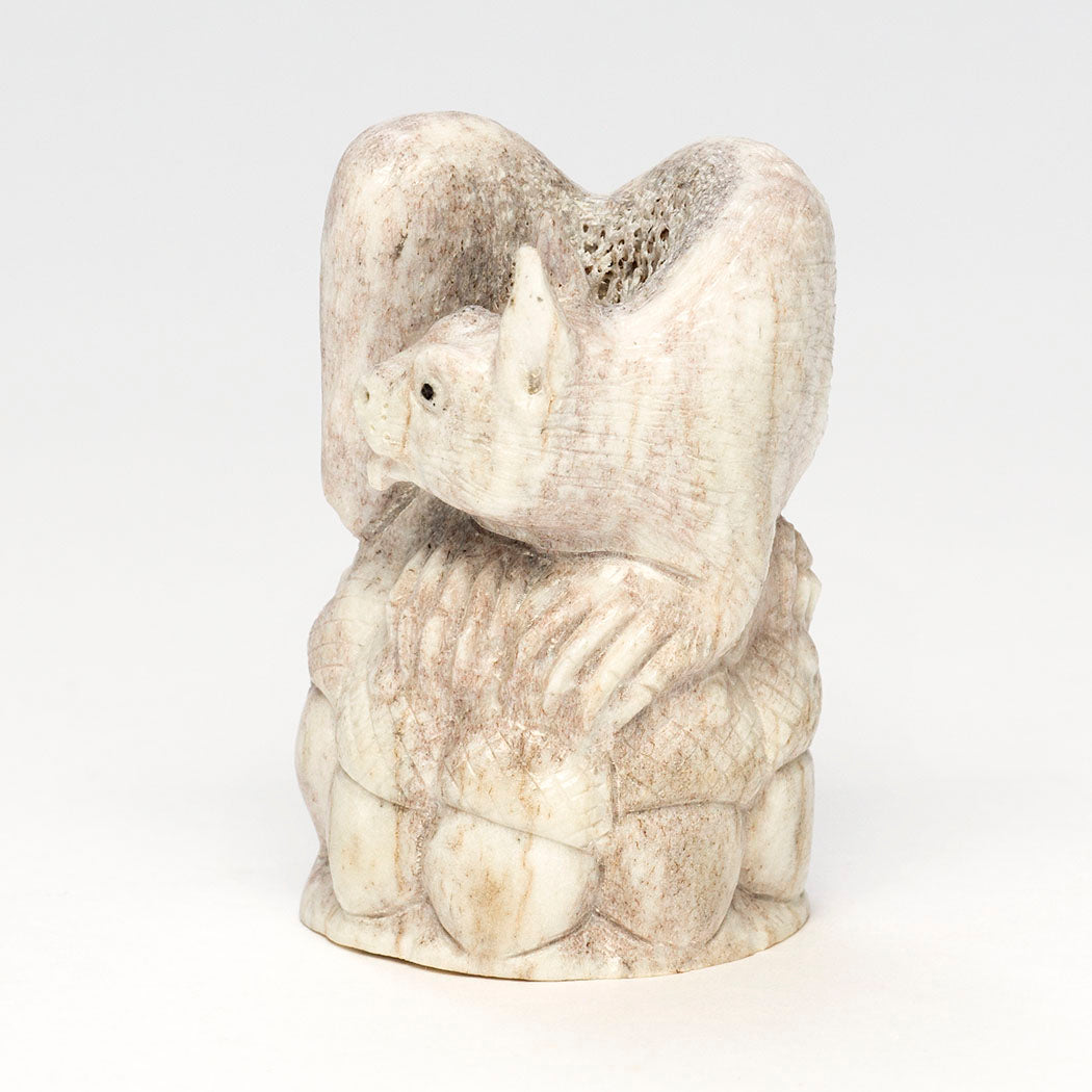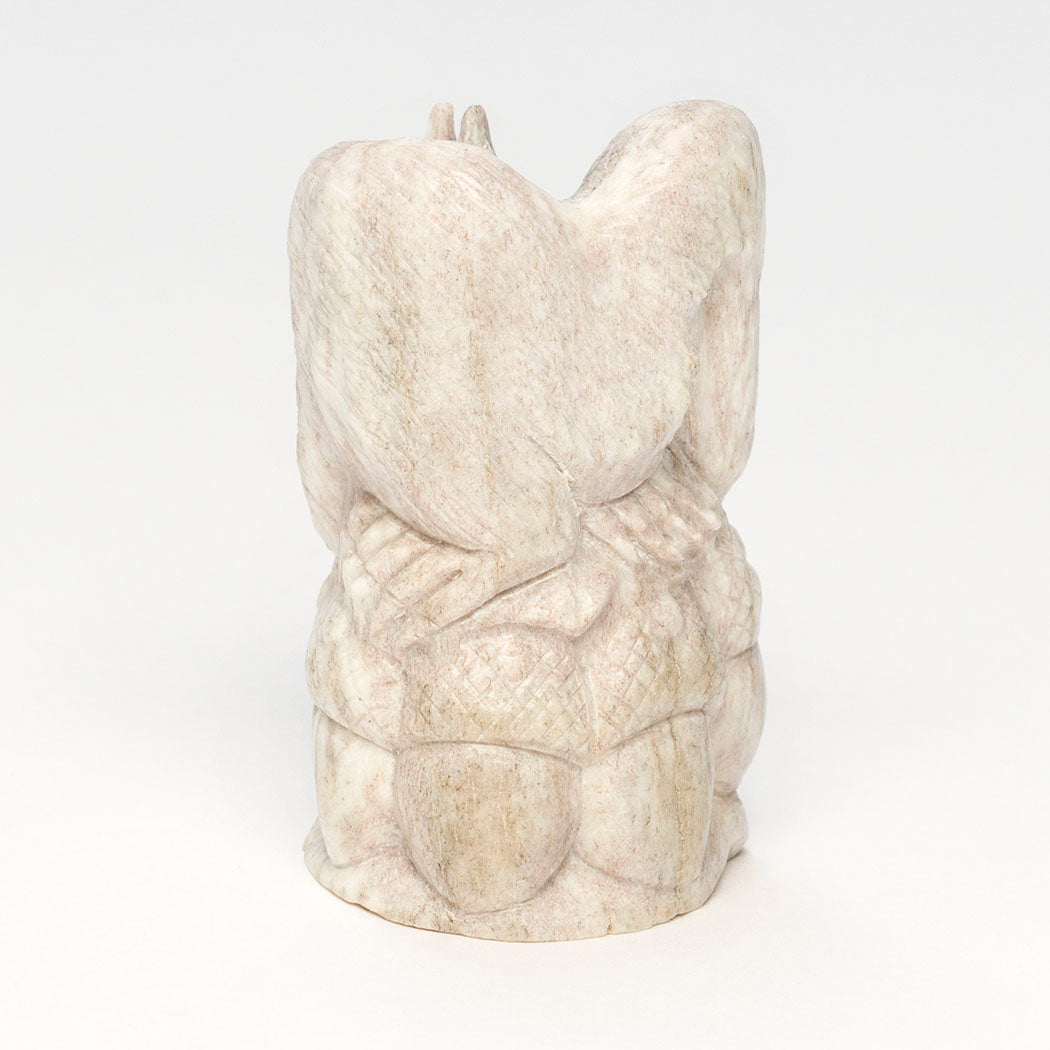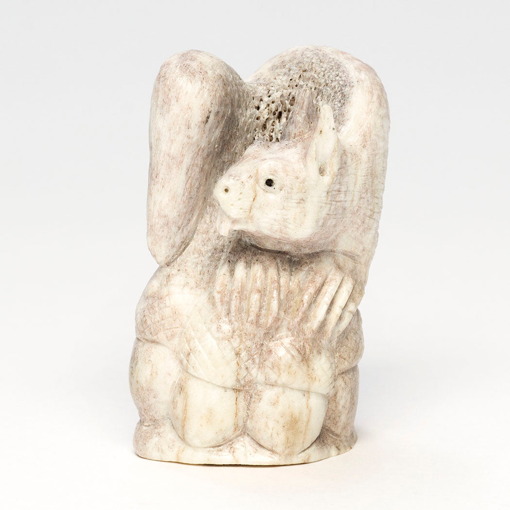 Many Indigenous cultures regard the squirrel as a resourceful creature who prepares for the future. When they stash their seeds some of them grow thereby regenerating forests. Maxx Laate's antler squirrel pauses for a moment's rest after collecting many acorns. Guarded eyes are from jet, prominent front teeth are super cute, ears listen up and long claws effortlessly dig to stash the loot. About 2 1/8" tall, 1 1/4" wide and 1 1/8" deep.