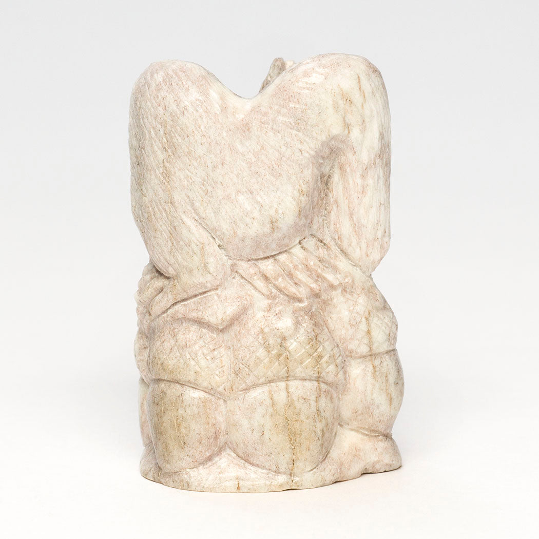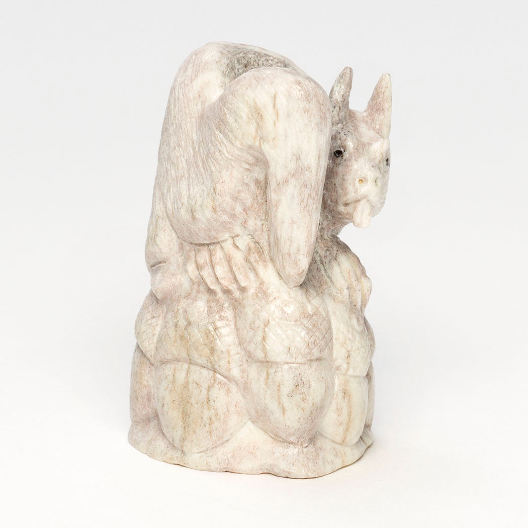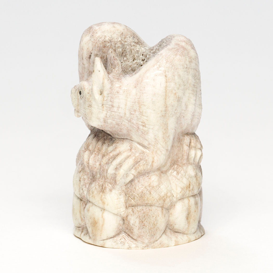 Many Indigenous cultures regard the squirrel as a resourceful creature who prepares for the future. When they stash their seeds some of them grow thereby regenerating forests. Maxx Laate's antler squirrel pauses for a moment's rest after collecting many acorns. Guarded eyes are from jet, prominent front teeth are super cute, ears listen up and long claws effortlessly dig to stash the loot. About 2 1/8" tall, 1 1/4" wide and 1 1/8" deep.