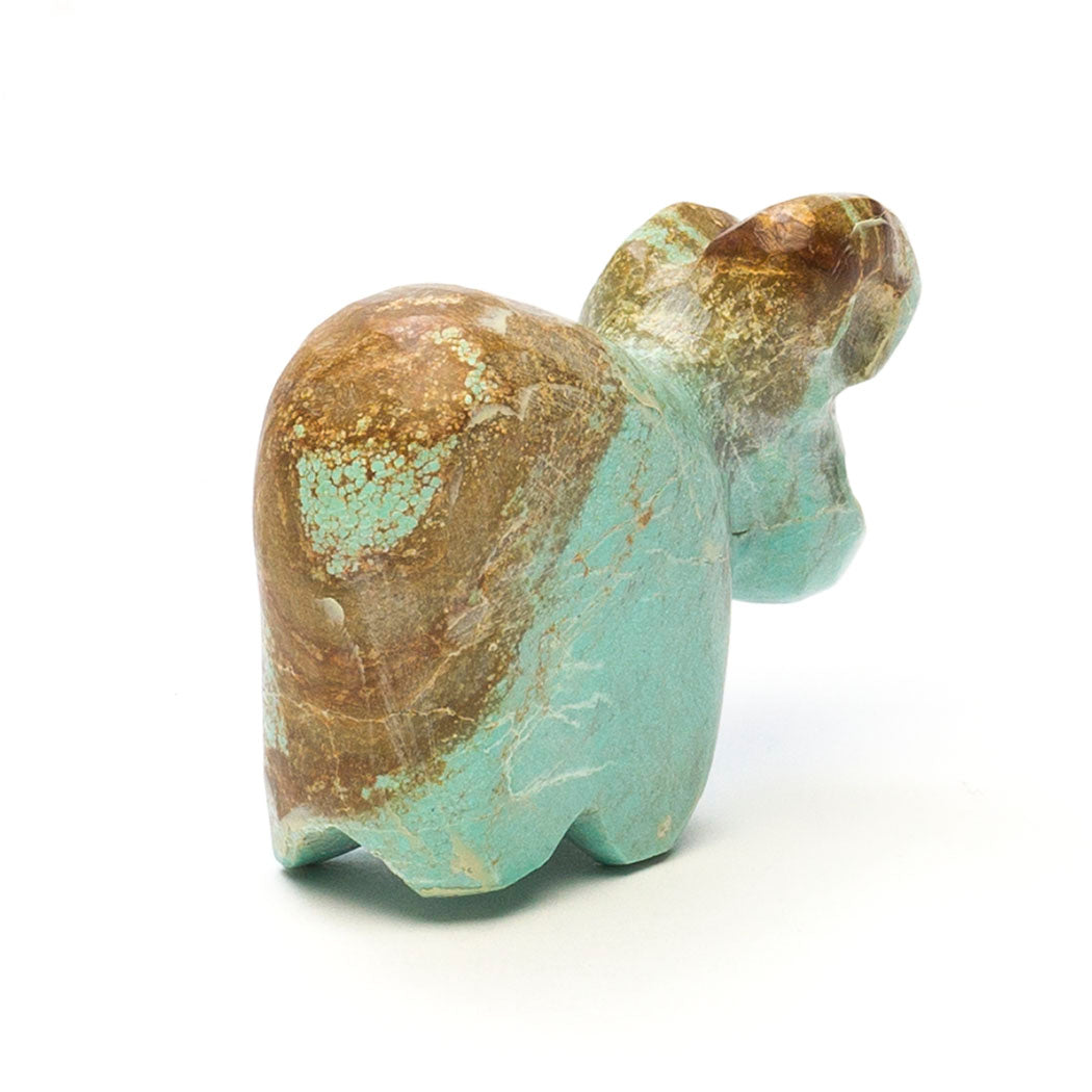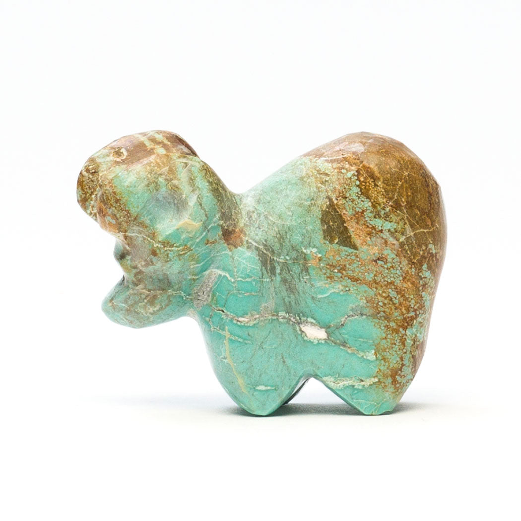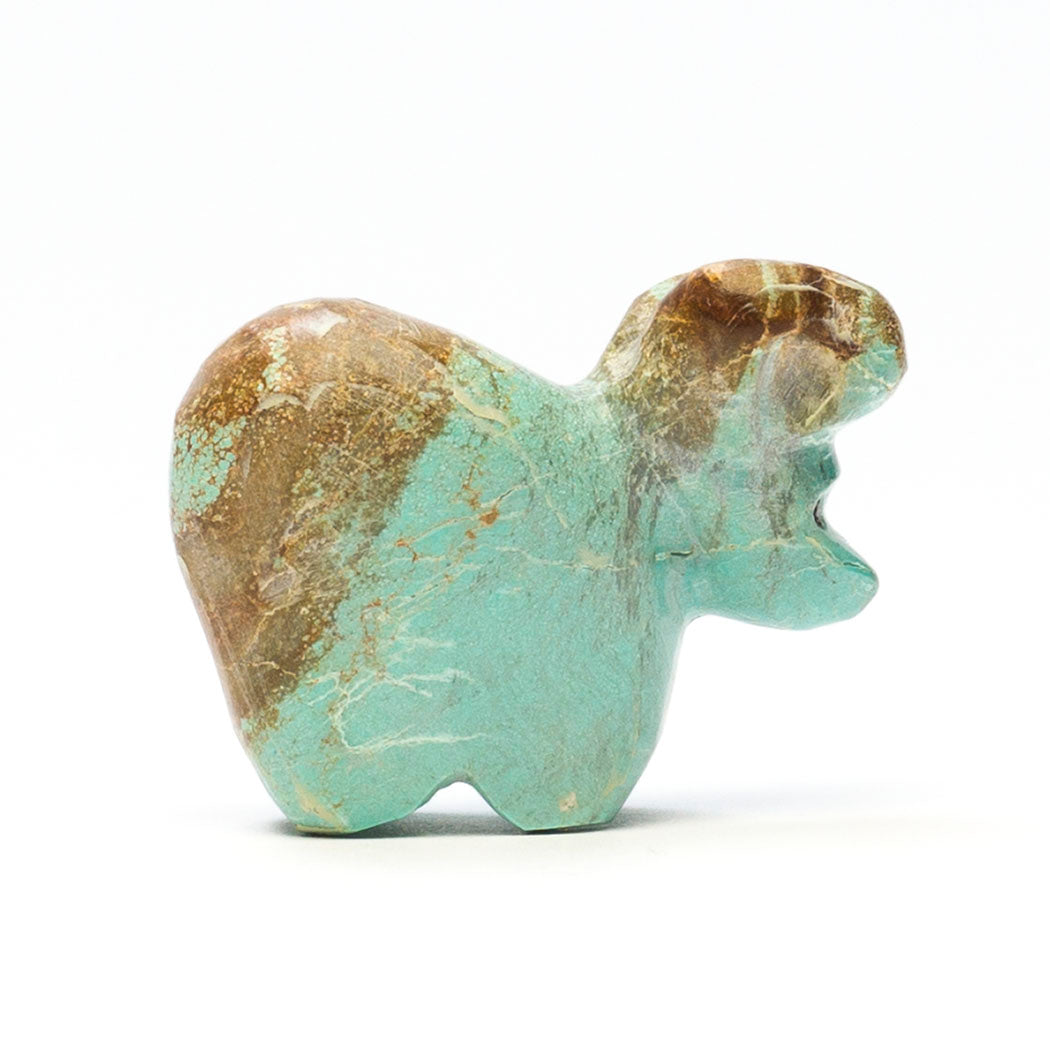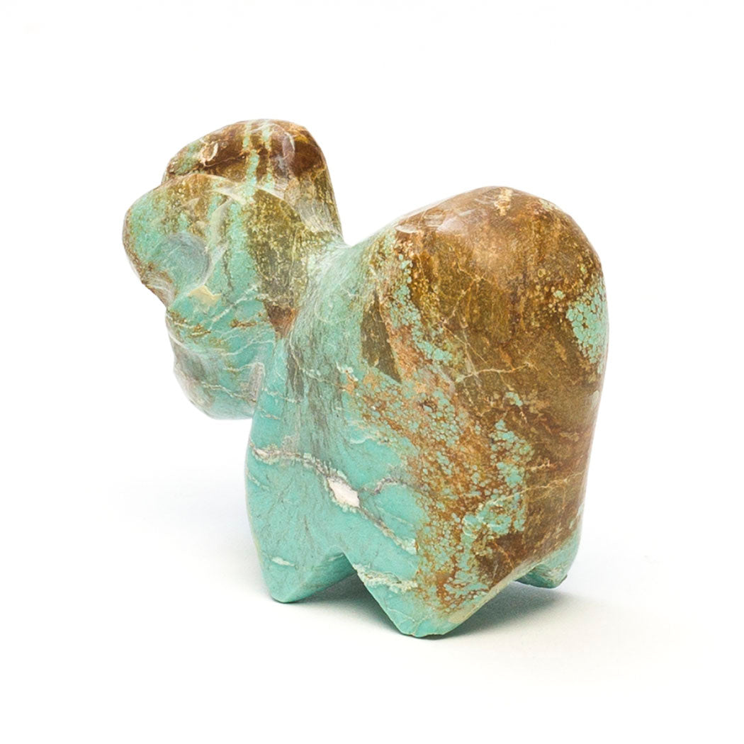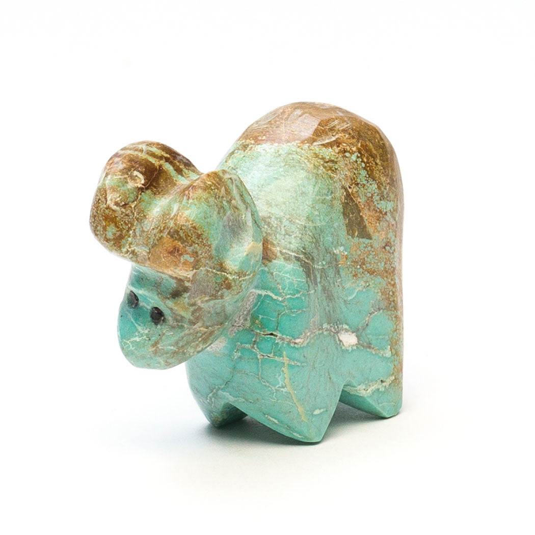 Walking down from an alpine meadow, Kyle Awelagte's young ram with jet inlaid eyes steps with ease thanks to specially designed split hooves that spread apart to grip rocks increasing stability. Lambs begin learning to climb shortly after birth, building coordination and strength. Carved from turquoise, dimensions of this precious mountain-dweller are approximately 2" long, 3/4" wide and 1 5/8" tall. When you shop keshi.com you're supporting an Indigenous artist like Kyle who sets his own wholesale prices in keeping with our mission of promoting equitable treatment of artists.