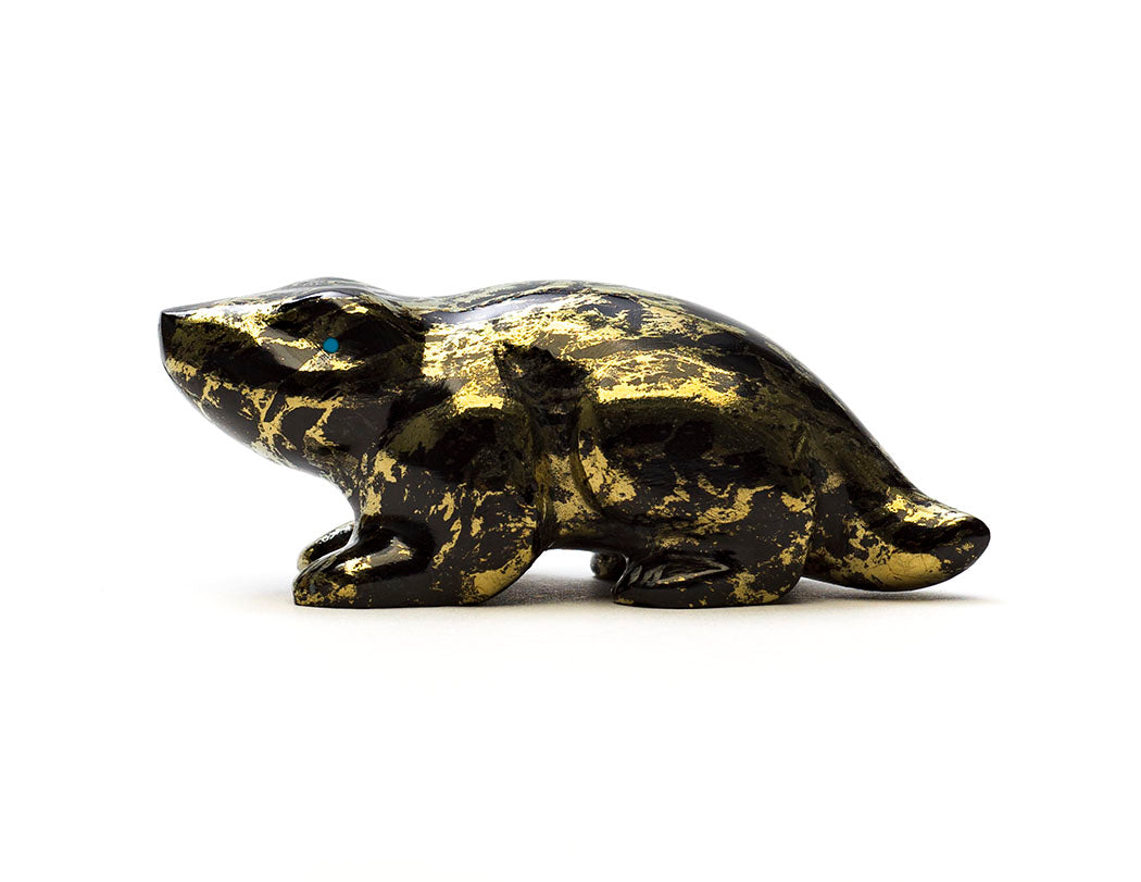 Apache Gold is the trade name for a handsome black and shiny metallic gold-like semi precious gemstone found in the United Verde Mine in Jerome, Arizona. The beautiful golden areas are pyrite. Nelson Yatsattie's turquoise-eyed Mole is sculpted from this alluring mineral said to rid the negative and usher in the positive in one's life. About 3 1/8" long, 1 1/4" wide and 1 3/8" tall.