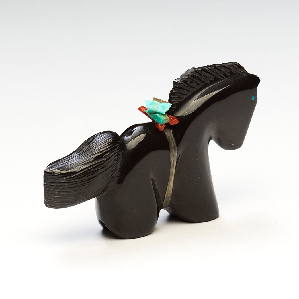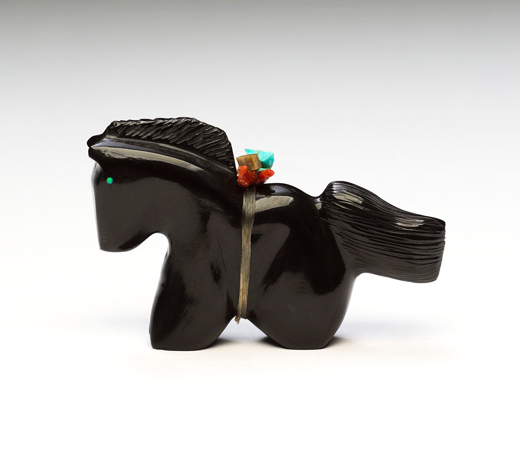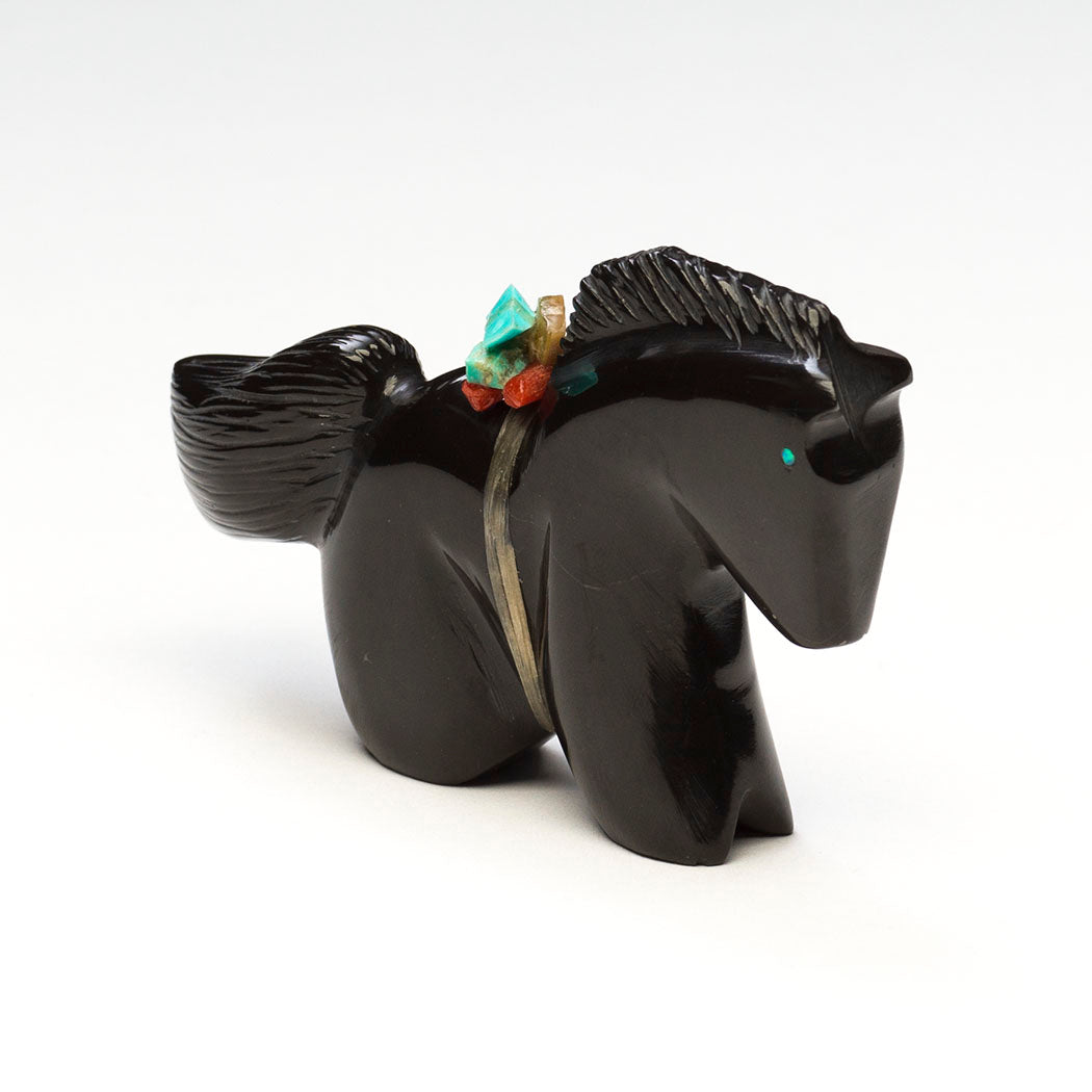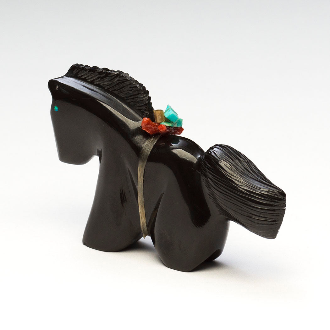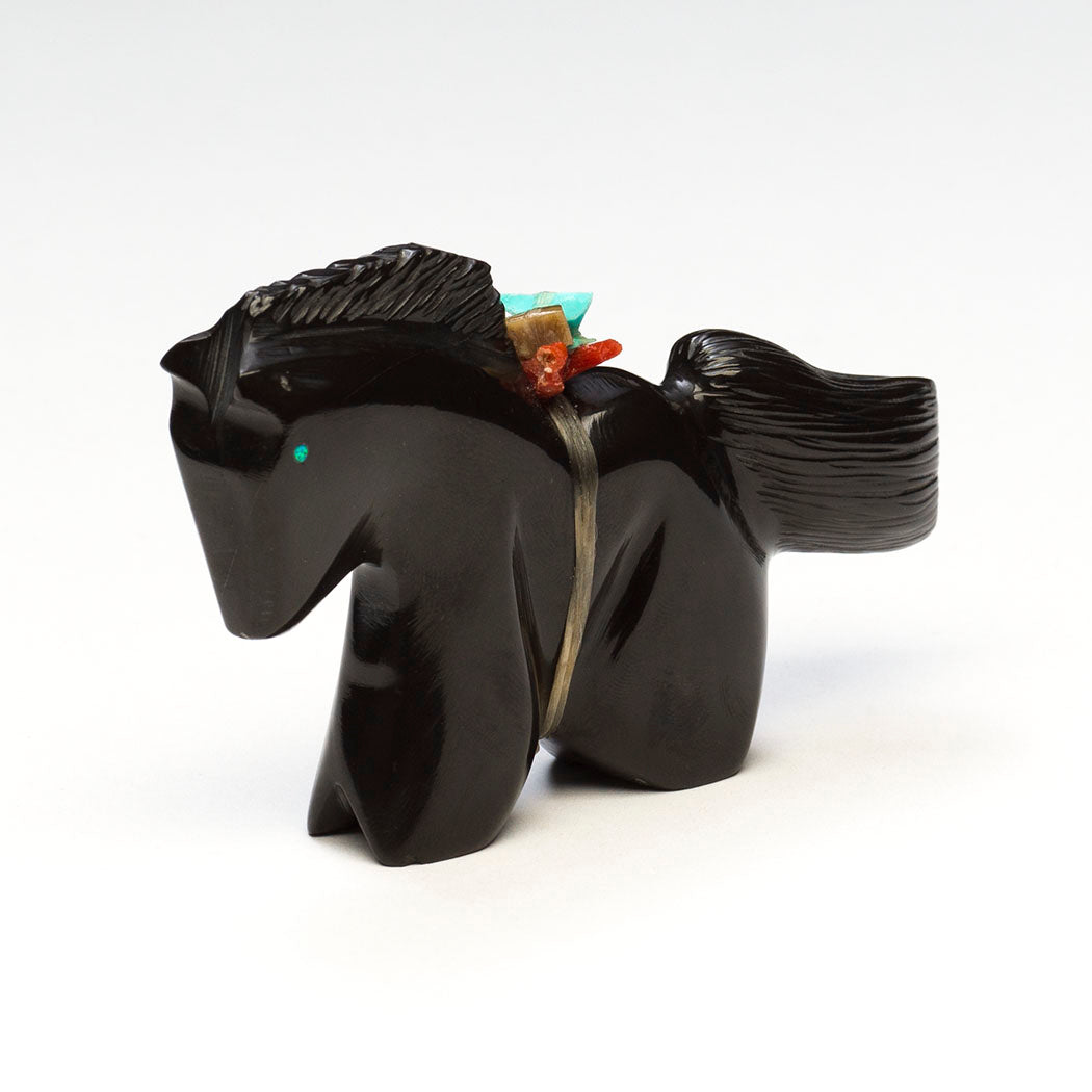 Horse lifts a voluminous tail in excitement for autumn's cooler days and less pesky flies as Mother Earth shifts from growth to a peaceful stillness. Twinkling cultured opal inlaid eyes stand out in the well-polished black marble specimen. A lovely mane and attentive ears express this equine's pure joy. About 3 1/2" long, 5/8" wide and 2 1/8" tall.