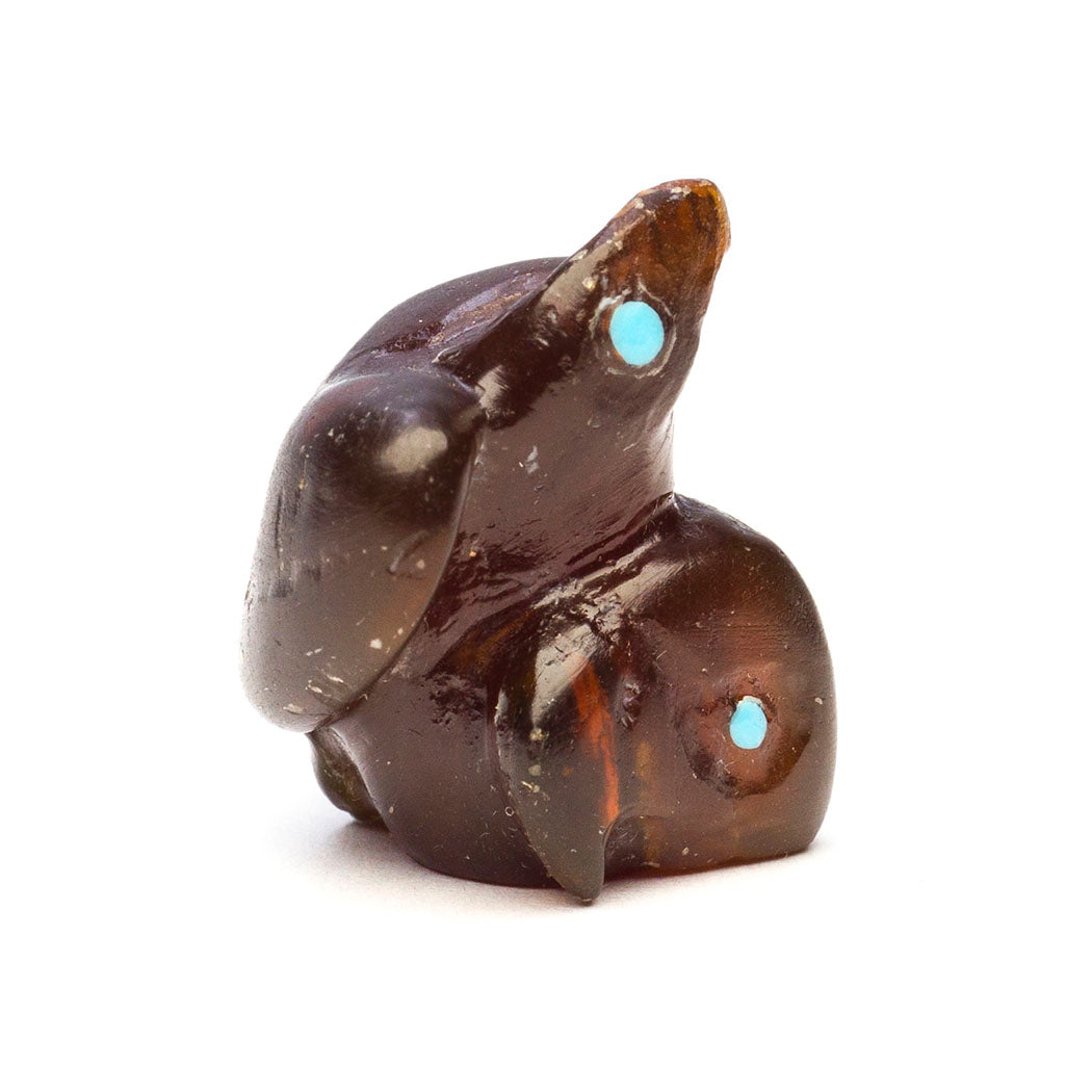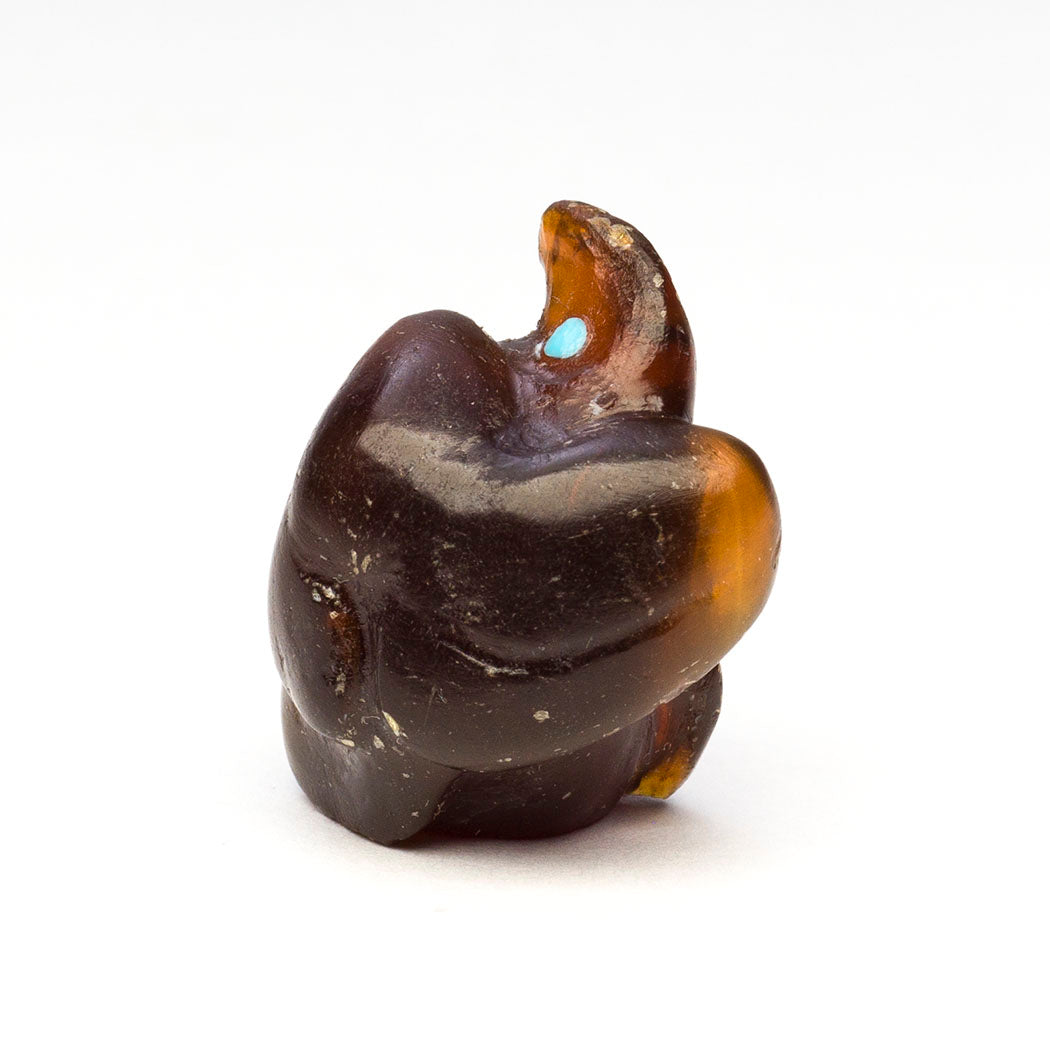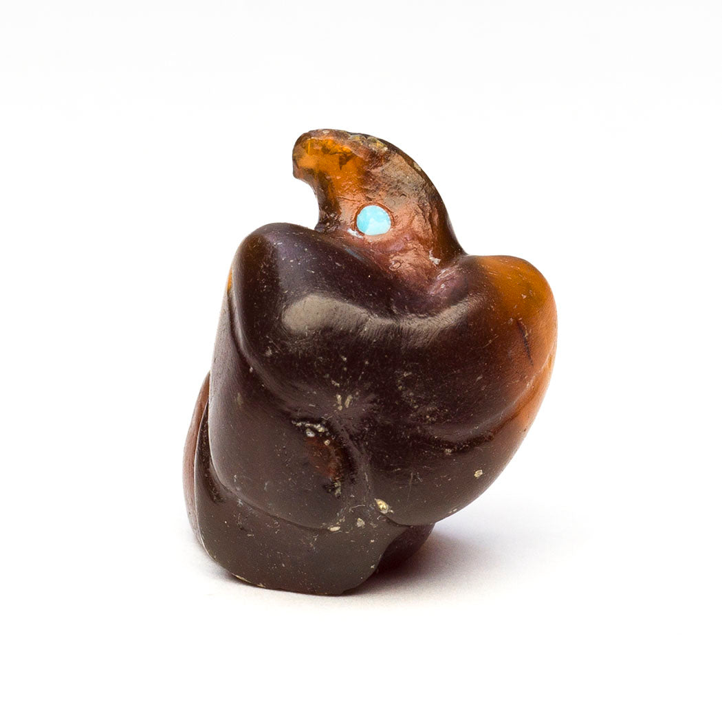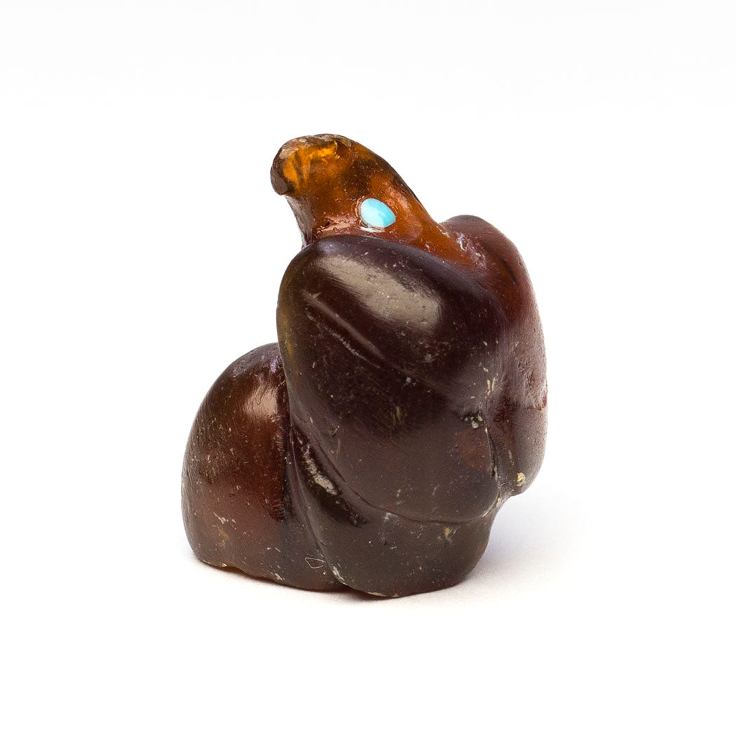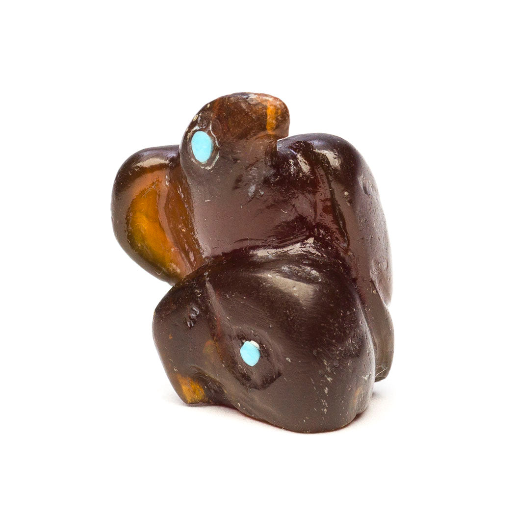 An Eagle's (or Hawk's) animal medicine is about seeing our role in this world beyond the four walls of our homes. Perhaps we can reach out and lend a hand through volunteer work, helping an elderly neighbor in need or a mentorship. Maxx Laate's eaglet perches on the parent's head representing unity and reciprocity. Their eyes are from sky blue turquoise inlays. A small raptor pairing from golden amber measuring roughly 3/4" long, 3/4" wide and 7/8" tall.