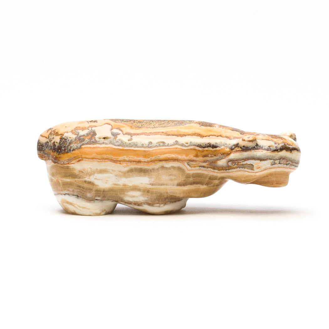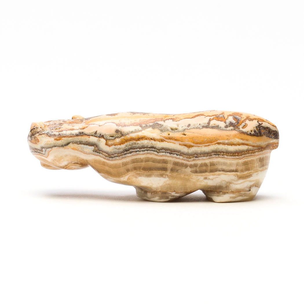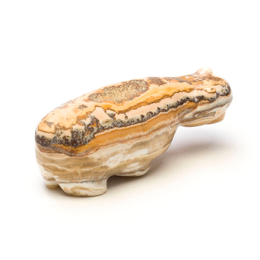 Melvin Sandoval's fabulous Bear has been sculpted from a gorgeous onyx whose golden tan layers resemble a dreamy desert landscape. The smooth glossy polish is lovely. The mineral hosts a natural, almost thumb-sized indentation on the back region which would work beautifully as a worry stone or a place for a small offering. About 3" long, 1 1/4" wide and 1 1/4" tall.