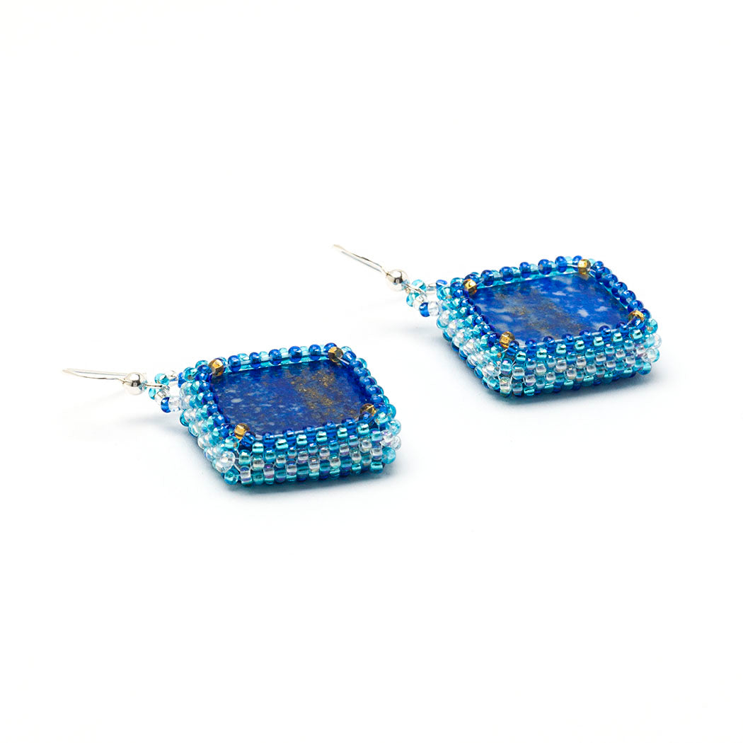We are happy to welcome Jasmin Hustito to Keshi's website. Her father is noted stone carver Clive Hustito. Handmade with lapis lazuli cabochons and exquisite beadwork are a pair of exciting dangle earrings. The stunning stones are rich in cerulean hues. Many cultures associate the color blue with heavenly realms and even immortality. Streaks of sparkling pyrite can be seen in them. Including the silver hooks, measurements of these heavyweight earrings are about 1 3/4" long, 1 1/4" wide and 3/8" deep.