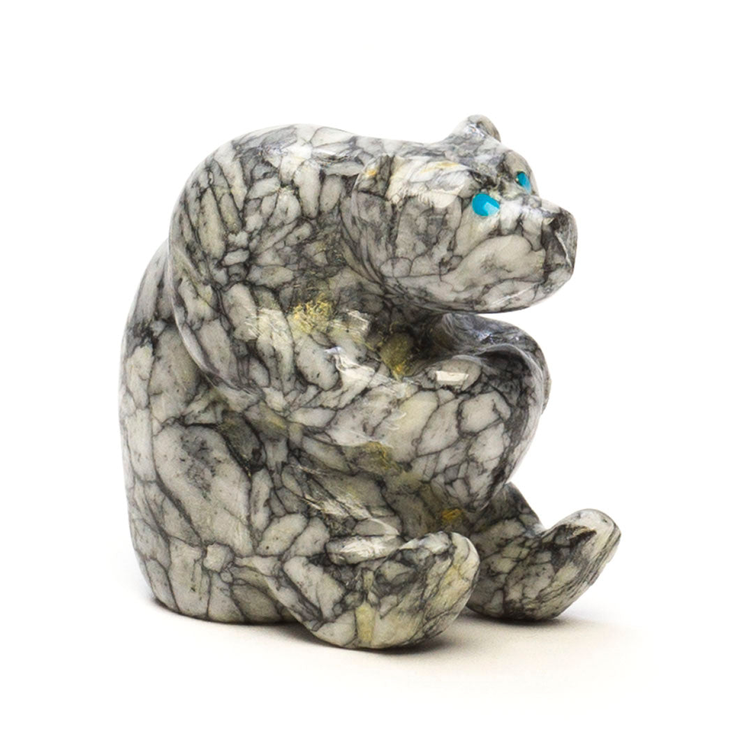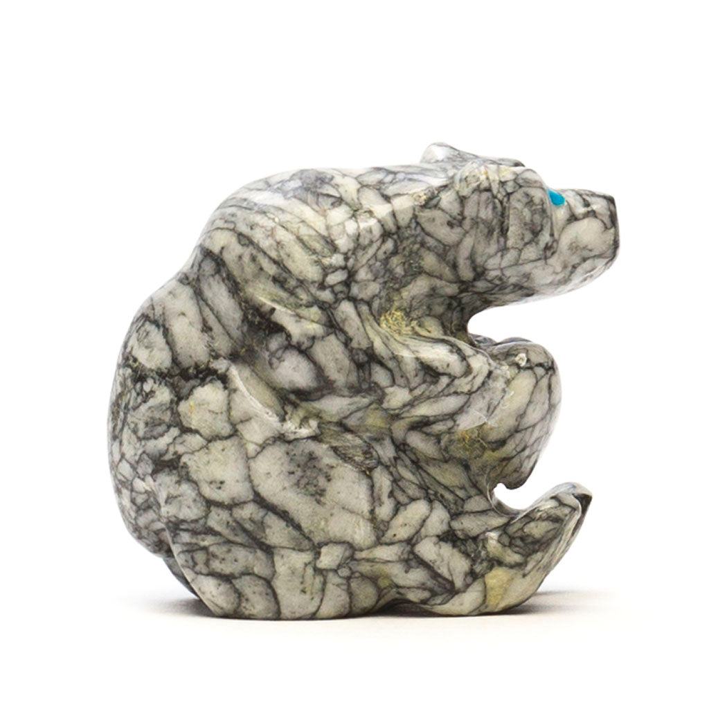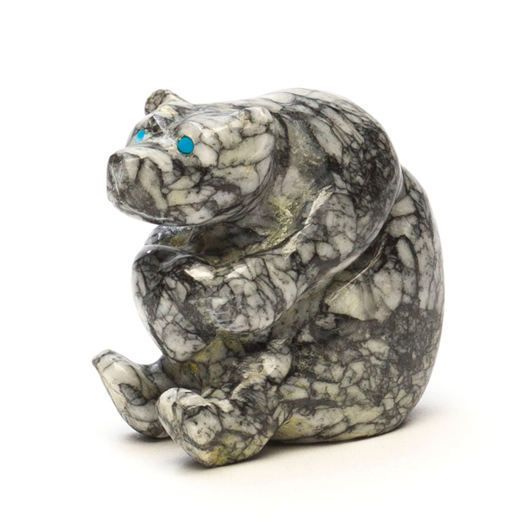 Nelson Yatsattie's best friend Bear offers a plump heart to say I'm always thinking of you. The sweet husky bear and heart are wonderfully hewn from one portion of Pinolith stone, an intriguing semi-precious material found in Austria, Spain and Canada. It's named for the appearance of gorgeous magnesite, dolomite and graphite inclusions that look like little pine kernels. The cutest eyes are from turquoise inlays set to a great face in this approximately 1 3/4" long, 7/8" wide and 1 5/8" tall collectible carving.