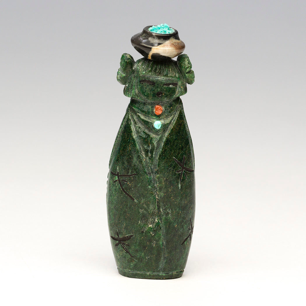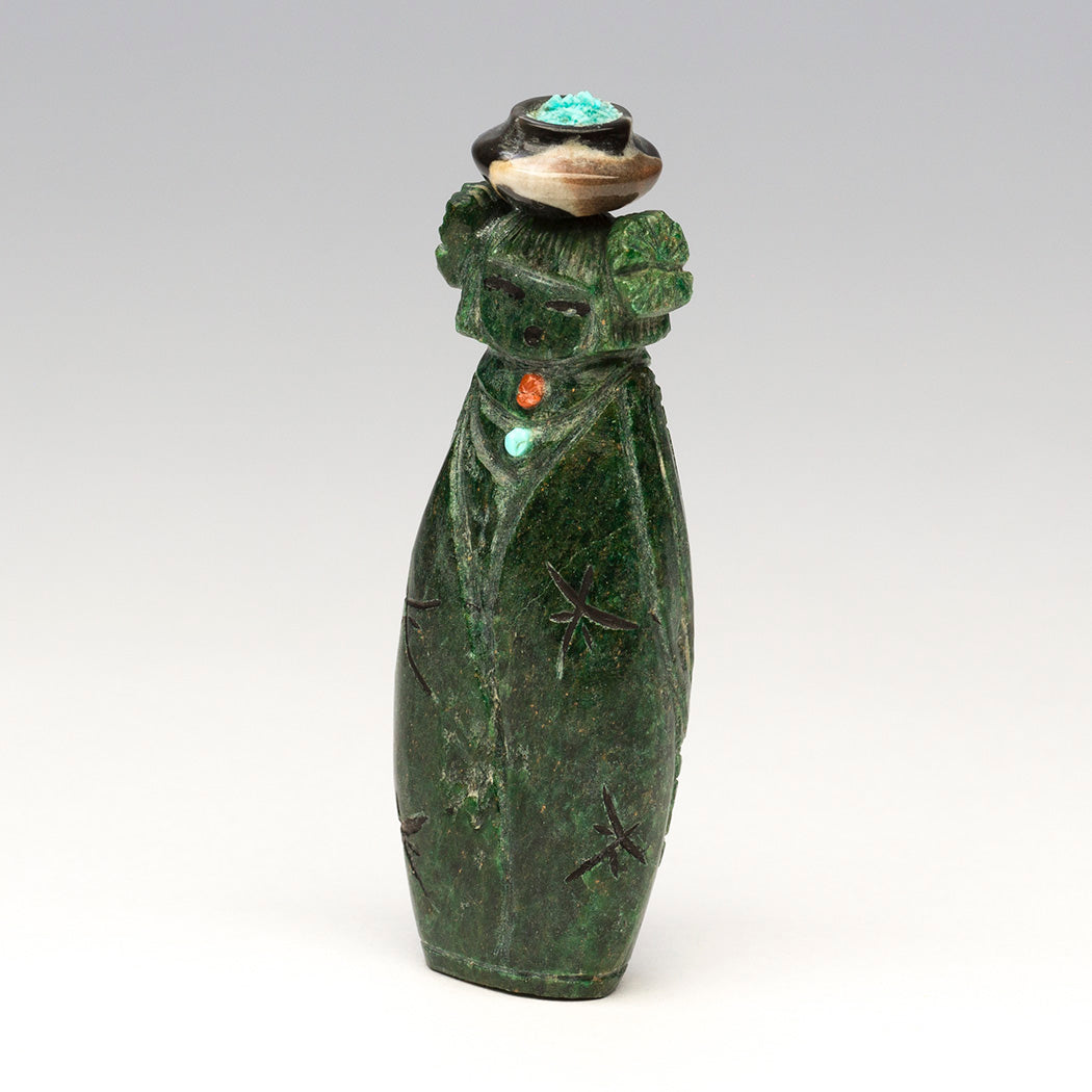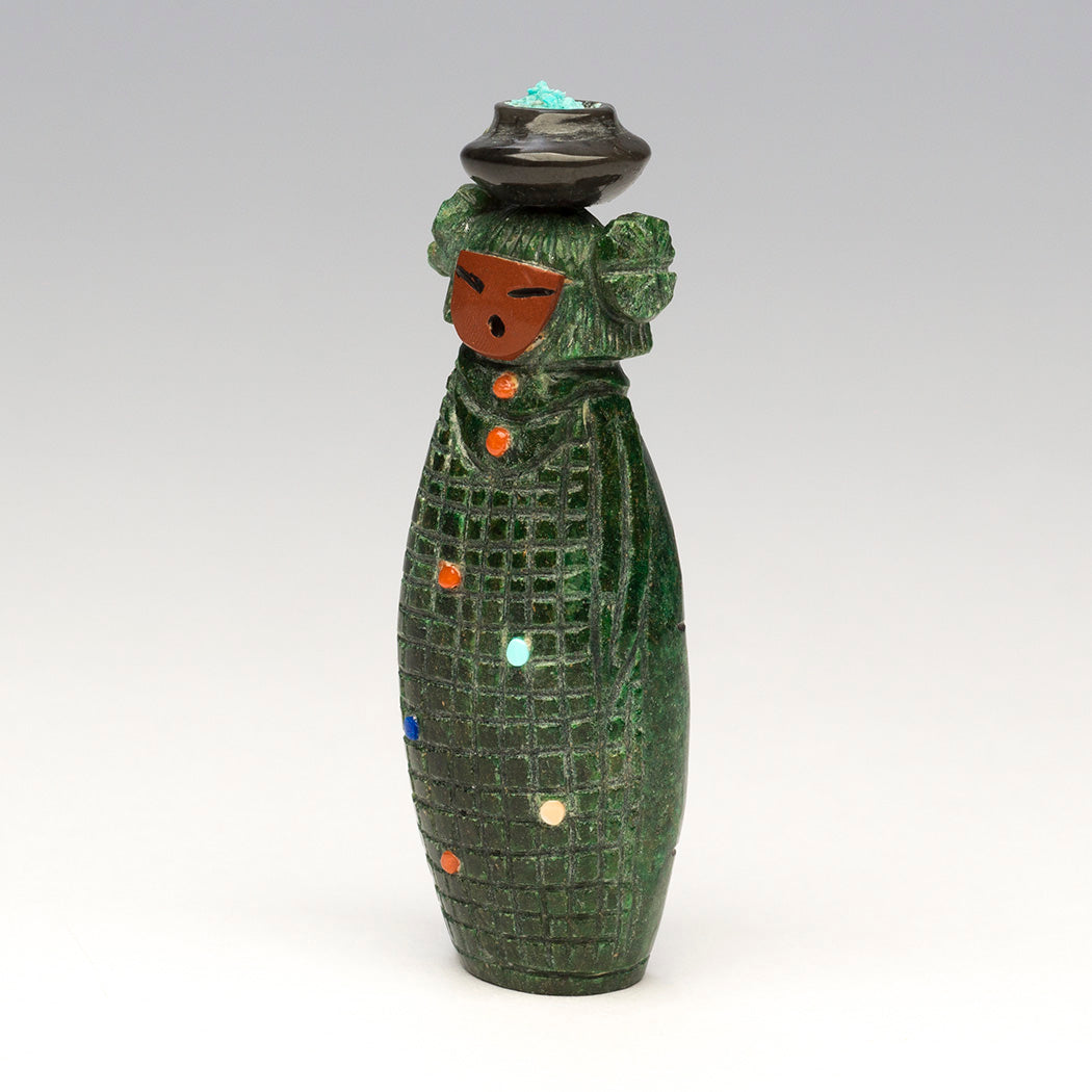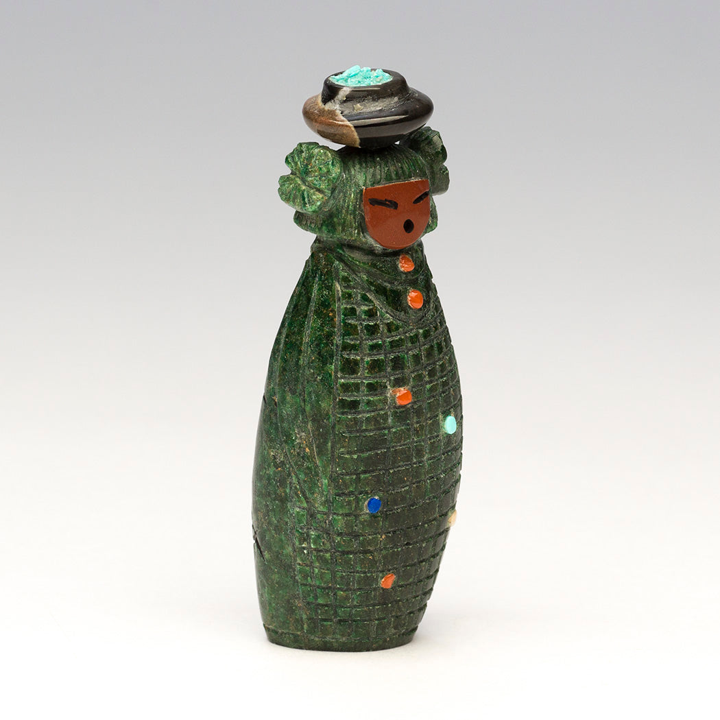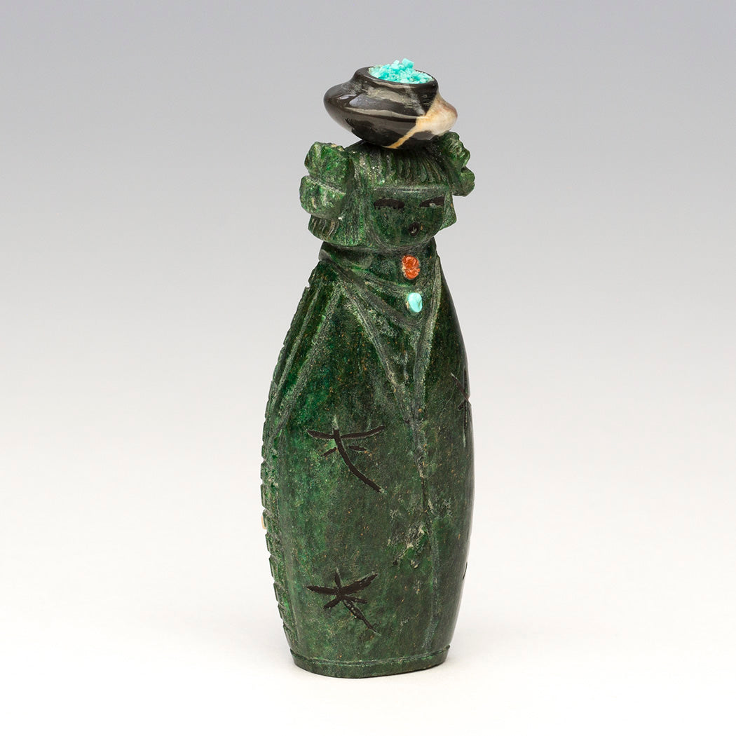 Sandra Quandelacy's two-sided carving from gorgeous bloodstone depicts a Corn-Maiden and Maiden Grandmother. They balance a miniature "pottery" jar from marble filled with crushed turquoise to represent precious water which is a living source of interconnectedness, on their head. Grandmother's shawl or blanket has incised Dragonflies while Corn Maiden's face is from overlaid pipestone. Colorful red coral, turquoise, lapis lazuli, serpentine and cowry shell inlays accent the corn kernels of Corn Maiden's body. About 2 1/2" tall, 3/4" wide and 5/8" deep.