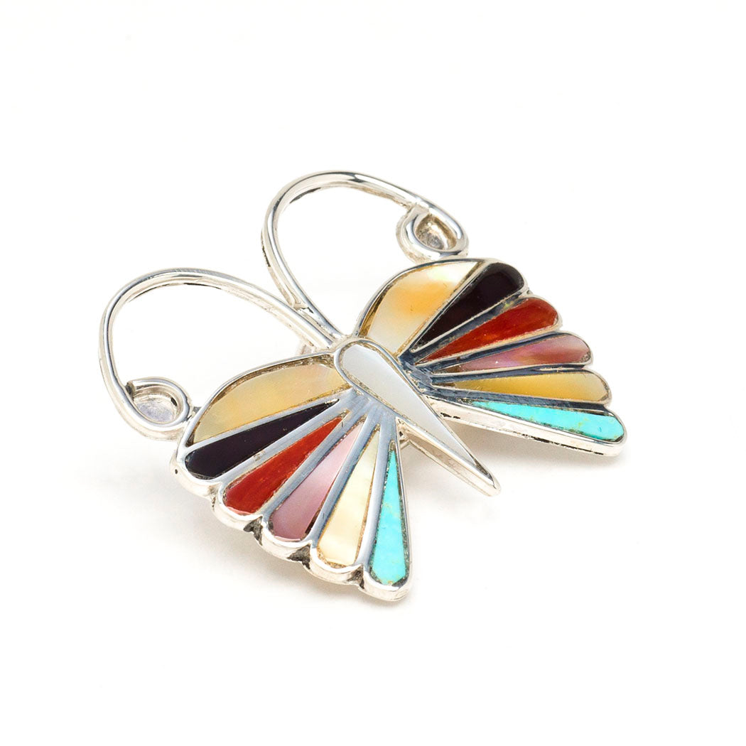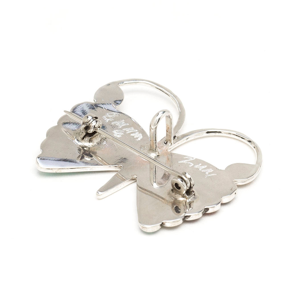 Butterflies represents power in the air because their gift lies in catching the breeze coming their way. They also teach us about transformation and courage. Even though they are delicate they bravely venture out sometimes traveling huge distances in a world so much bigger than they are. Emma Edaakie's sterling silver, iridescent gold lip shell, pen shell, sky blue turquoise, red coral, lovely pink mussel shell and dreamy mother-of-pearl butterfly pin/pendant reminds us to stay courageous and that the sweetness of spring is soon to come. About 1 1/4" long and 1 3/8" wide. Signed by the artist.
