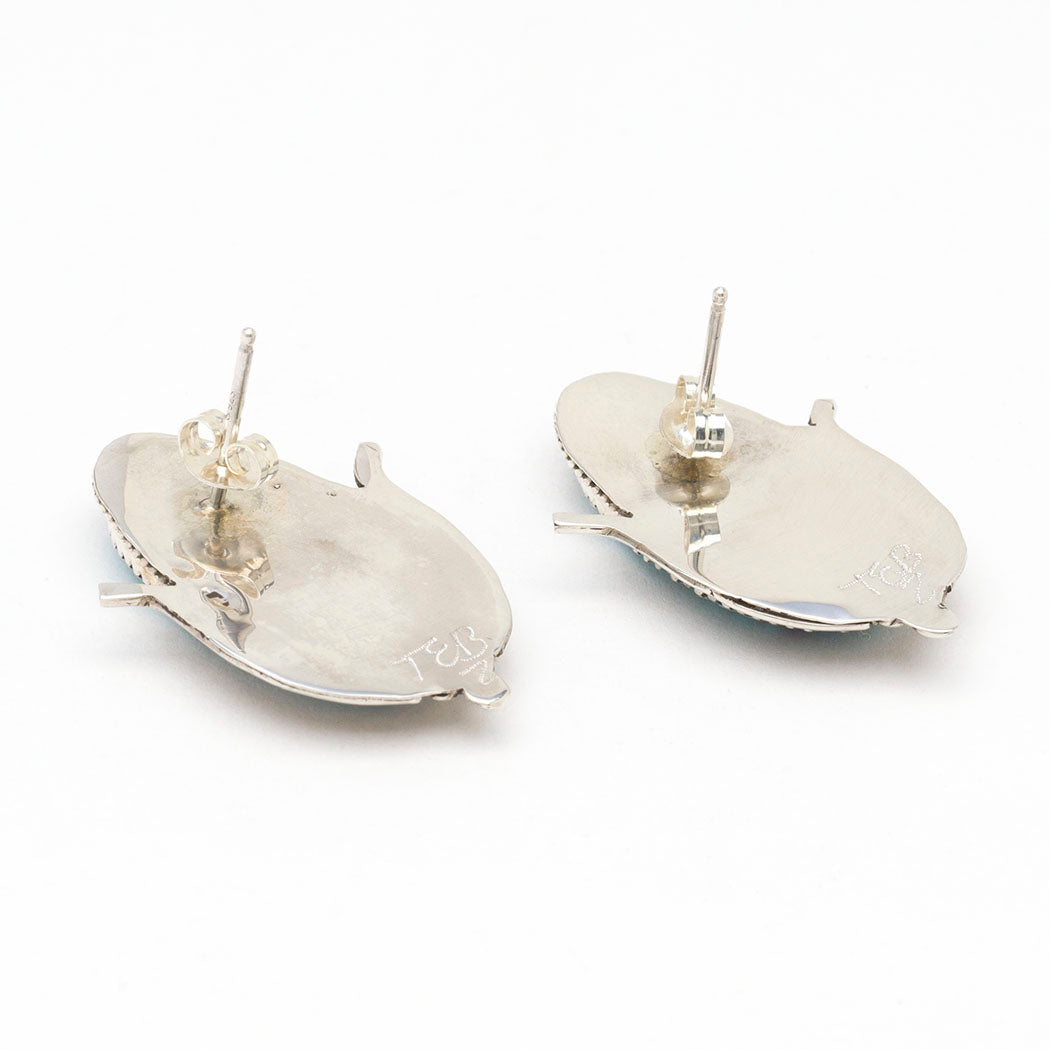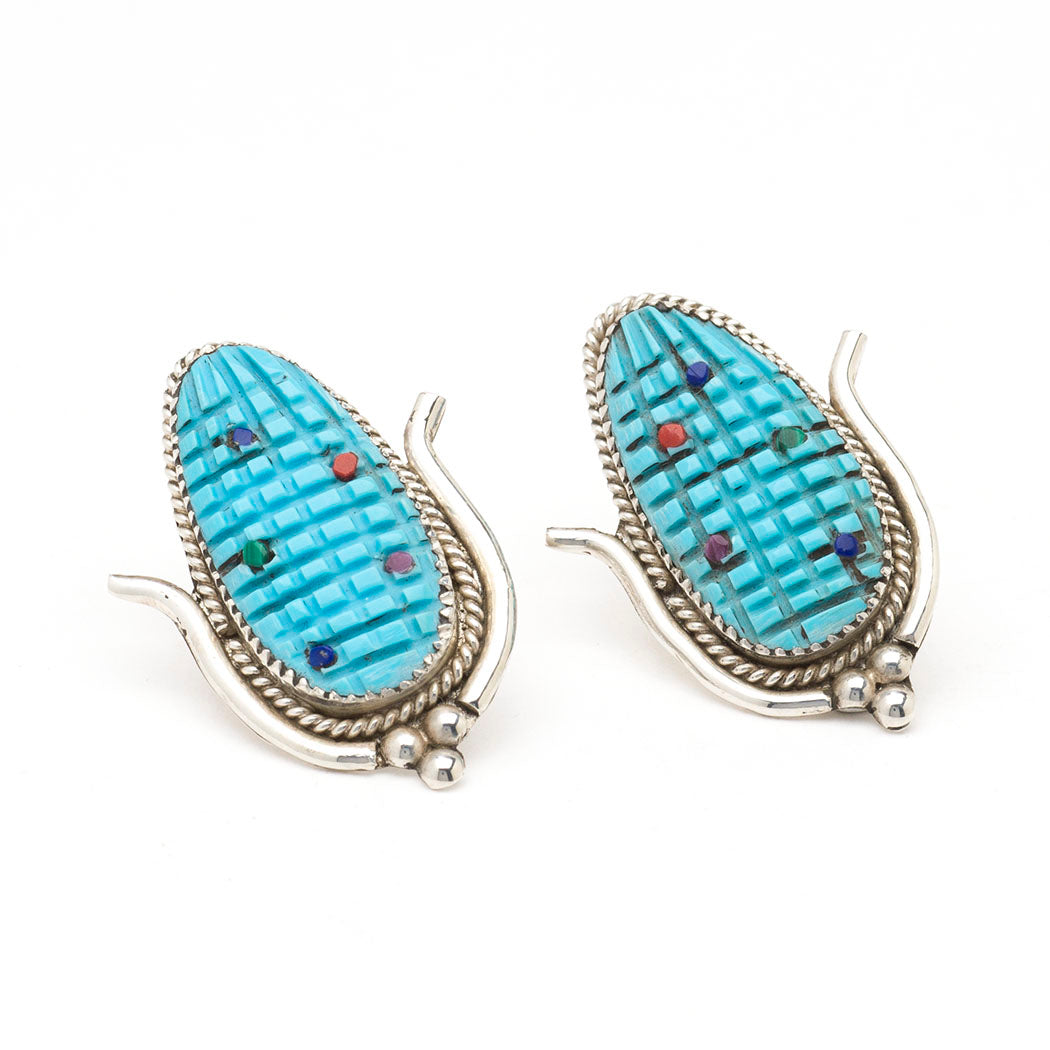 For the A:Shiwi (Zuni) corn is called the Mother because it's a main crop that emerges from beautiful Mother Earth. Zuni jeweler Tracey Bowekaty shares that corn is used in "many ways, in cooking, to make Tamales, and in ceremony." Elegantly carved, these turquoise corn earrings for pierced ears will make a subtle yet lasting impression. Set into sterling silver with colorful inlays from turquoise, lapis lazuli, malachite, coral and sugilite, these lightweight earrings measure about 1 1/4" long, 7/8" wide and 1/8" deep. Signed by the artist who started making corn jewelry when her first son was born in 1992.