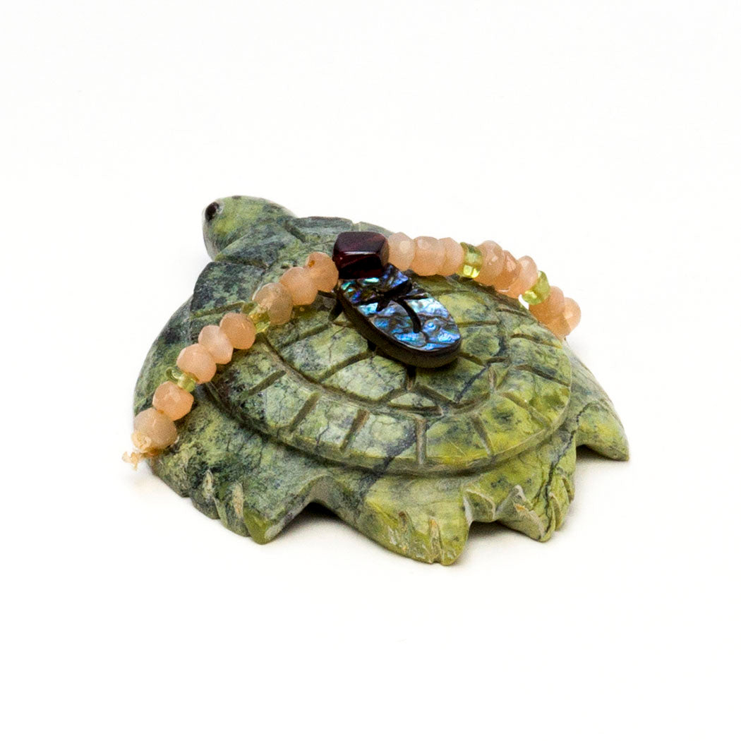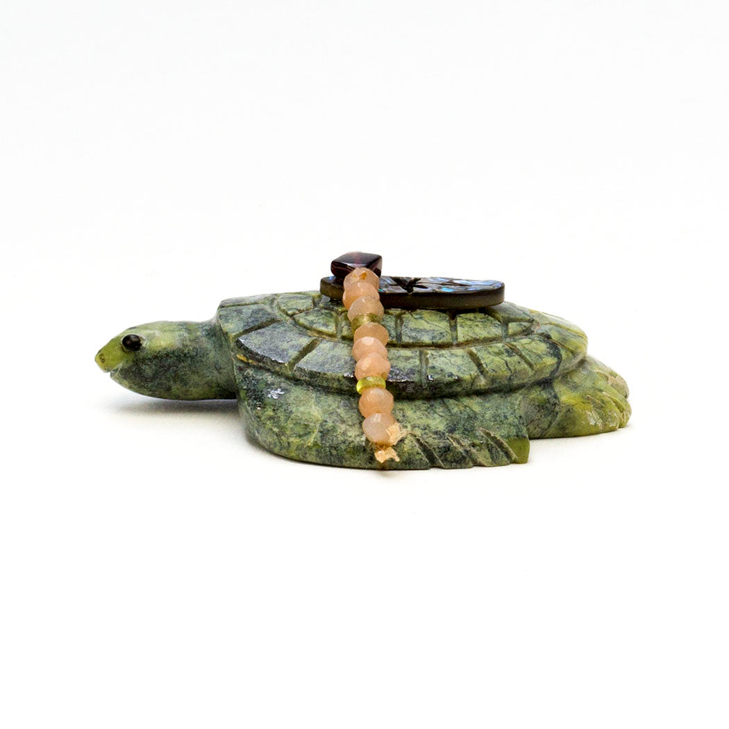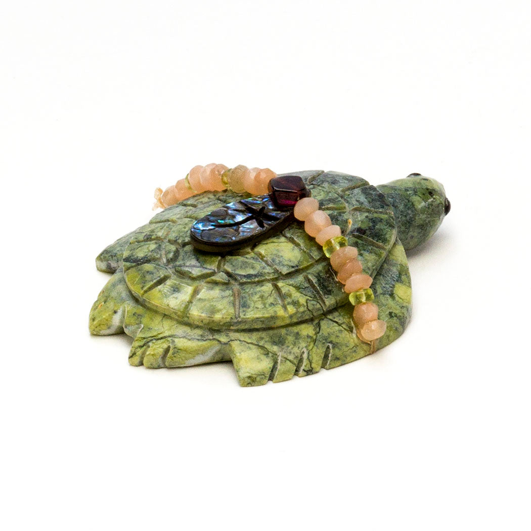 We adore Kateri Quandelacy Sanchez's sea Turtles because they're sweetly-spirited and gorgeously presented. Her latest collectible reptile is carved from a seaweed-hued serpentine with an elegantly incised carapace. It has a warm gaze from jet eyes in addition to a natural "third eye" from a black inclusion on the head region. An offering bundle is exquisite composed from an iridescent abalone Dragonfly piece that's been etched and filled with jet paste, along with rich garnet, invigorating peridot and soothing sunstone faceted beads. About 2 1/4" long, 1 7/8" wide and 3/4" tall.