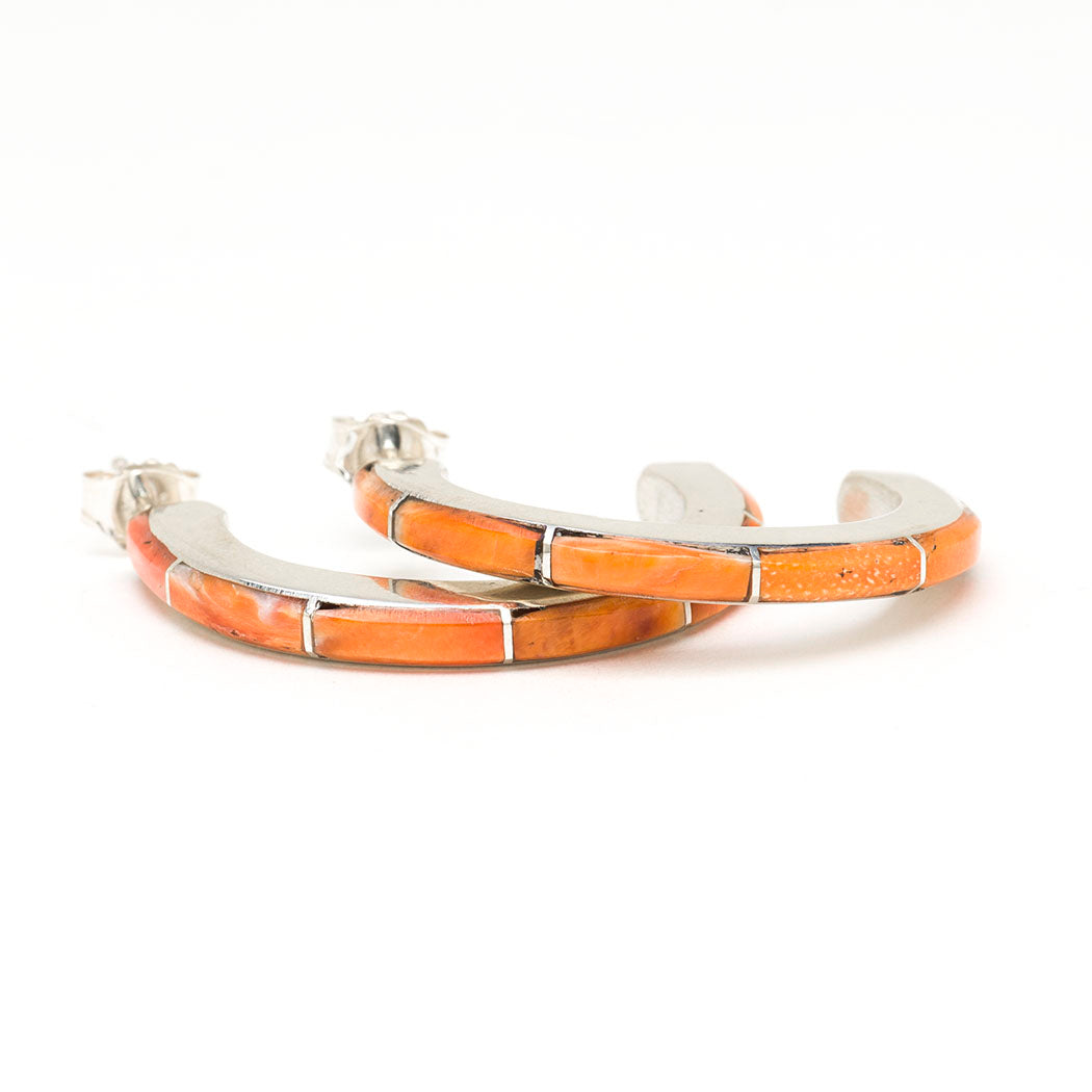 Zuni artists Rosalie Hustito and her late husband Charles Hustito created gorgeous handmade jewelry together for many, many years. She continues sharing incredible lapidary and silversmithing skills through a classic pair of lovely sterling silver and refreshing orange spiny oyster shell channel inlaid half-hoop earrings. For pierced ears, they are lightweight and measure approximately 1 1/8" long, 1/8" wide and 3/4" deep. Signed by the artist. Please click