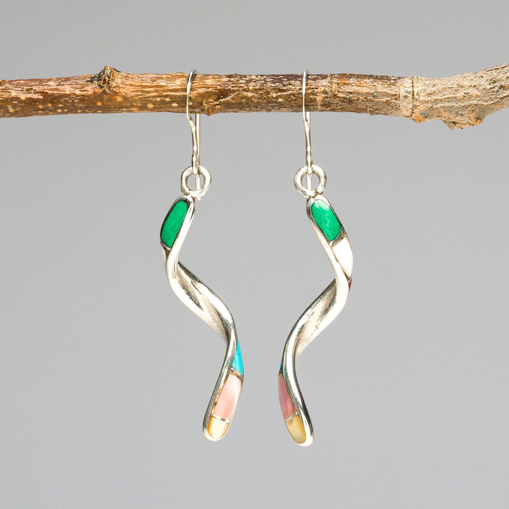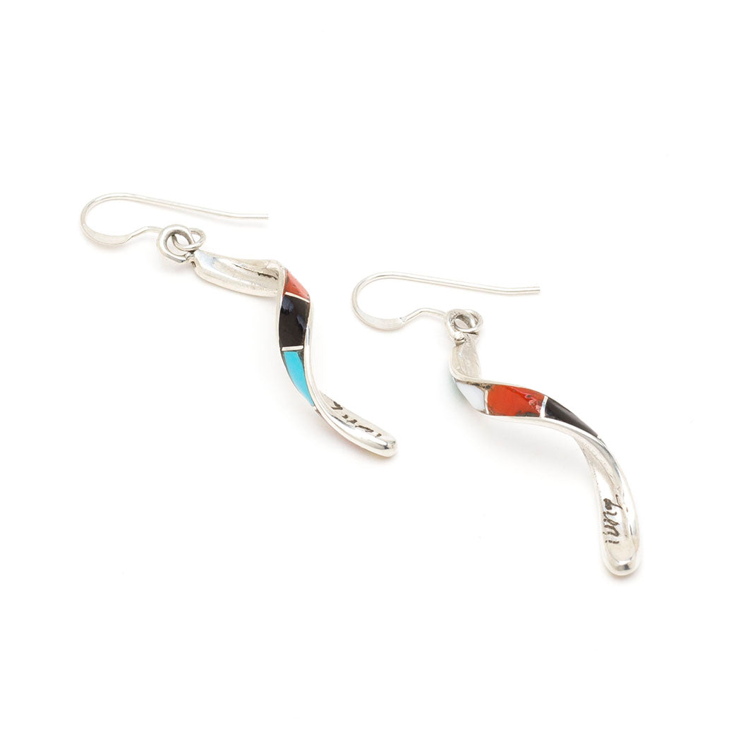 Enhance your natural beauty with a fabulous pair of handmade sterling silver, both blue and green turquoises, red coral, pen shell, pink mussel shell, gold lip shell and mother-of-pearl channel inlaid swirl earrings by Ira Johnson. They'll also add a pop of color and variety to your jewelry box. Complimenting the face, measurements of these lightweight beauties are approximately 1 3/4" long including the french hooks and 1/4" wide. They are marked Zuni on the inside bottom of each lovely earring. We invite you to learn more about wonderful Zuni jewelry