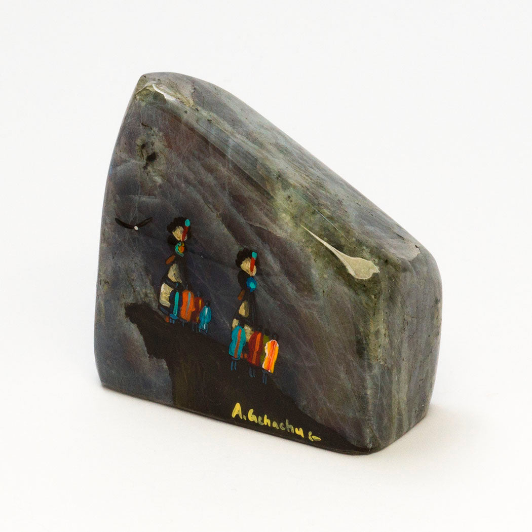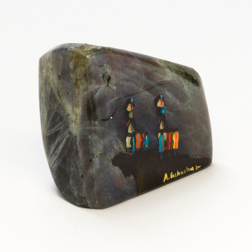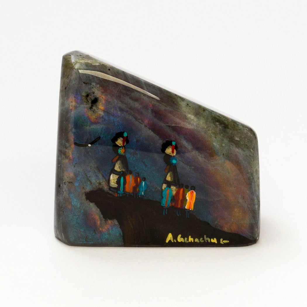 "Cosmic Ancestors" is an original acrylic painting on labradorite that hosts enchanting blue, orange, purple and magenta in a fiery change of colors. Sacred Sha'lak'os accompanied by elder companions and powerful