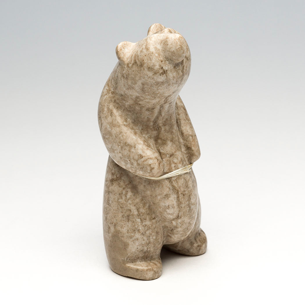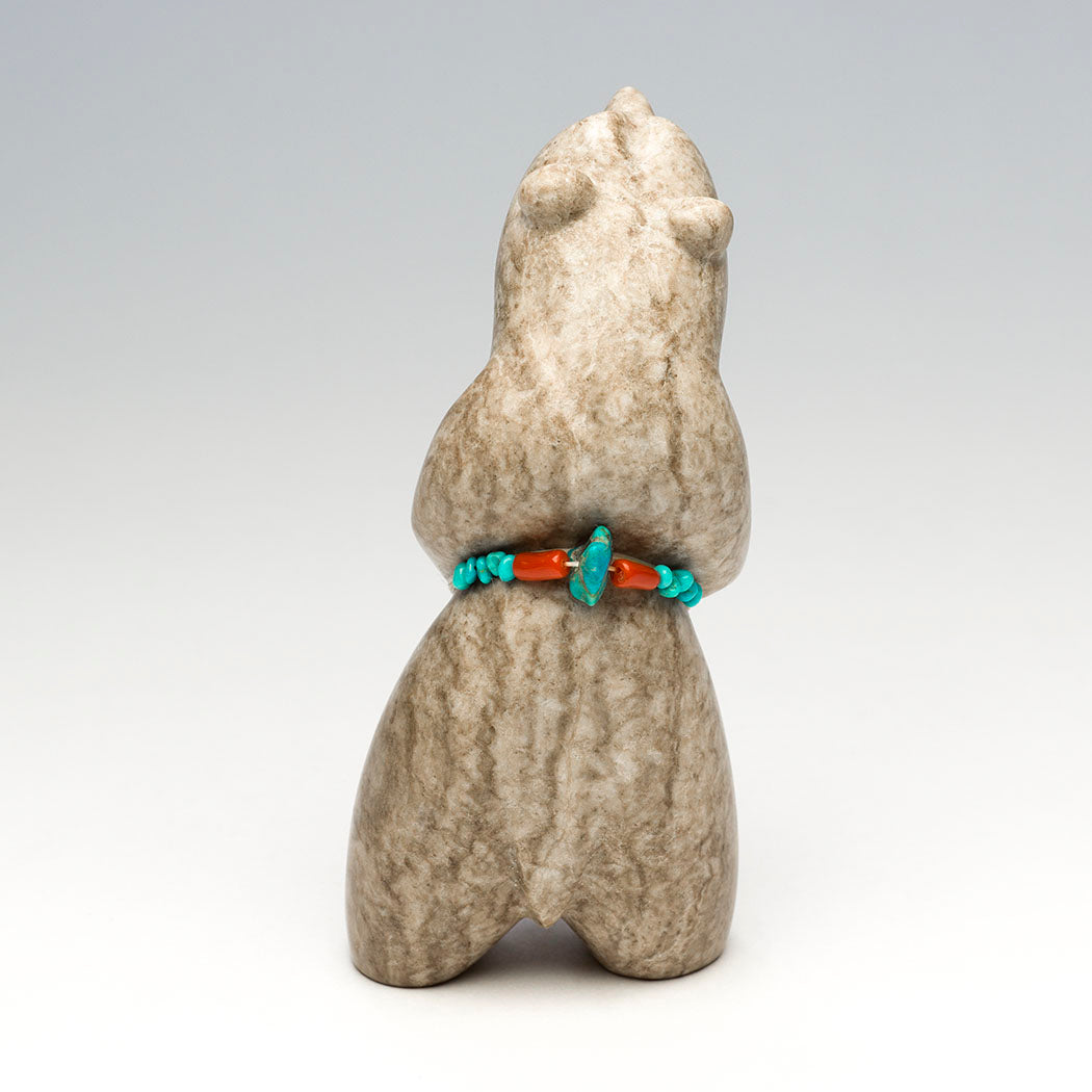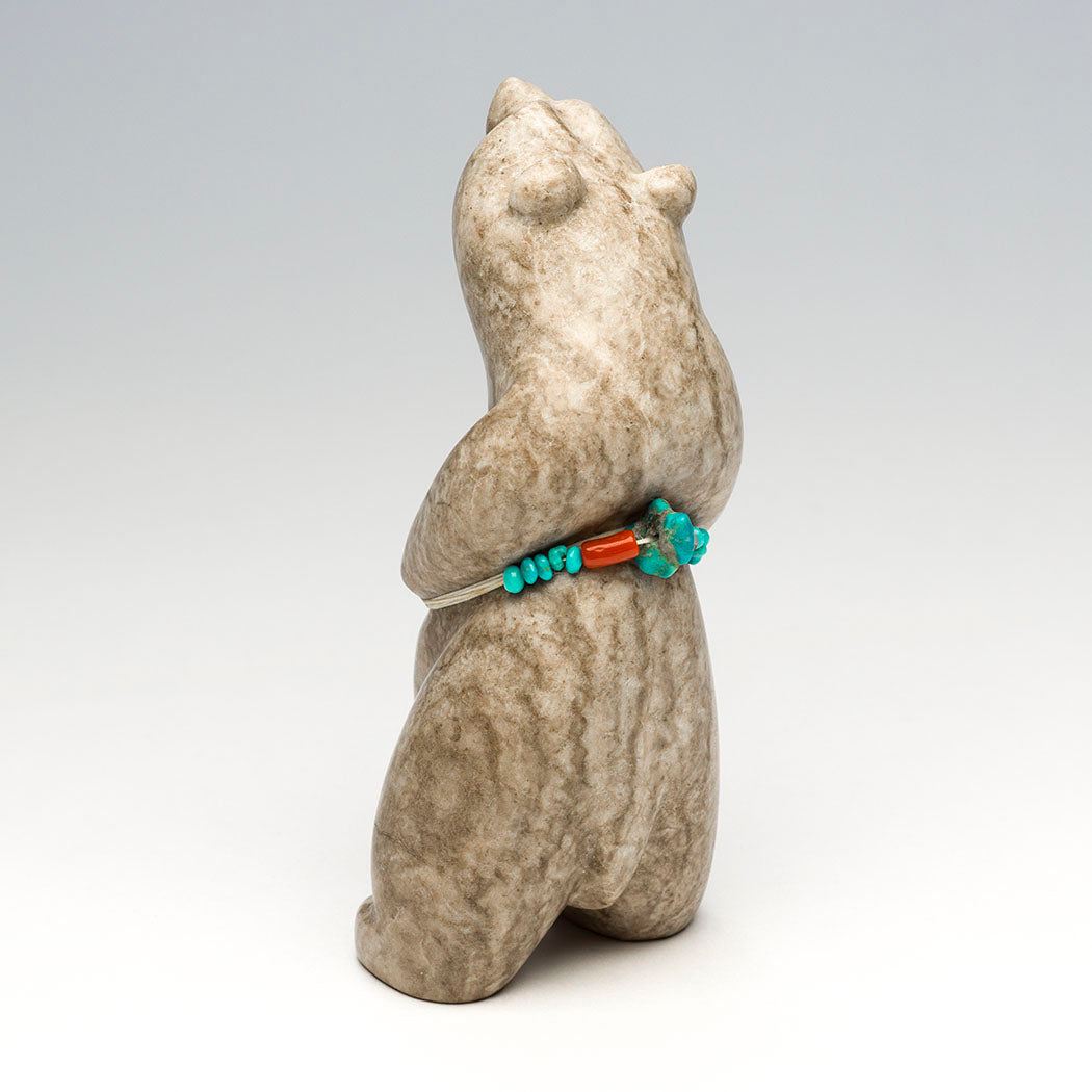 A happy stargazing Bear dreams of blasting off on an interstellar adventure into a universe of swirling galaxies and twinkling celestial wonders. Bring a bit of cosmic magic home to you in this approximately 6" tall, 2 5/8" wide and 2 5/8" deep powerful standing bear masterfully sculpted from Utah alabaster by Gabriel Sice. An offering bundle is from heavenly turquoise and branch red coral beads.