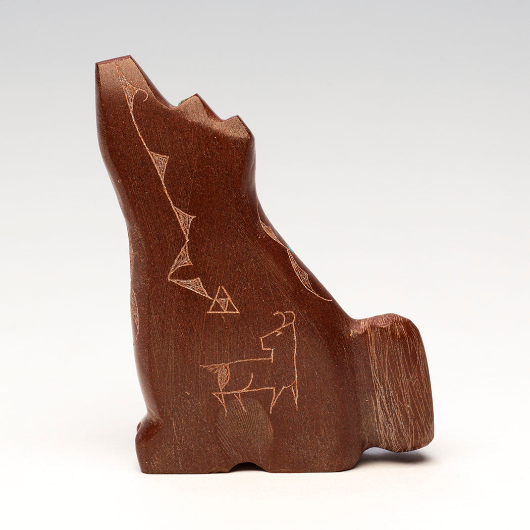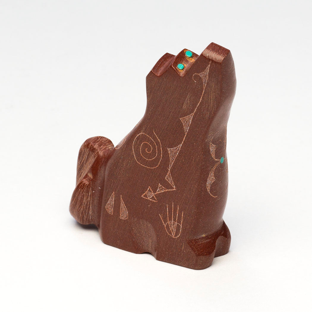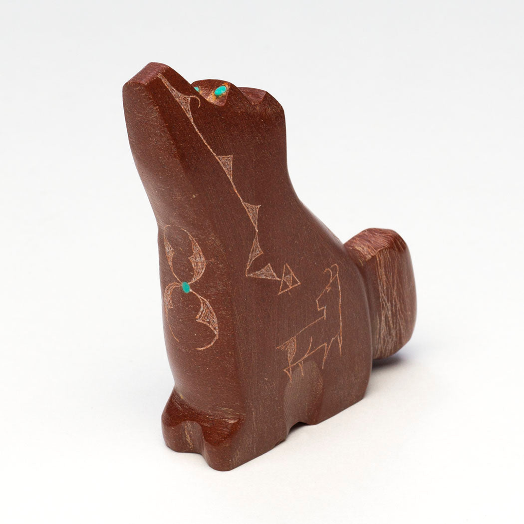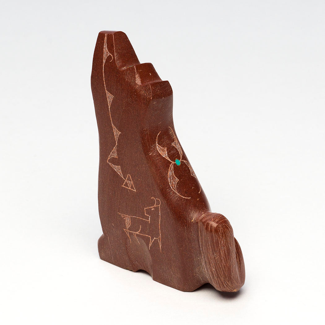 Ulysses Mahkee's animal carvings are usually etched with meaningful designs inspired from petroglyphs which are powerful symbols, astronomical records and spiritual messages by ancient Indigenous Peoples. Ulysses carves a lot in rich pipestone which is basically fossilized clay. He descends from the late Andrew Emerson Quam family of noted Zuni artists. An inspired Coyote (Wolf or Fox) from pipestone is sgraffito-etched with Deer or Elk, heartlines or breath paths, tracks, spiral and hand symbols. The heartlines are adorned with Zuni Rainbirds who are known as The Bringers Of Life, representing prayers for rain and snow. Heartfelt eyes and a decorative inlay are from turquoise. Approximately 1 7/8" long, 5/8" wide and 2 3/8" tall.