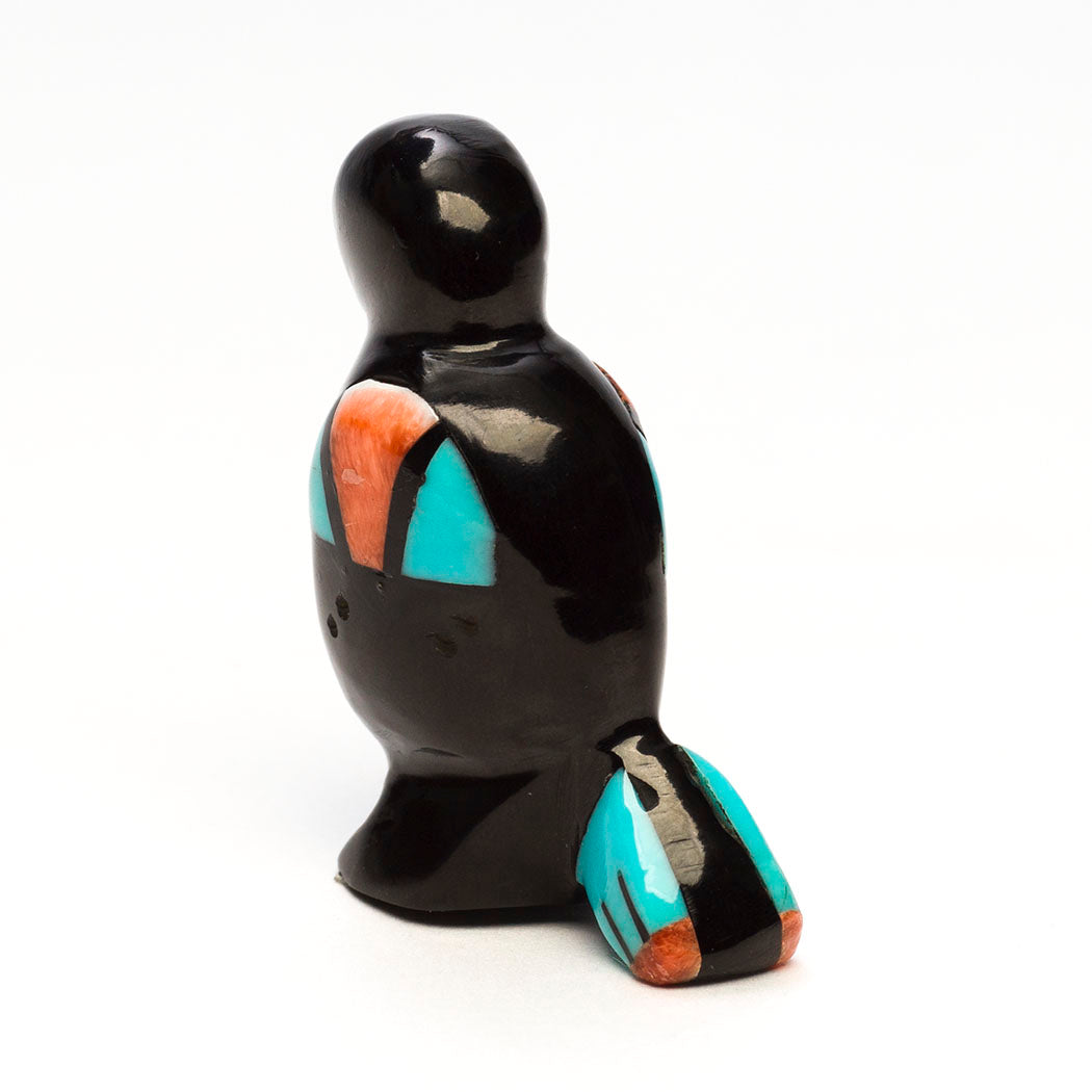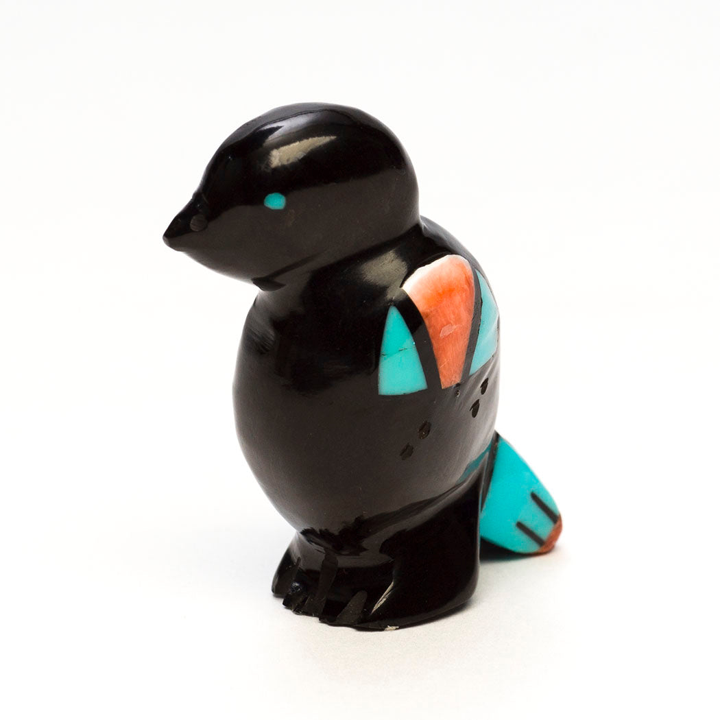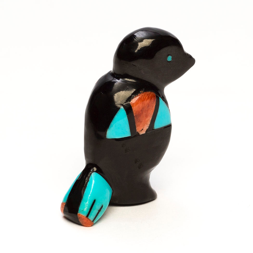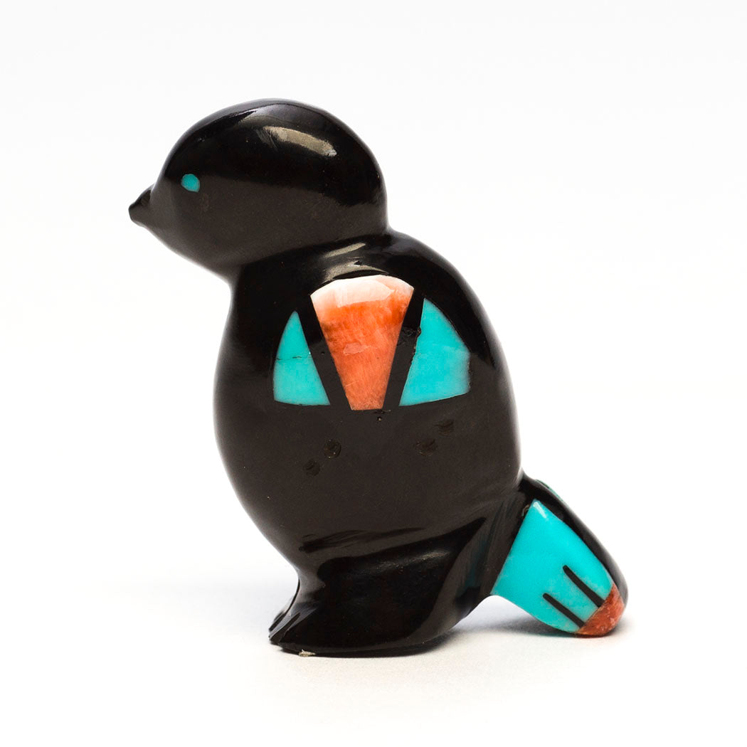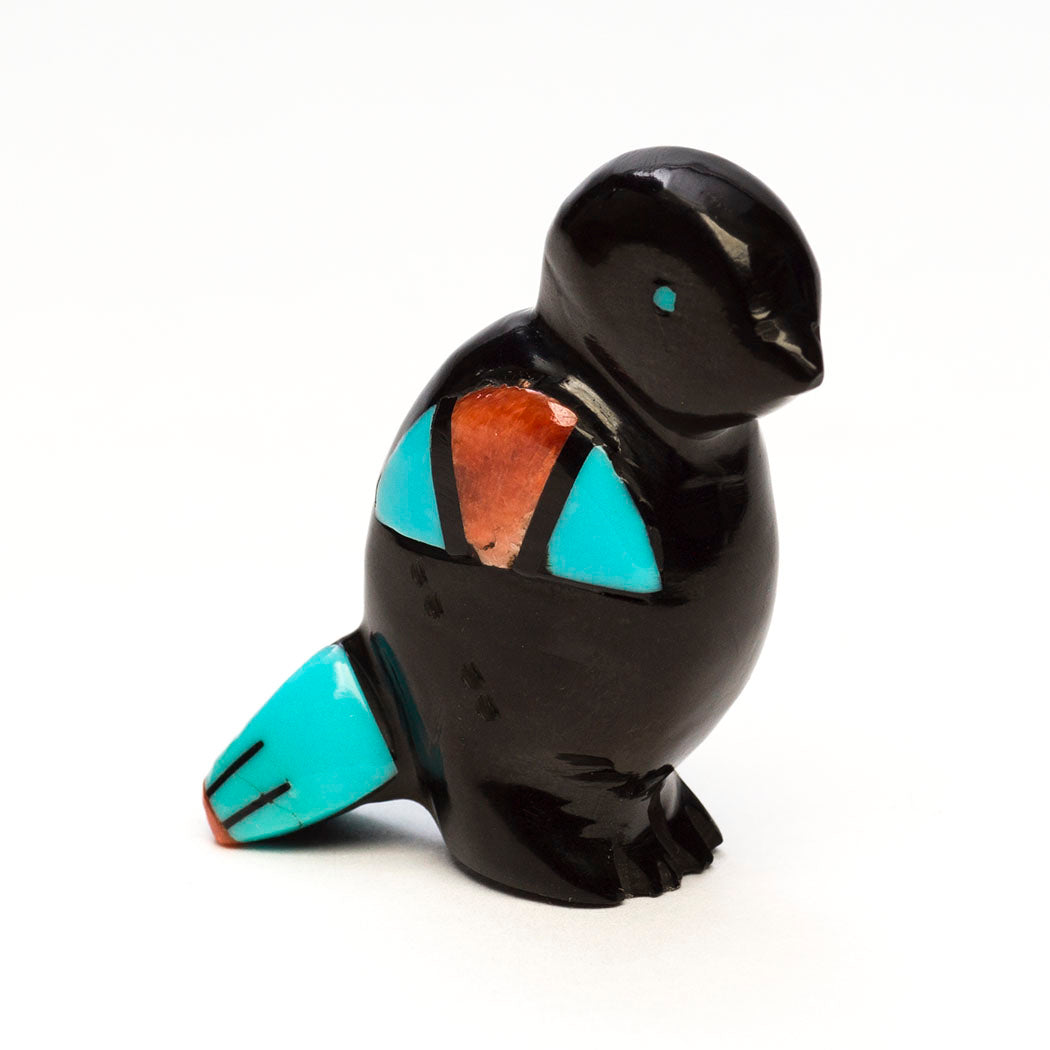 Wise crows can inform the flock if a human is a friend or foe. They bestow small gifts if you are kind to them. Pansy Natachu's darling crow (Raven or blackbird) with eyes from turquoise inlays has been sculpted from jet with exquisite mosaic overlays from colorful turquoise and bright orange spiny oyster shell. About 1 1/2" tall, 5/8" wide and 1 3/8" deep.