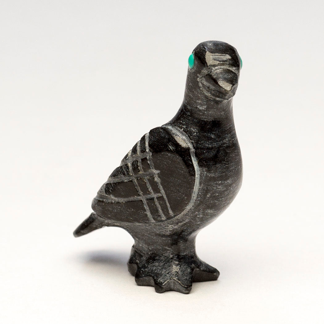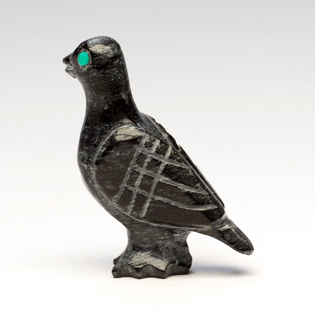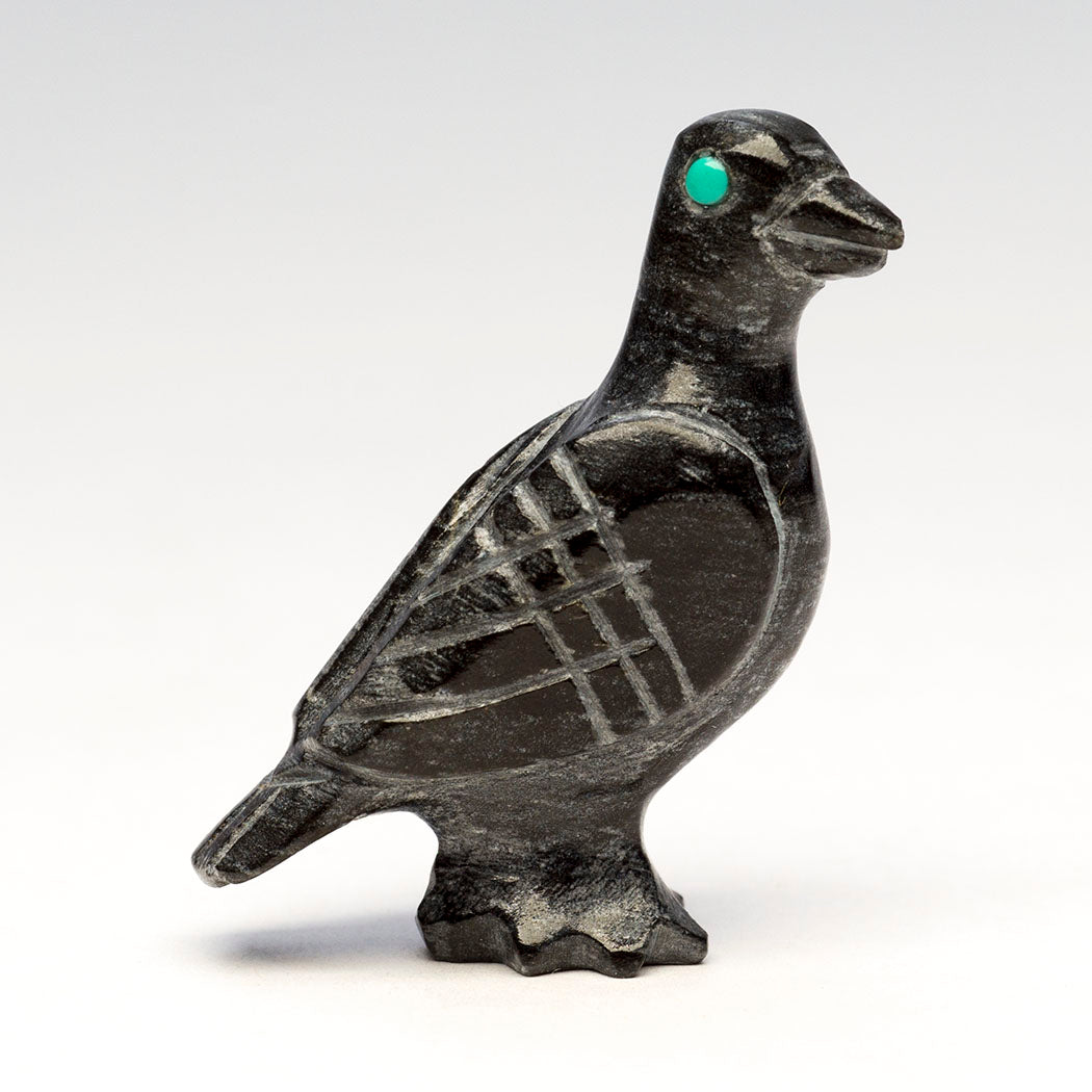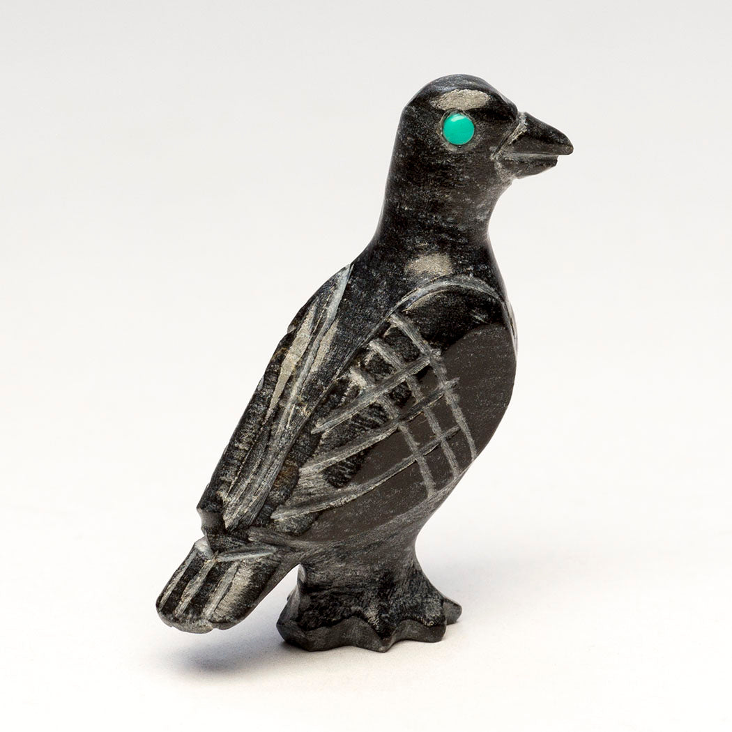 Crows are wizards of the bird world because they are exceptionally intelligent displaying gifts in tool manipulation and even memory and understanding. Fabian Tsethlikai's marble crow (or Raven) is ready to take flight to join a huge communal roost of other corvids for a sleep over. Large eyes are from turquoise inlays. About 1 5/8" tall, 1/2" wide and 1 3/8" deep.