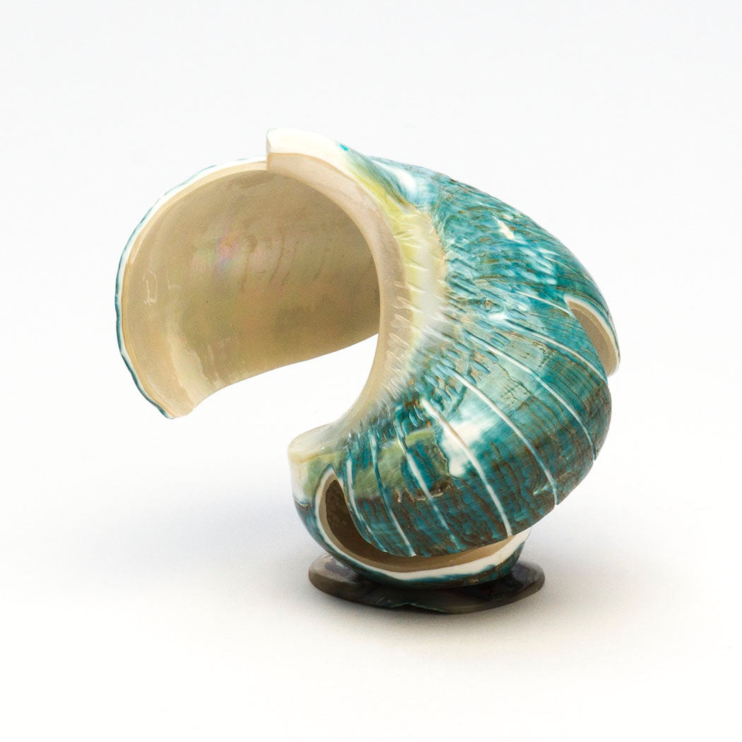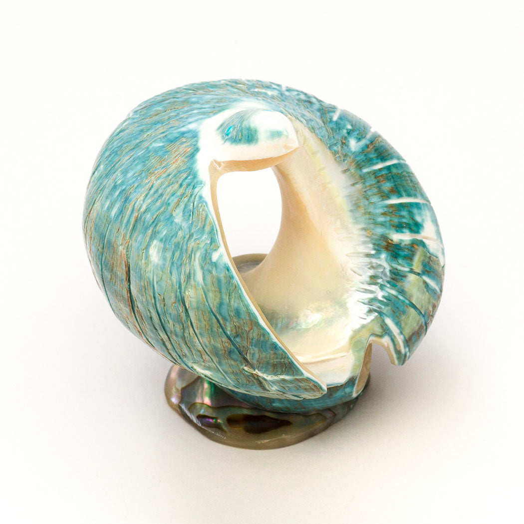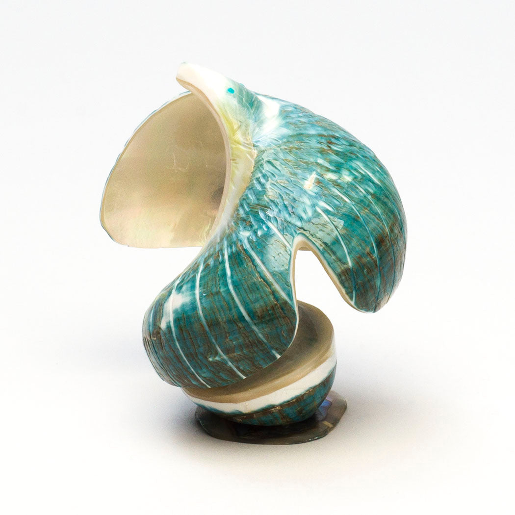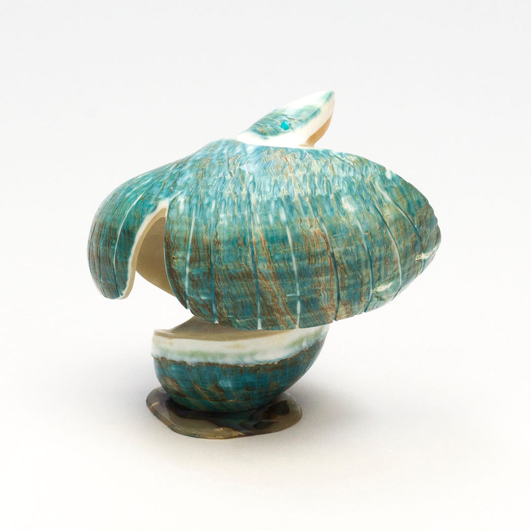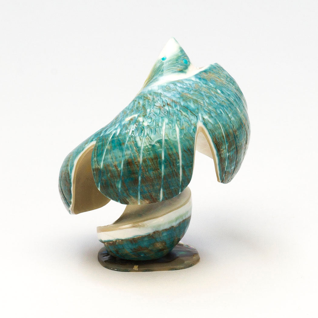Hawk) rides the thermals soaring higher and higher taking in far away sights through turquoise inlaid eyes. Ingeniously formed from a verdant Pacific green snail shell, this elevated raptor measures approximately 2 1/2" long, 2 1/2" wide and 2 7/8" tall including the lovely iridescent shell base.