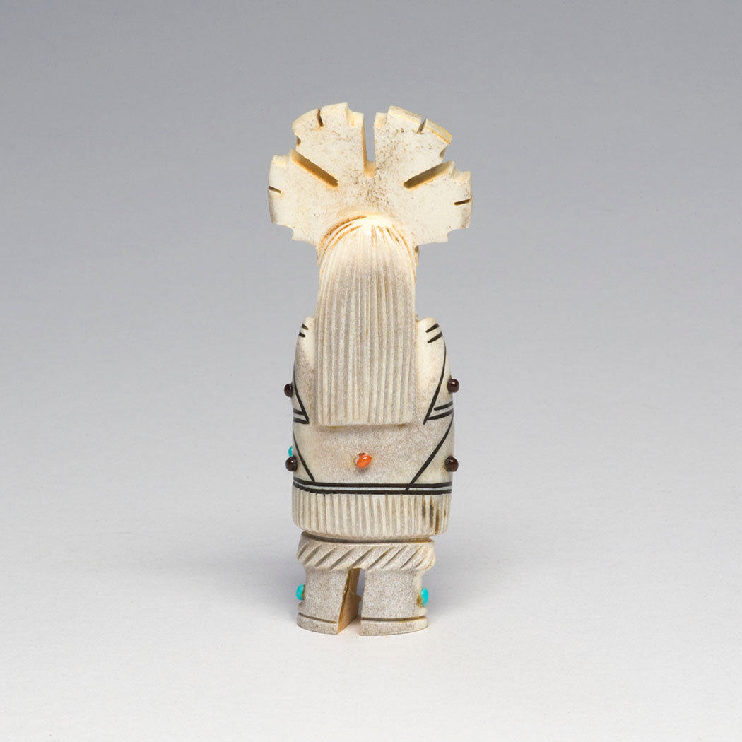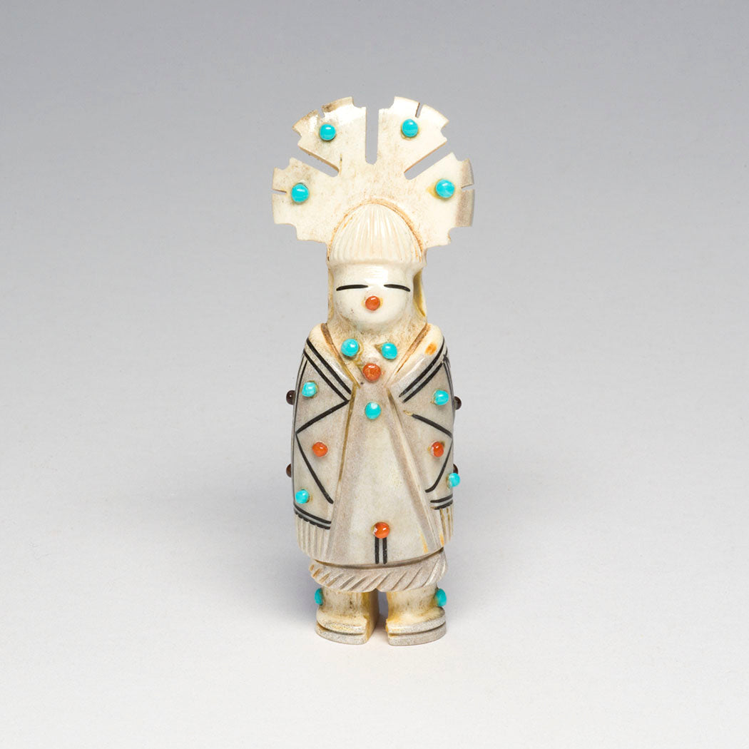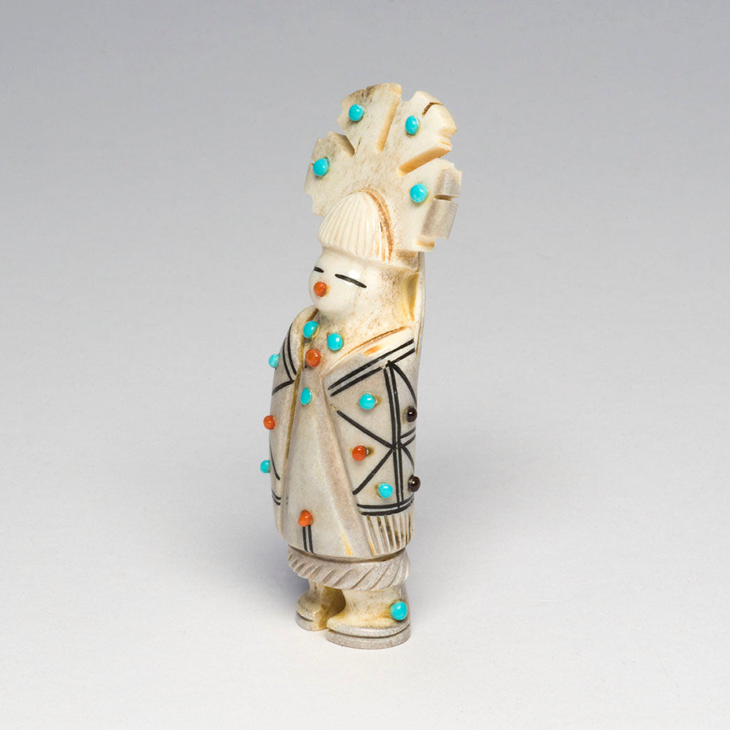 Zuni carver Claudia Peina's Tablita Maiden dances for a successful harvest. Sculpted from one antler specimen, a traditional headdress resembles four individual olla pottery jars with turquoise inlays to represent life-giving water. Eyes are etched and a mouth is from a coral inlay. Long hair and bangs are intricately incised, while a warm shawl is etched and filled with jet paste accented with colorful pen shell, turquoise and red coral pieces. About 3" tall, 1 1/8" wide and 1" deep.