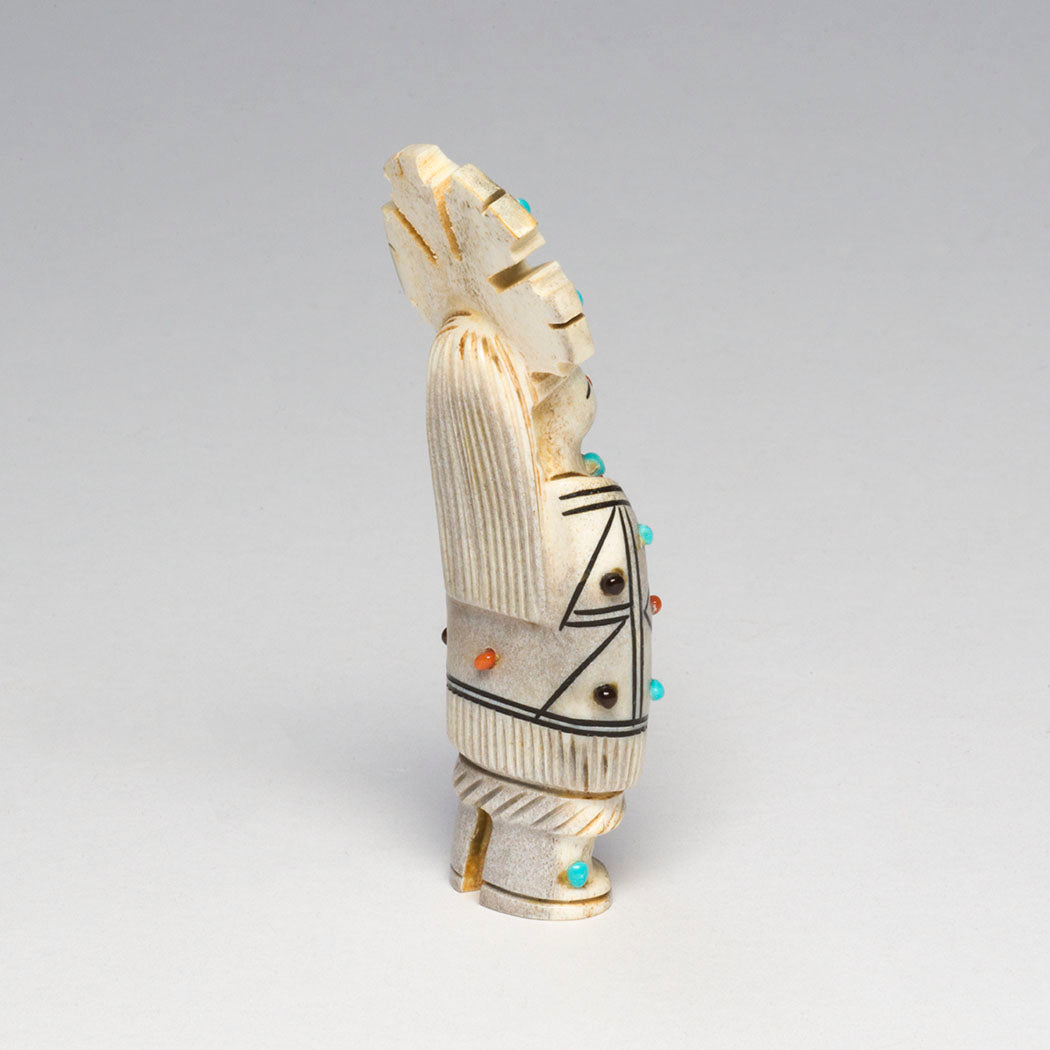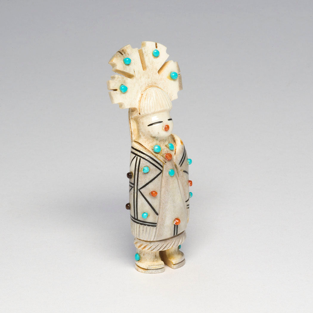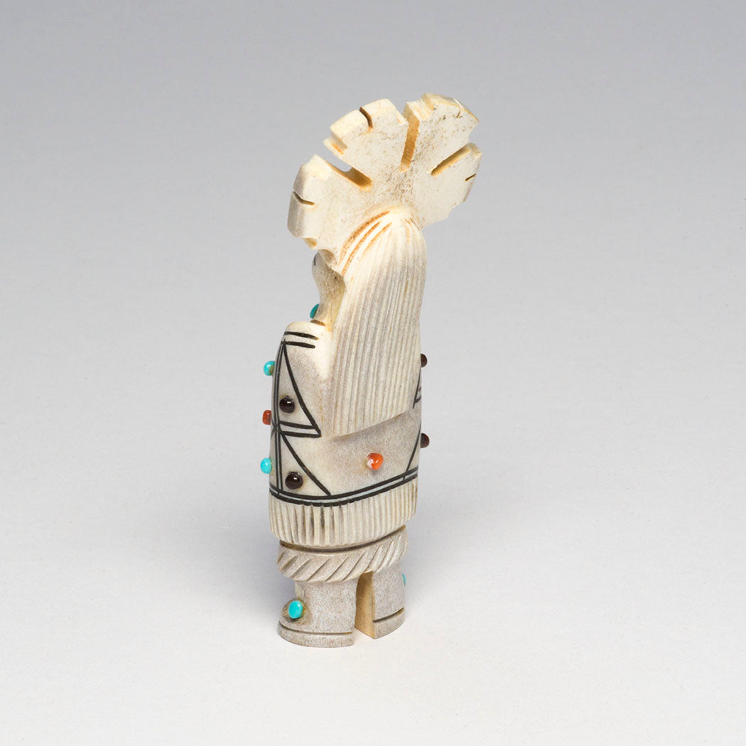 Zuni carver Claudia Peina's Tablita Maiden dances for a successful harvest. Sculpted from one antler specimen, a traditional headdress resembles four individual olla pottery jars with turquoise inlays to represent life-giving water. Eyes are etched and a mouth is from a coral inlay. Long hair and bangs are intricately incised, while a warm shawl is etched and filled with jet paste accented with colorful pen shell, turquoise and red coral pieces. About 3" tall, 1 1/8" wide and 1" deep.