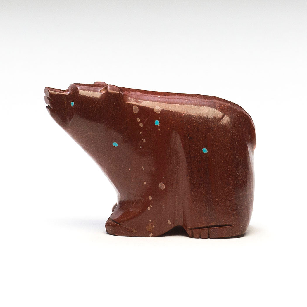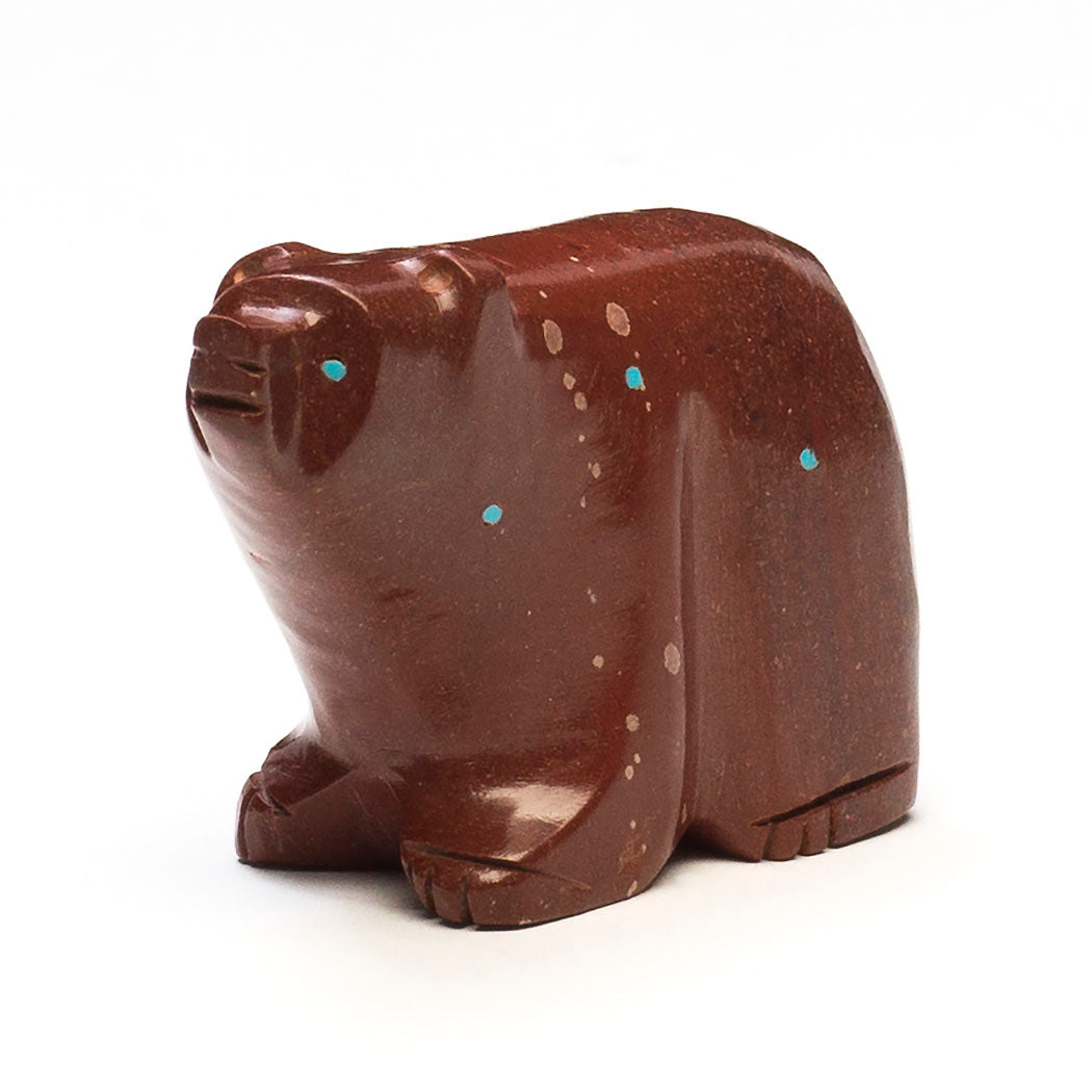 Cinnamon black Bears live in mountainous and lowland areas of New Mexico. The difference between the Indigenous view of bears and that of mainstream society is that bears are respected as family, sentient beings who have a range of emotions congruent with those of humans. David Chavez, Jr.'s deep reddish-brown bear has been carved from pipestone to a size of approximately 2 1/2" long, 1" wide and roughly 1 3/4" tall, with a high gloss polish. Lovely turquoise eyes and inlays accent this nicely-weighty carving that fits comfortably in the palm of the hand.