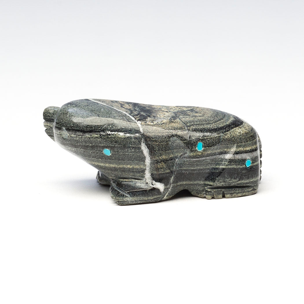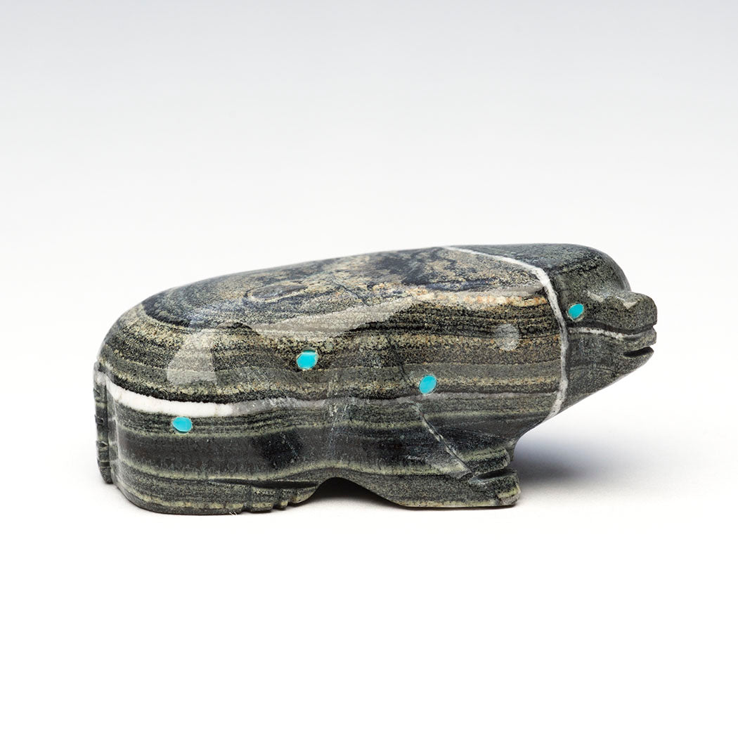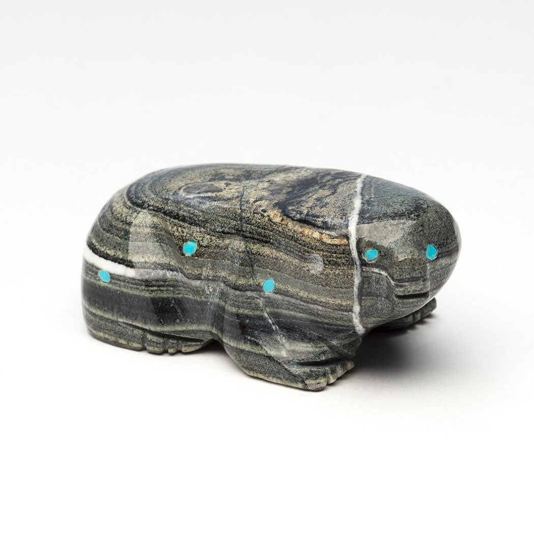 Moles will dig deeper to escape winter's harshest days. Among the extensive roots, they'll sniff out assorted insects and chubby earthworms to fill their bellies. A mole's animal medicine teaches us to look inside ourselves and the potential we have to reach our goals. David Chavez, Jr.'s lovely ricolite mole can be the sweet reminder we need to push forward. Turquoise inlays adorn the body and eyes of this approximately 1 7/8" long, 1" wide and 3/4" tall benearth the ground friend.