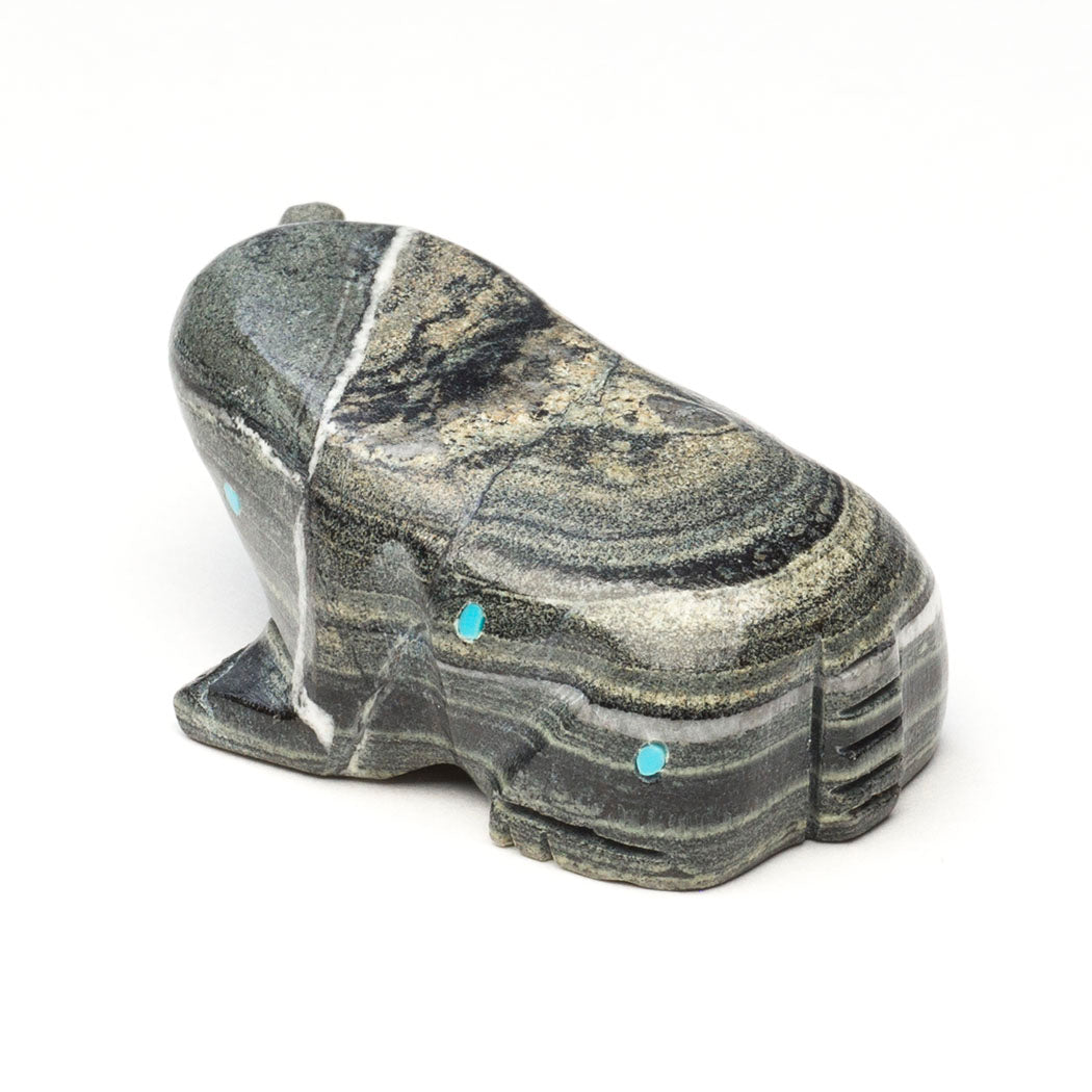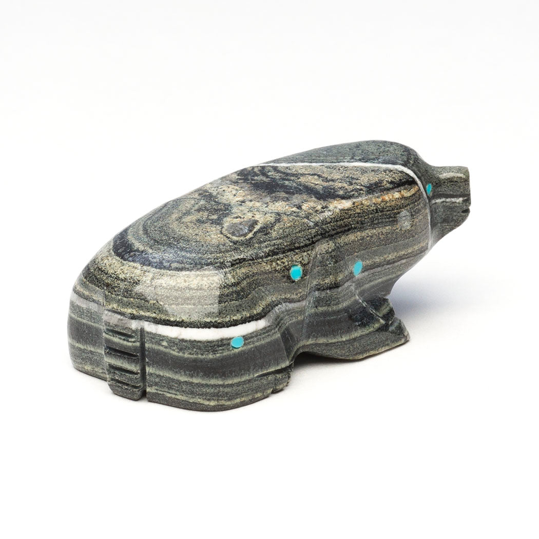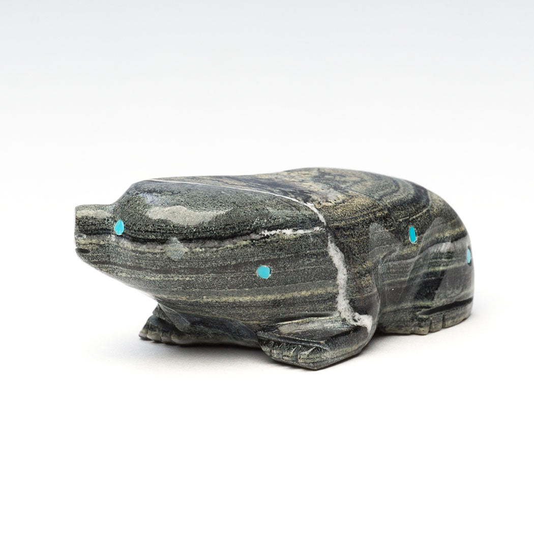 Moles will dig deeper to escape winter's harshest days. Among the extensive roots, they'll sniff out assorted insects and chubby earthworms to fill their bellies. A mole's animal medicine teaches us to look inside ourselves and the potential we have to reach our goals. David Chavez, Jr.'s lovely ricolite mole can be the sweet reminder we need to push forward. Turquoise inlays adorn the body and eyes of this approximately 1 7/8" long, 1" wide and 3/4" tall benearth the ground friend.
