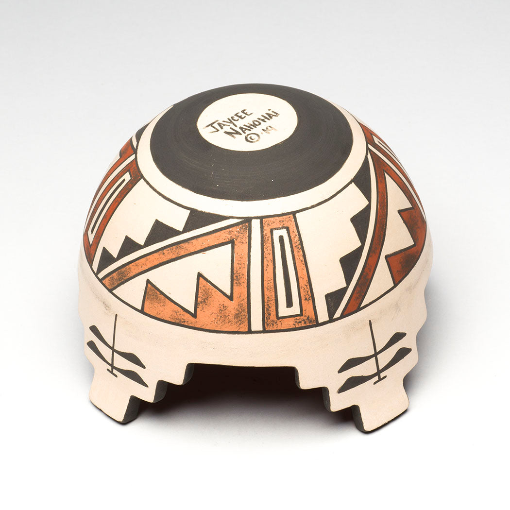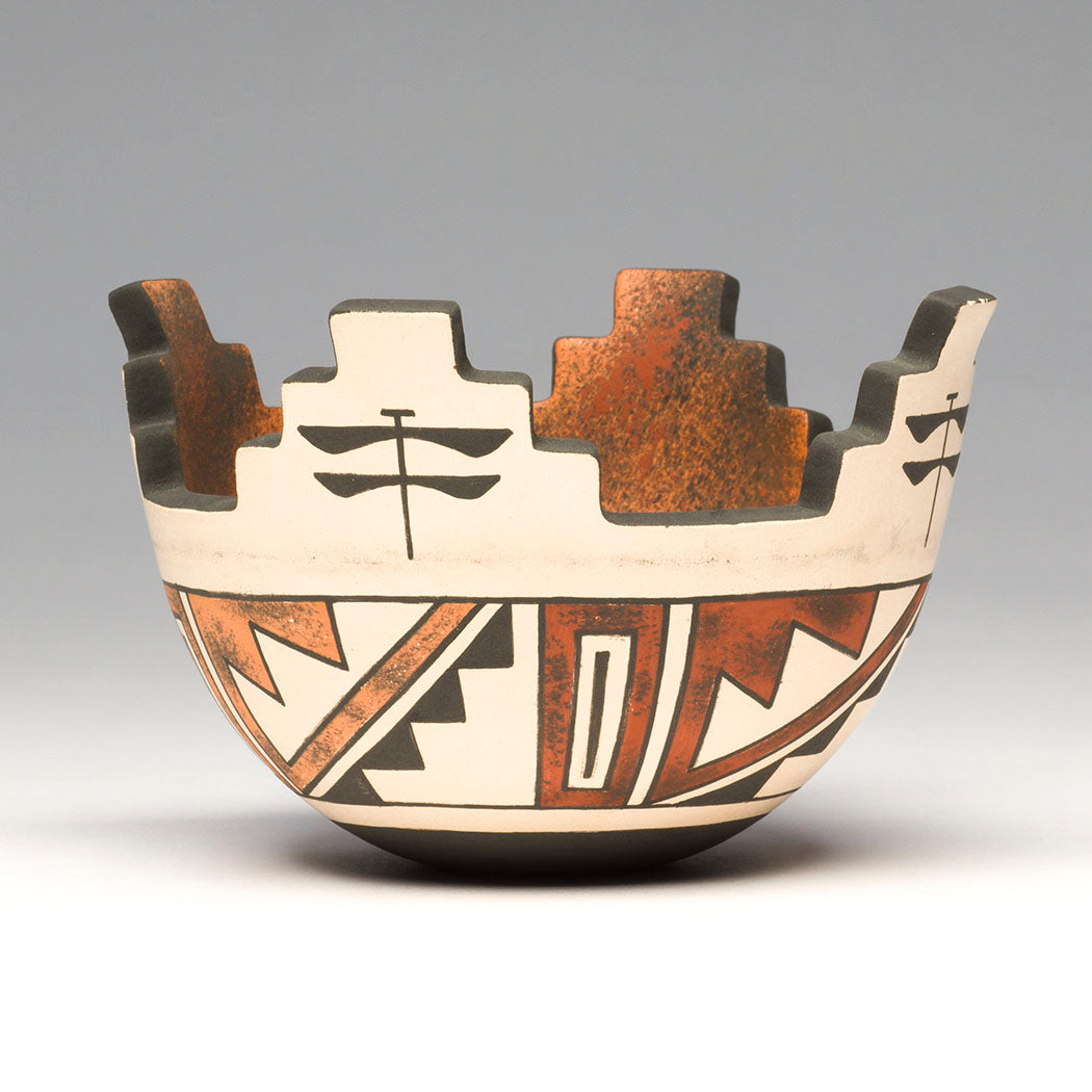 In many Zuni homes pottery bowls similar to this stepped-edge one are used to store ceremonial cornmeal. They are known by many names: prayer bowl, cloud bowl and cornmeal bowl. Noted potter Jaycee Nahohai's hand-coiled natural clay pottery bowl honors the Dragonfly (Shumak'olo:wa), a messenger who carries prayers. Micaceous paint adds a delightful sparkle to this approximately 5 1/4" long, 5 1/4" wide and 3 1/4" tall collectible piece. Signed by the artist. Please click here to learn more about the tradition of Zuni pottery.