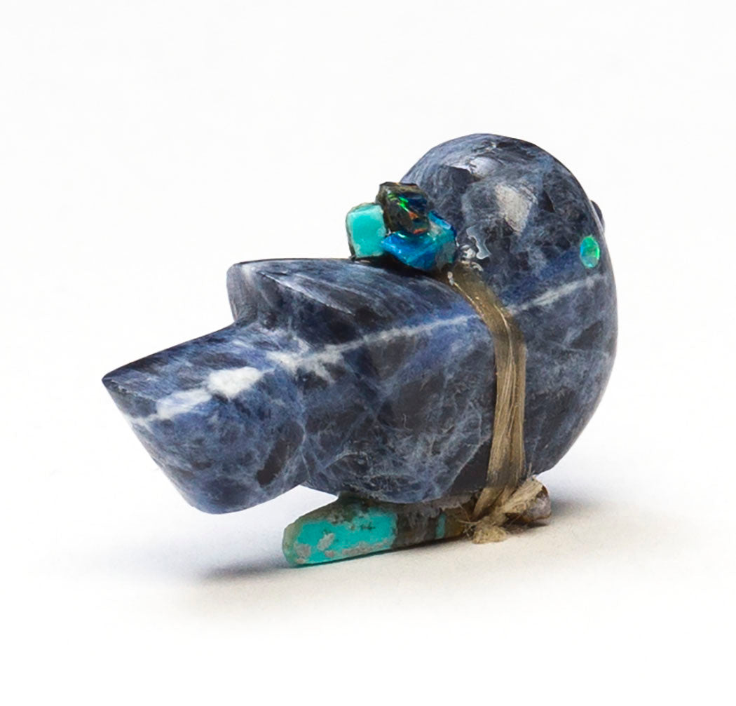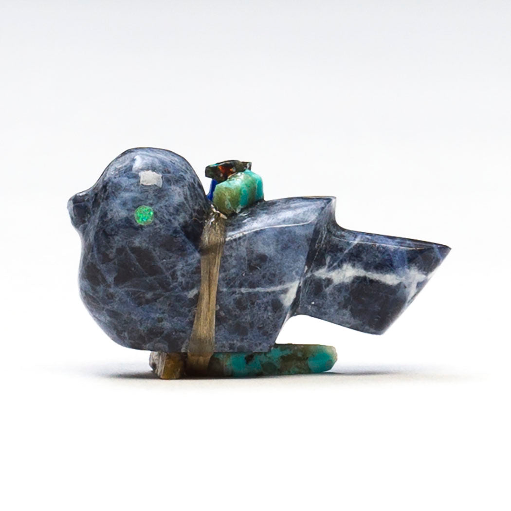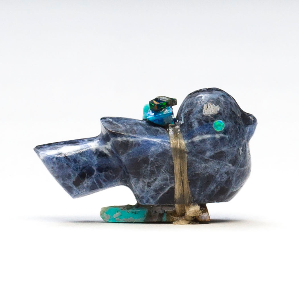 Daryl Shack, Sr.'s hungry nestling calls for mother to deliver a savory treat. Chicks grow fast and require nourishment from sunrise to sunset. Super precious, this baby songbird has been carved from sodalite and has twinkling eyes from cultured opal inlays. Including the turquoise point base, dimensions all together are about 1 1/4" long, 3/8" wide and 3/4" tall.