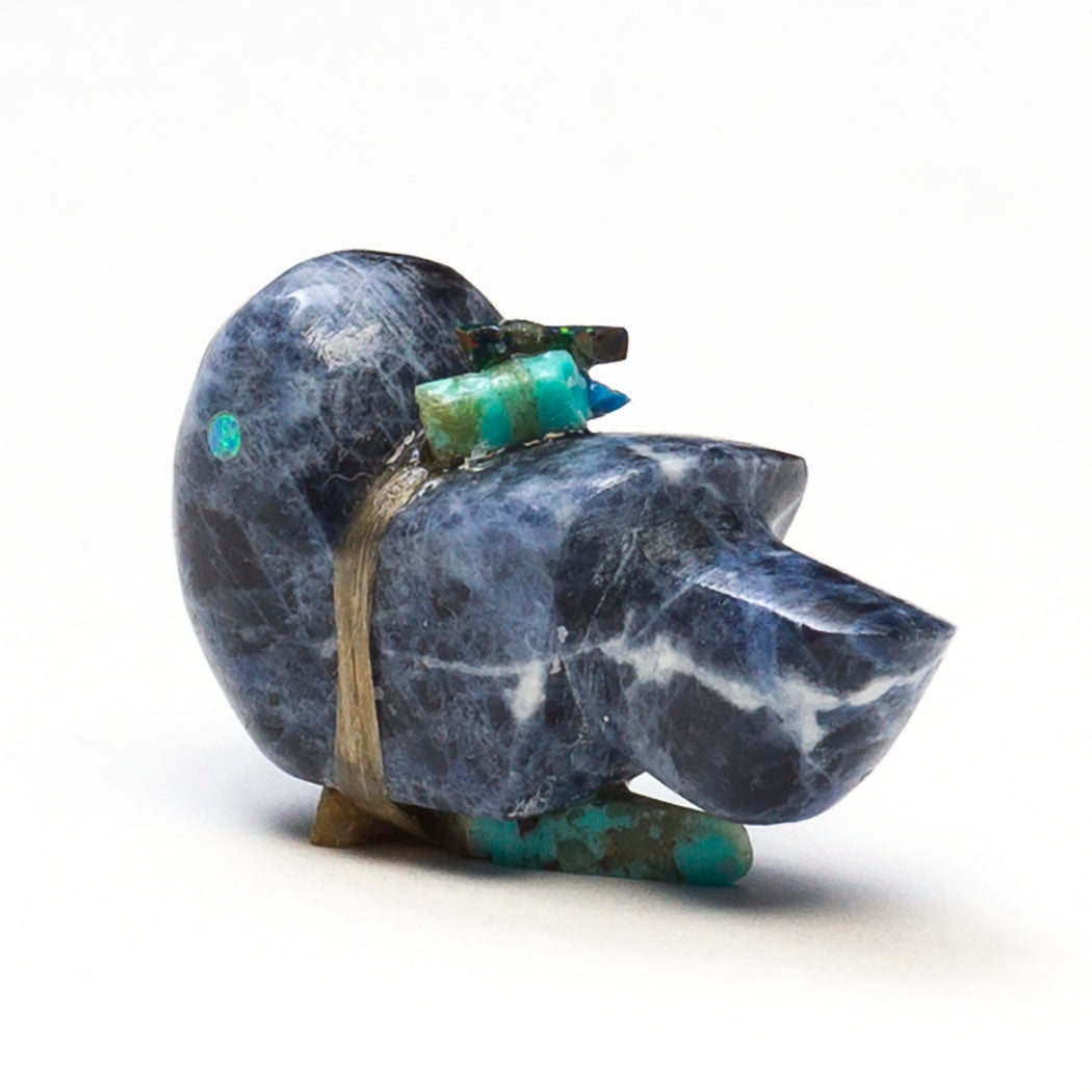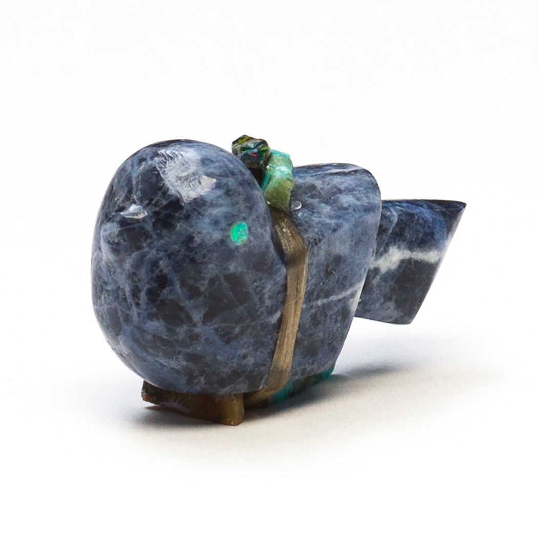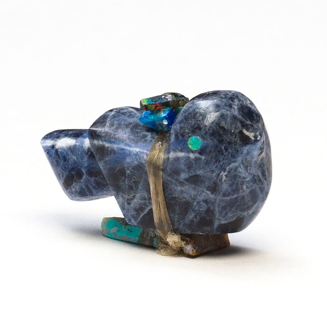 Daryl Shack, Sr.'s hungry nestling calls for mother to deliver a savory treat. Chicks grow fast and require nourishment from sunrise to sunset. Super precious, this baby songbird has been carved from sodalite and has twinkling eyes from cultured opal inlays. Including the turquoise point base, dimensions all together are about 1 1/4" long, 3/8" wide and 3/4" tall.