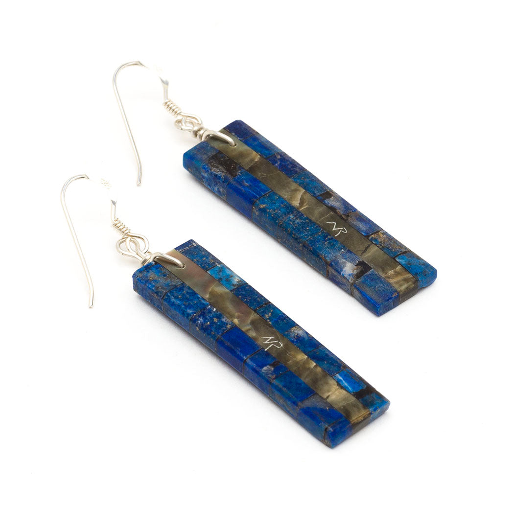 Certain earrings have an ability to add a special touch of sophistication and elegance to any ensemble. Nick Rosetta's vibrant lapis lazuli and shimmering black lip mother-of-pearl shell mosaic dangle earrings are the pair that do just that. They're beautifully shaped and loaded with royal blue color and tiny bits of natural pyrite inclusions. Including hooks, these lightweight lovelies light up the face at about 2 1/4" long, 3/8" wide and 1/8" deep. Signed by the artist who was taught to make traditional mosaic jewelry from his parents Ray and Mary Rosetta.