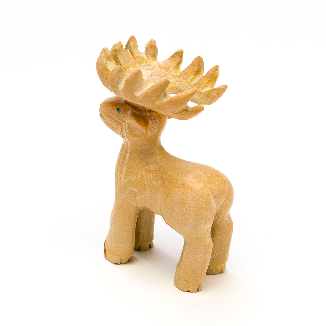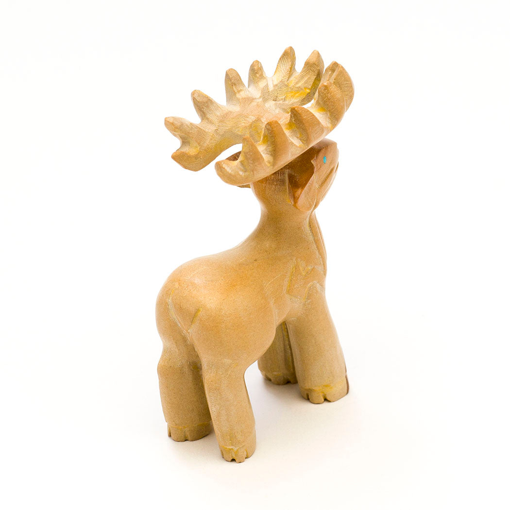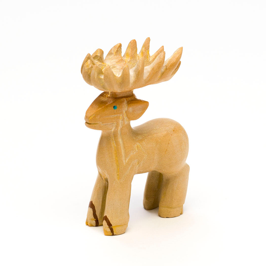 Bryston Bowannie's healthy Buck with on the watch eyes from turquoise inlays is sculpted from picture jasper. Deer are a direct reflection of the health of the environment. A balanced deer population will be a benefit to the forest with enough resources to support the herd, while an over population can impact plant growth and deplete resources. Beneficial Mountain-Lions, Wolves, Coyotes and Bears help balance ruminant populations. Bryston's buck has a grand rack of antlers and carved heartlines or breath paths on either side of this approximately 1 3/4" long, 7/8" wide and 2 5/8" tall wonderful carving.