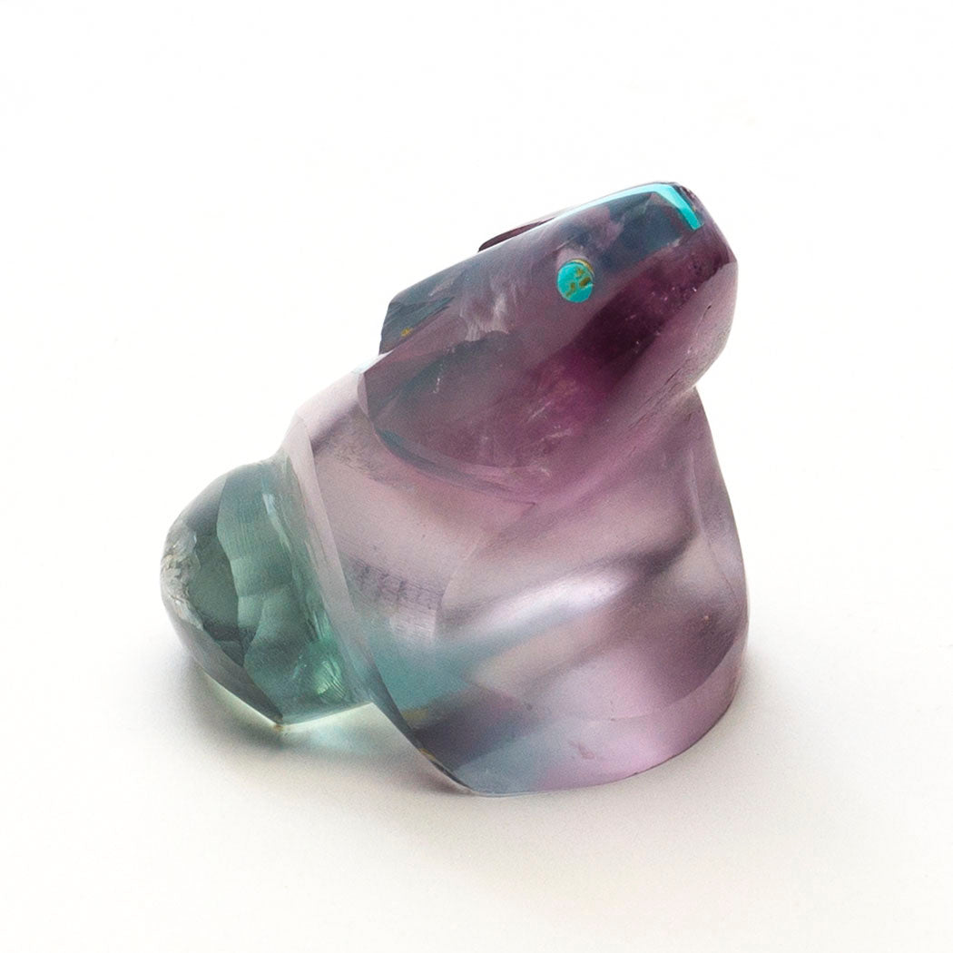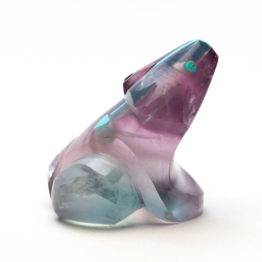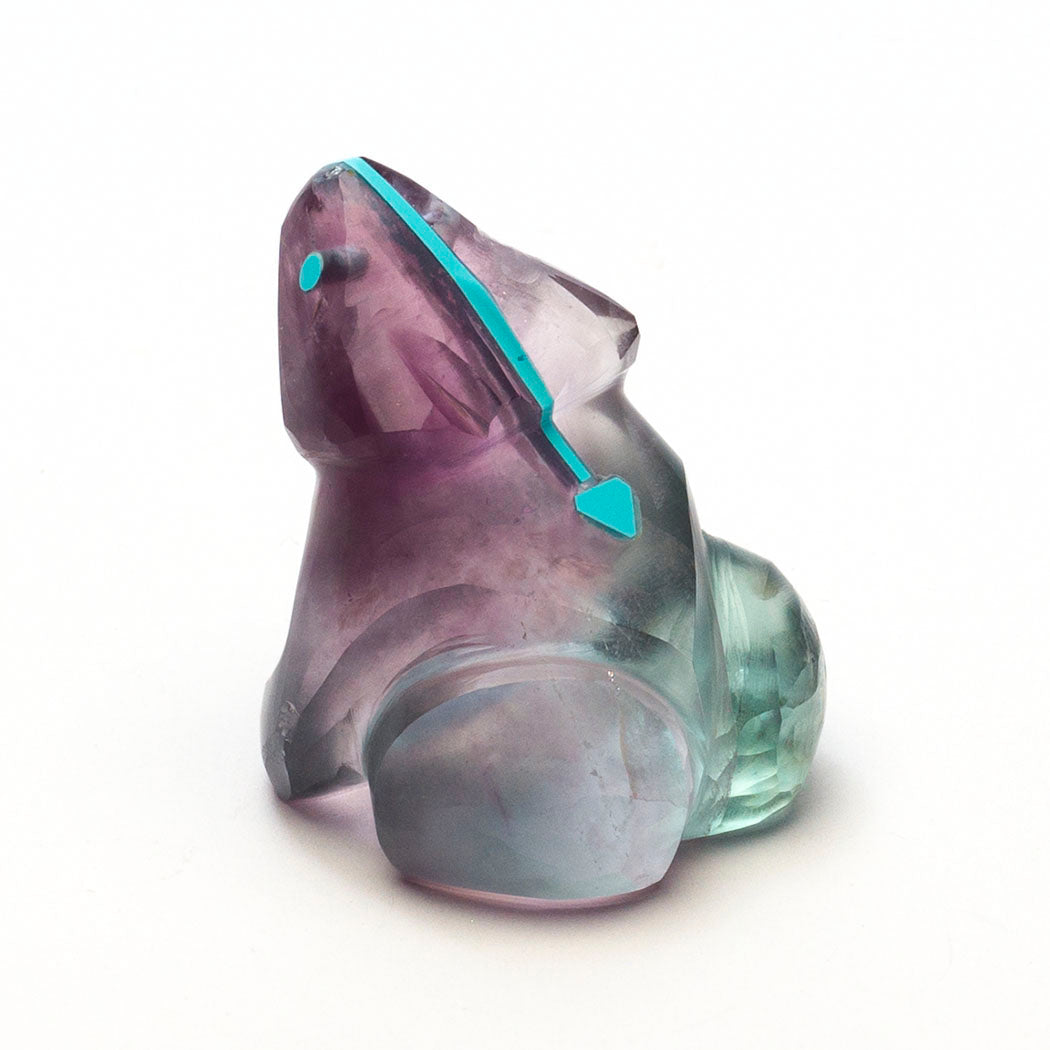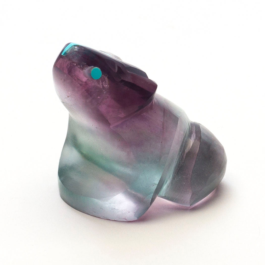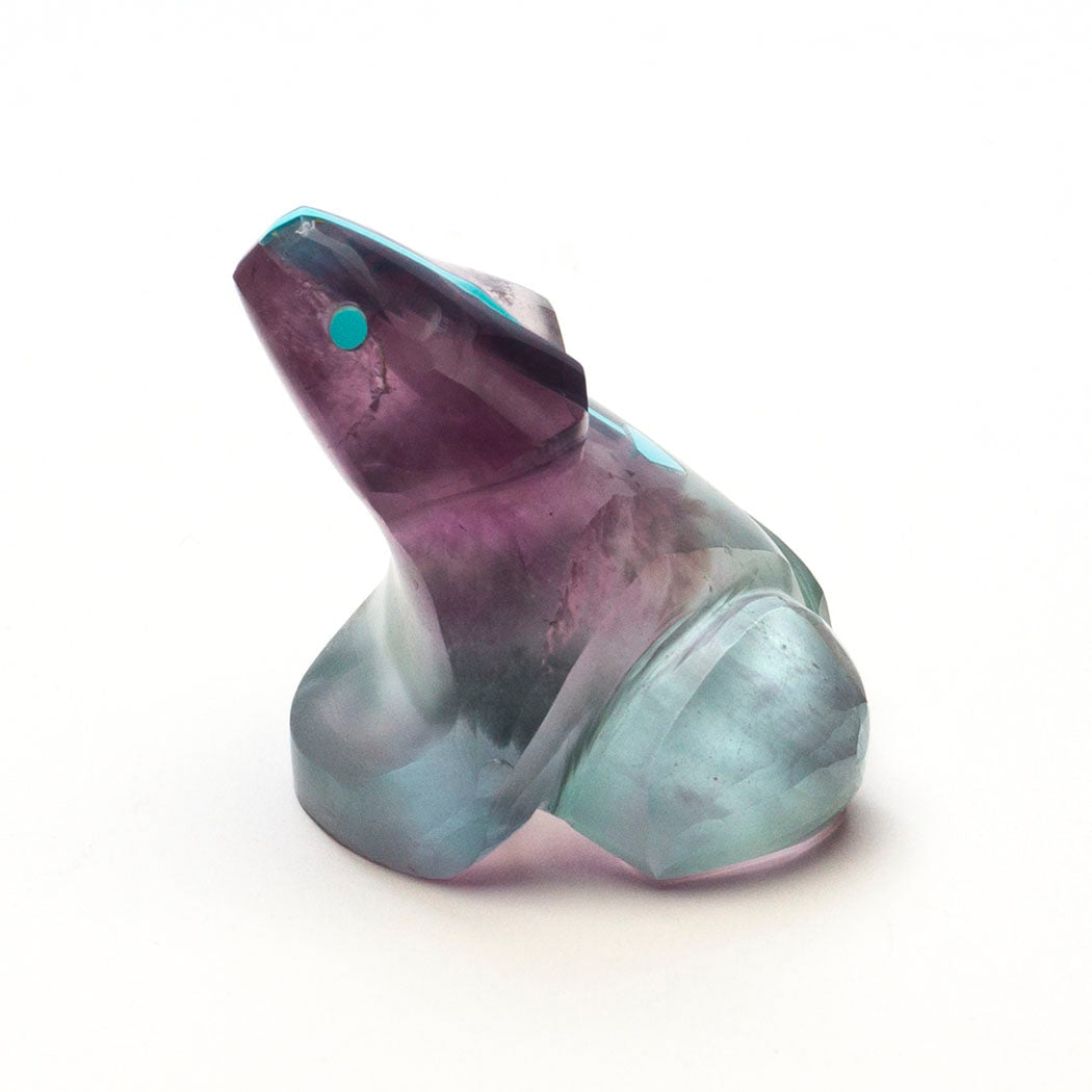 Indigenous Peoples have been in the company of horned Lizards since the beginning. Their likeness has been found on petroglyphs and pottery among other places. For the A:Shiwi (The People), horned lizards are highly-respected, associated with the Red Ant Society. Mexican cultures also honor them attributing the words: "Don't tread on me! I am the color of the earth and I hold the world; therefore walk carefully, that you do not tread on me." Kenric Laiwakete's lovely fluorite horned lizard inhales the morning's sweet freshness. A heartline or breath path and eyes are from clean turquoise inlays. Approximately 1 1/2" long, 1 3/8" wide and 1 5/8" tall.
