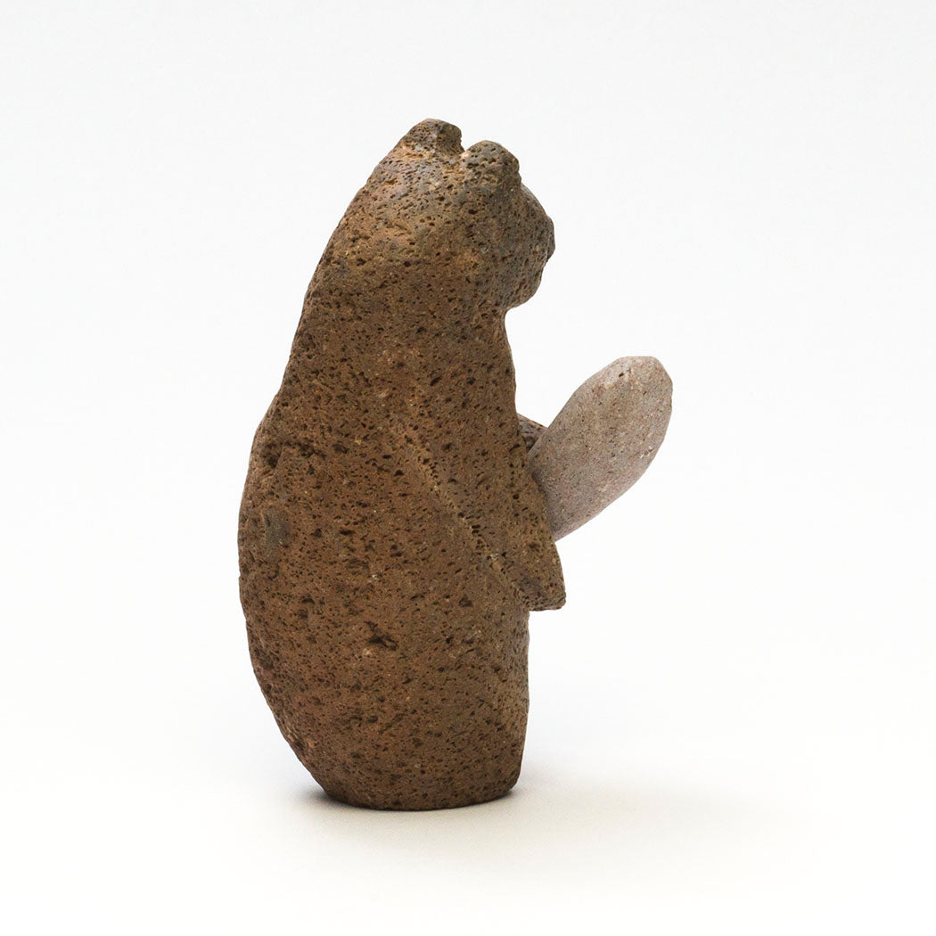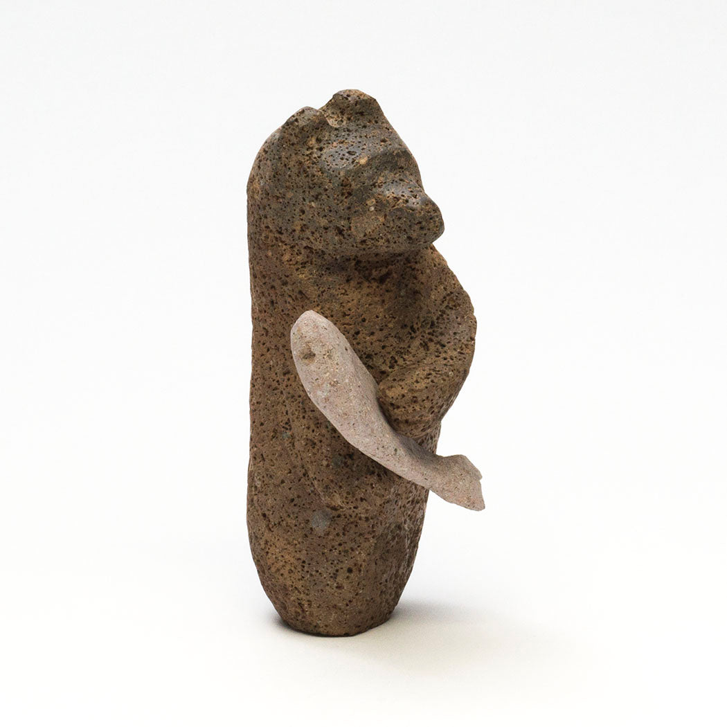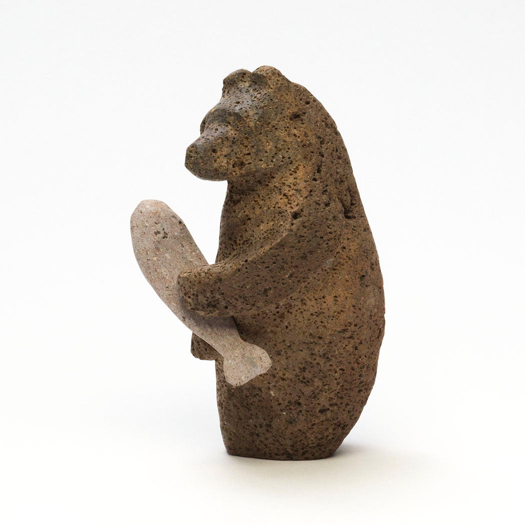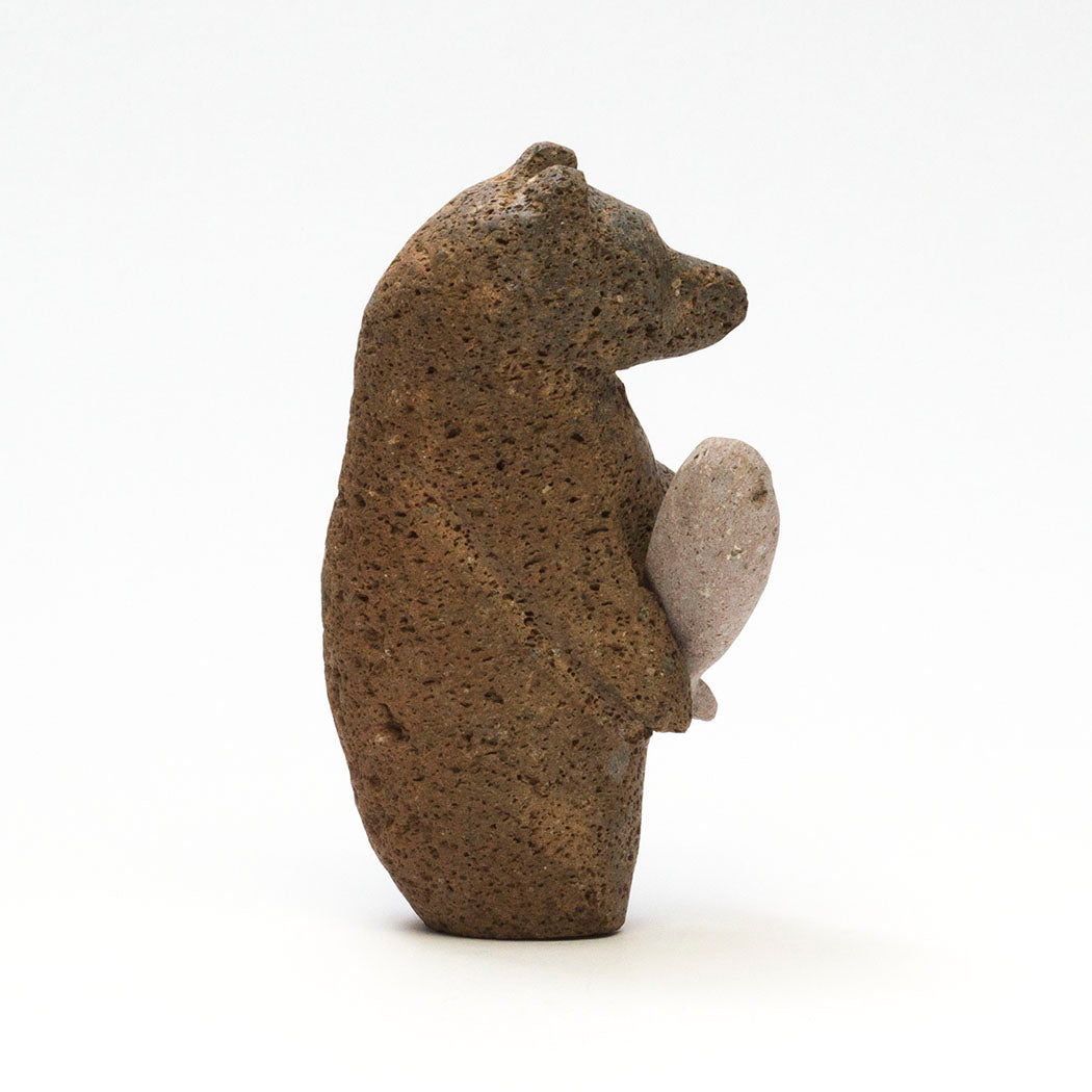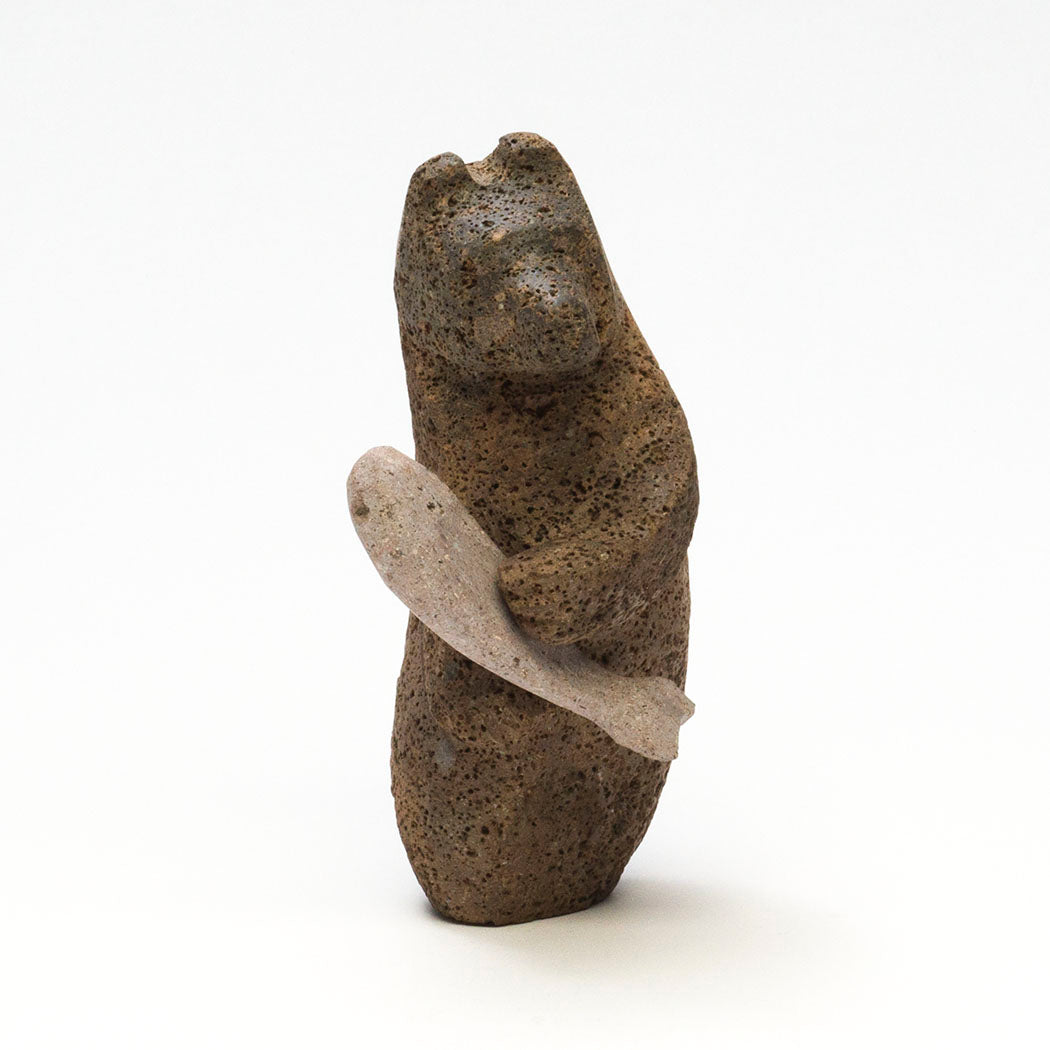 Bear is juggling a slippery fish in Salvador Romero delightful carving from two unique found stones, each with lovely variations and hues. Together, they measure approximately 5 1/2" tall, 2" wide and roughly 2 7/8" deep. The removable water creature itself is about 3 1/4" long and 7/8" wide. A collectible 2-piece set.