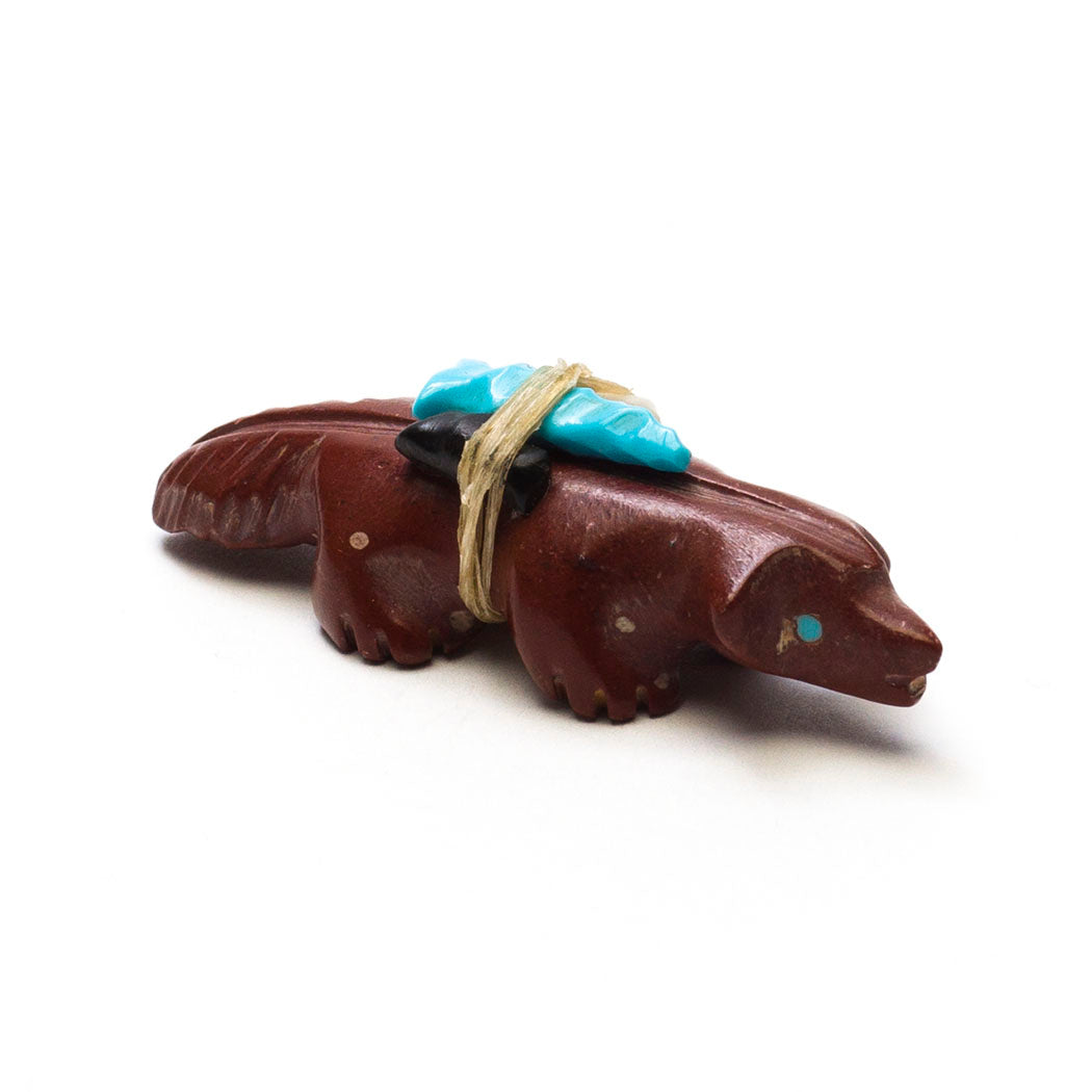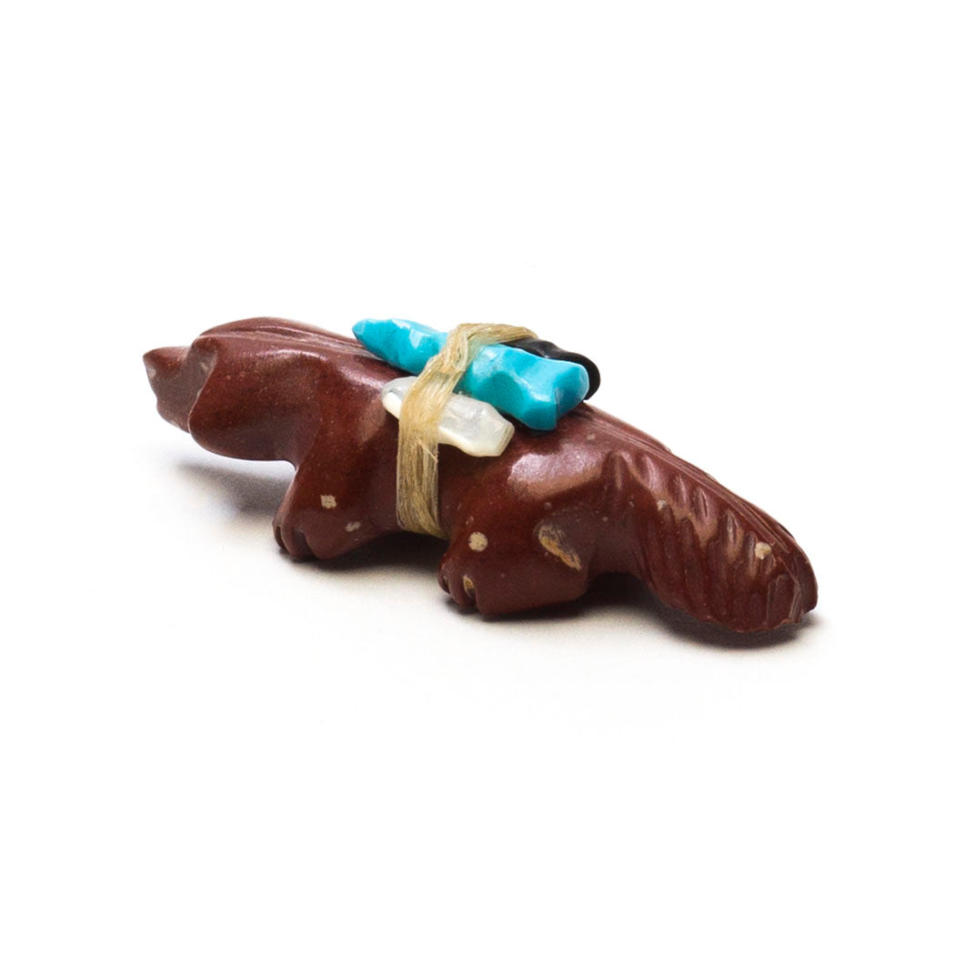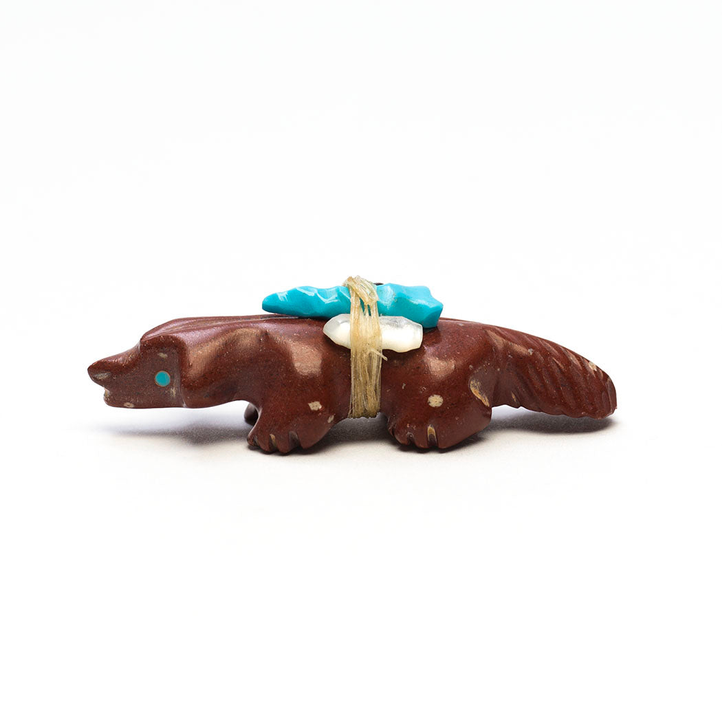 In a badger family, a male is referred to as a boar, a female is a sow and a young badger is a cub. Badgers are part of the Mustelidae family which also includes wolverines, weasels, skunks and otters, among others. The late Andres Quandelacy's pipestone Badger is a fossorial creature with nice turquoise eyes. A carved turquoise point is flanked by jet and mother-of-pearl pieces in the offering bundle. About 2" long, 3/4" wide and 5/8" tall.