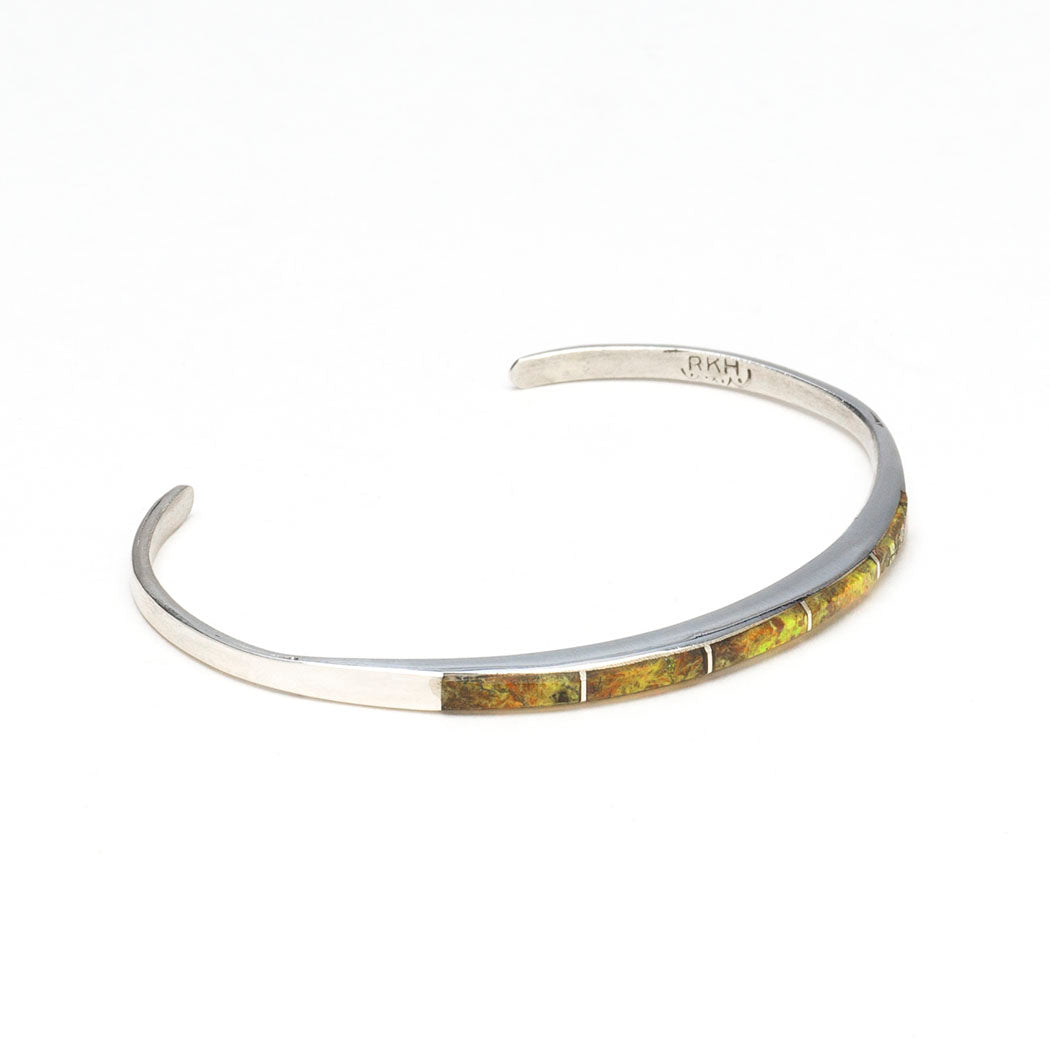 Zuni artists Rosalie Hustito and her late husband Charles Hustito created gorgeous handmade jewelry together for many, many years. She continues sharing incredible lapidary and silversmithing skills through a classic cuff bracelet from sterling silver and refreshing gaspeite, beautifully handmade in the channel inlay jewelry style. The elegant bracelet's entire inner circumference is about 6 1/4" which includes the opening of 1 1/4". The sleek bracelet is about 1/8" wide and 1/8" tall. Signed by the artist. A quick click here will help you in determining wrist measurements and best fit. Please click here to delve into the wonderful world of Zuni jewelry.