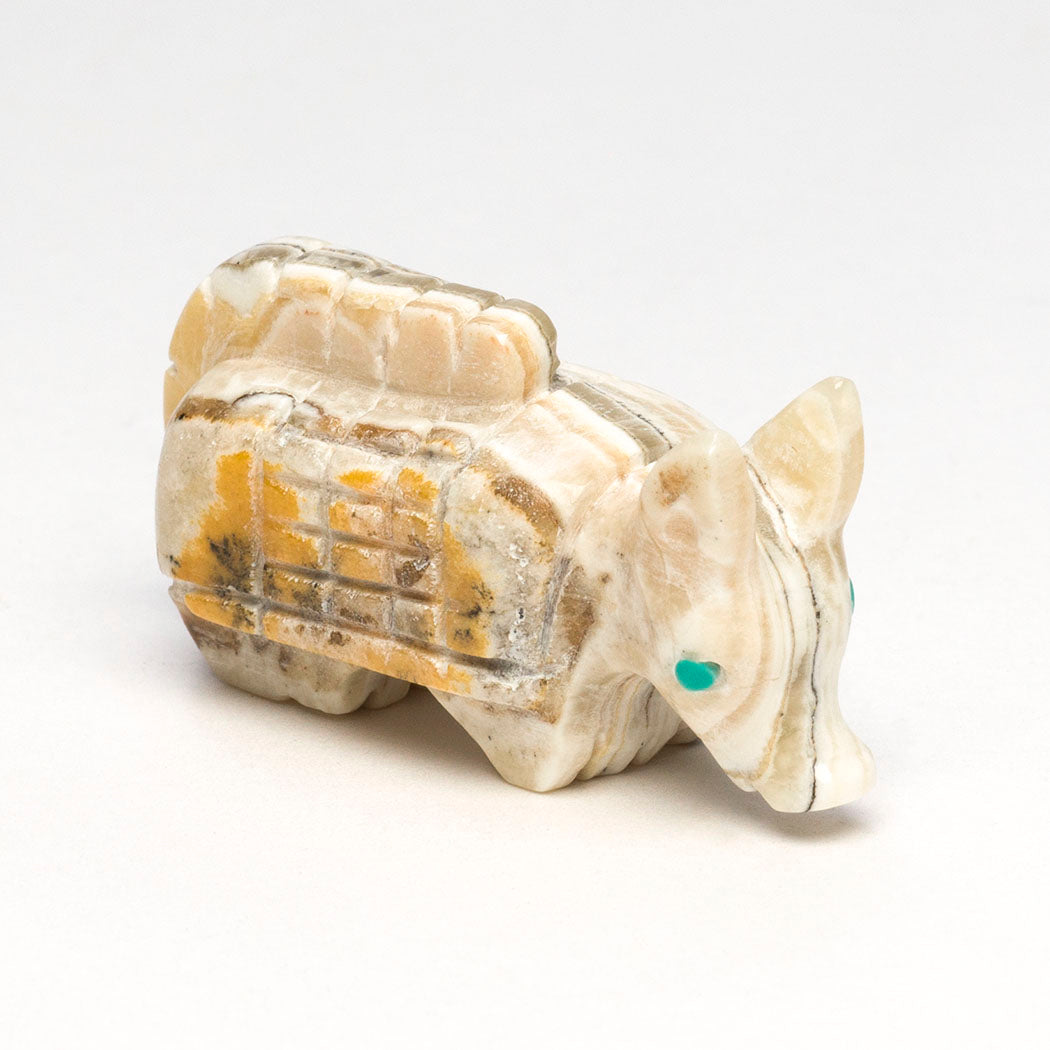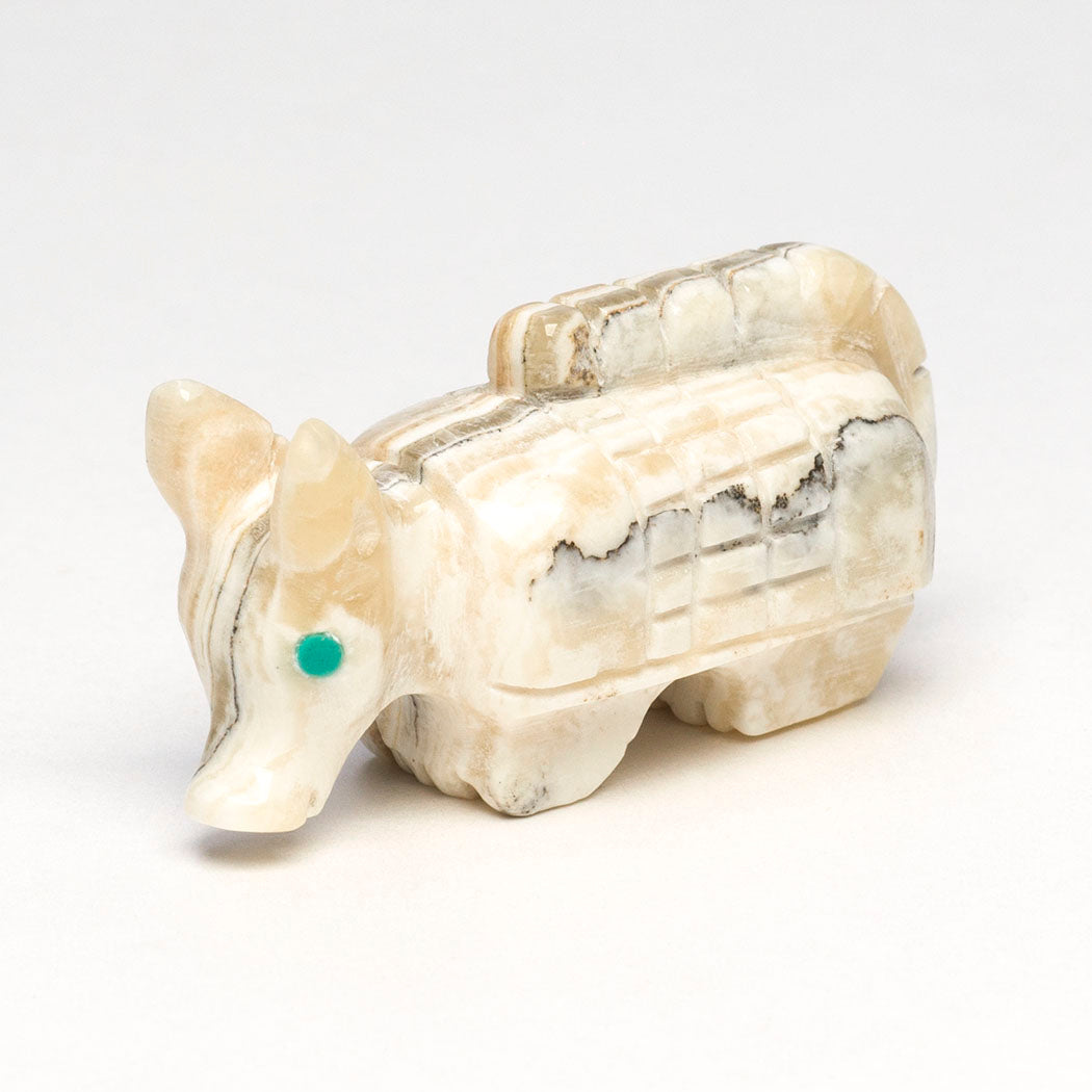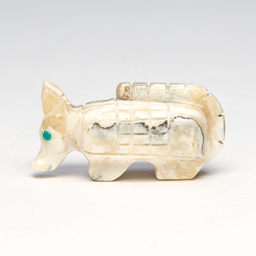 Mostly active starting at twilight and then by morning, armadillos who are intriguing and gentle mammals will have consumed many insects like termites. Fabian Tsethlikai's darling armadillo has been carved from onyx and has cute eyes from turquoise inlays. About 1 3/4" long, 5/8" wide and 7/8' tall.