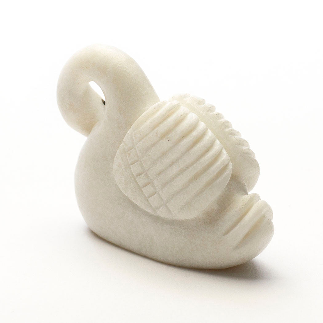 Zeus the supreme deity of the ancient Greeks transformed himself into a gentle swan to seduce the beautiful wife of King Tyndareus of Sparta. The daily activities of beloved swans such as feeding and swimming contribute to nutrient cycling because they stir up sediment which circulates nutrients and supports the health of aquatic plants and creatures like fish. We love Corwin Yamutewa's elegant swans. Sculpted from marble and inlaid with a jet beak and eyes, this collectible water creature is about 2" long, 5/8" wide and 1 3/8" tall.