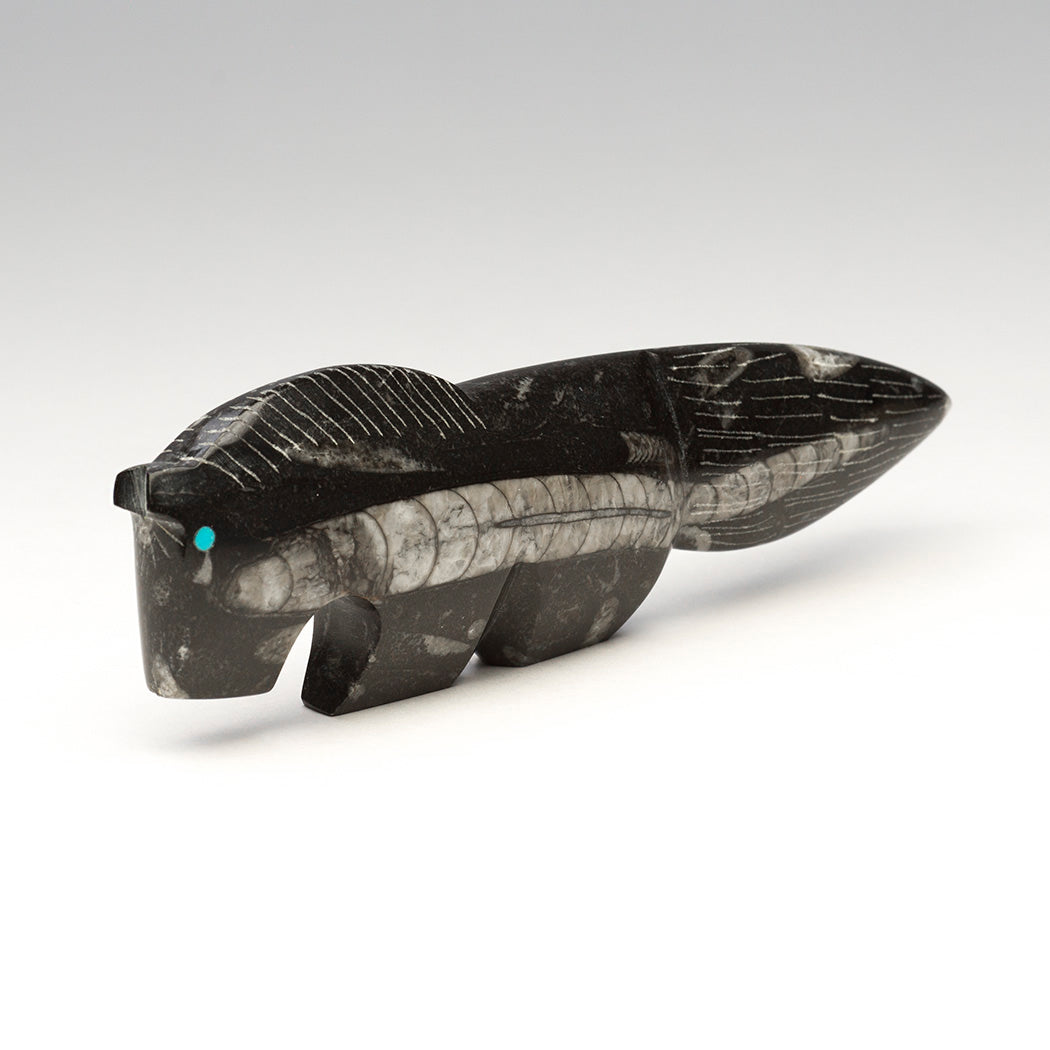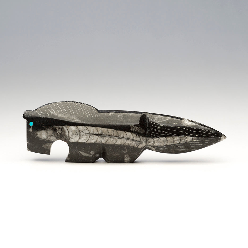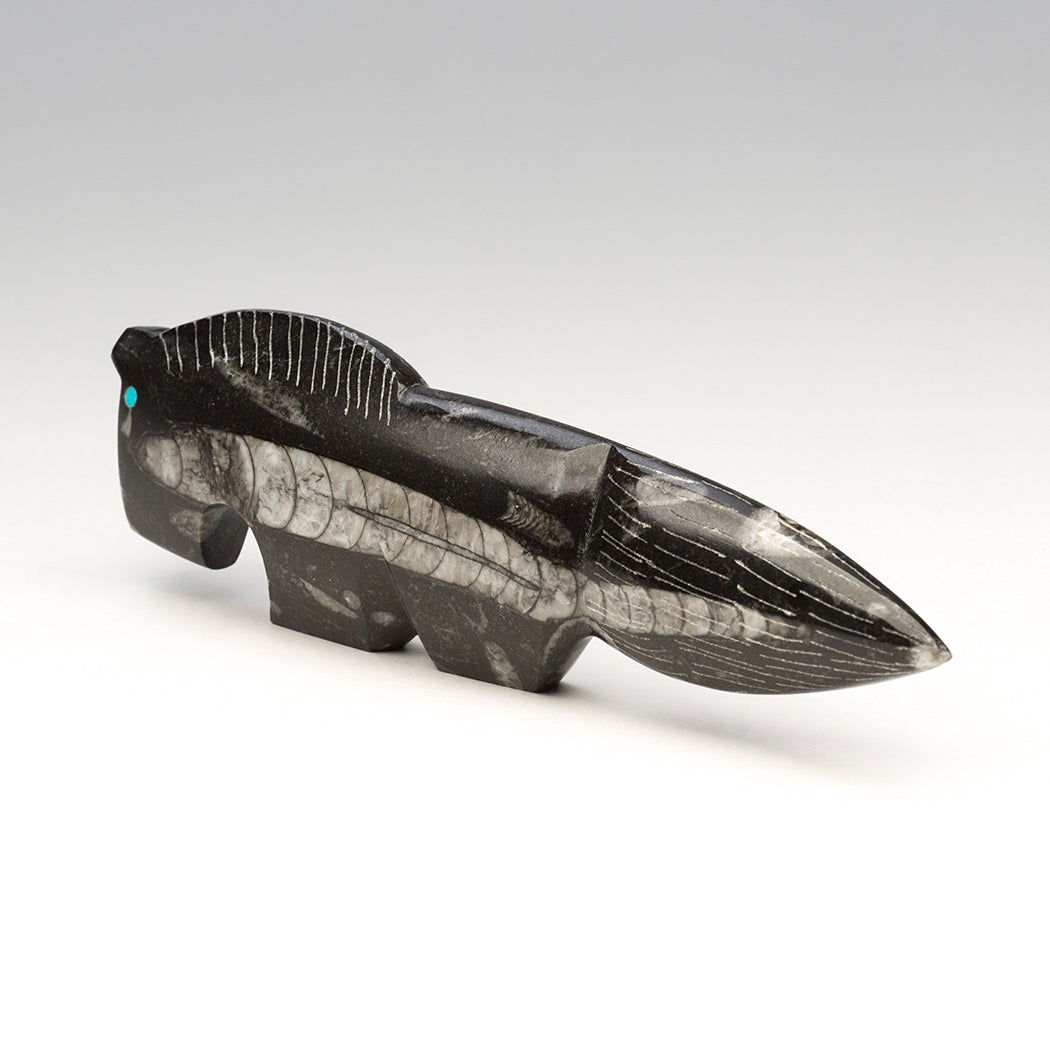 Ancient orthoceras cephalopods were tentacled hunters capturing food like trilobites and other small marine life making them active predators of Paleozoic seas. They left their mark as fossils lending a great sense of swiftness to Kenric Laiwakete's Horse. With a tail riding the wind, this speedy pony with a nicely etched mane is about 5 5/8" long, 5/8" wide and 1 5/8" tall. Eyes and an alternating heartline or breath path are from turquoise inlays.
