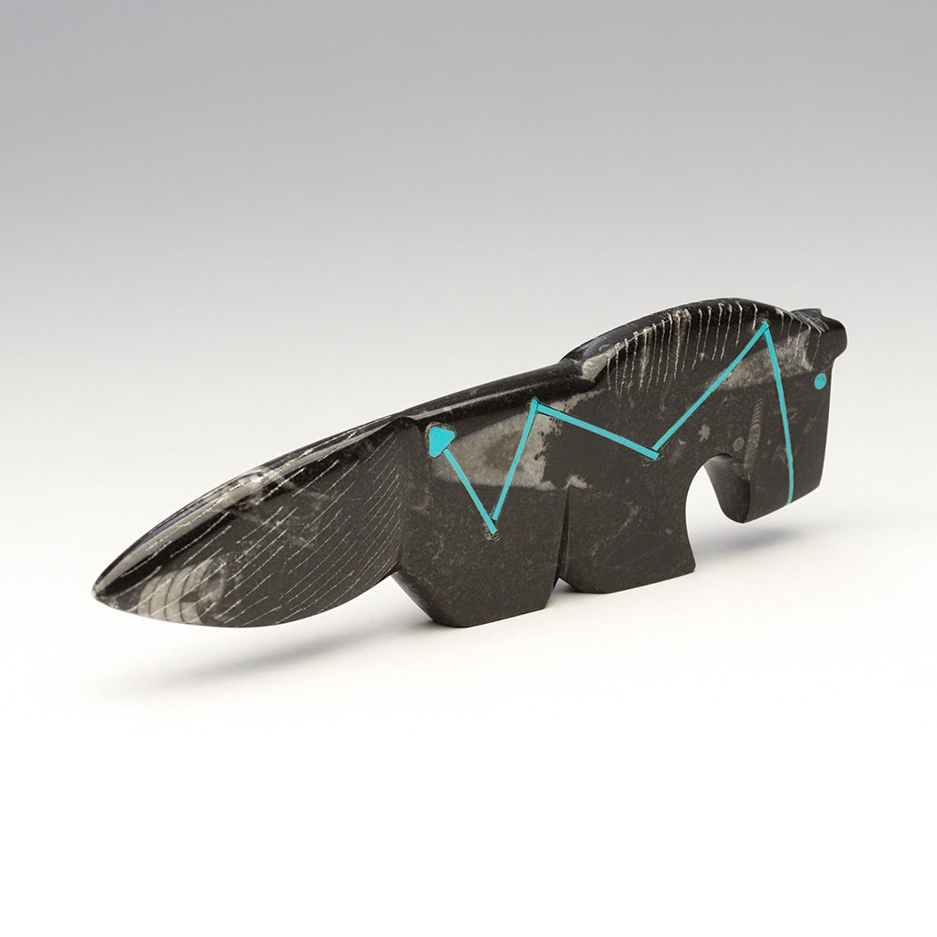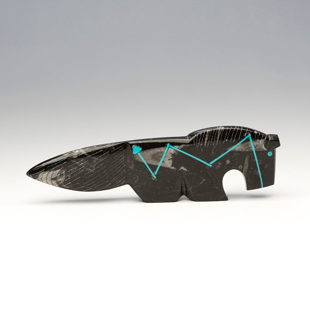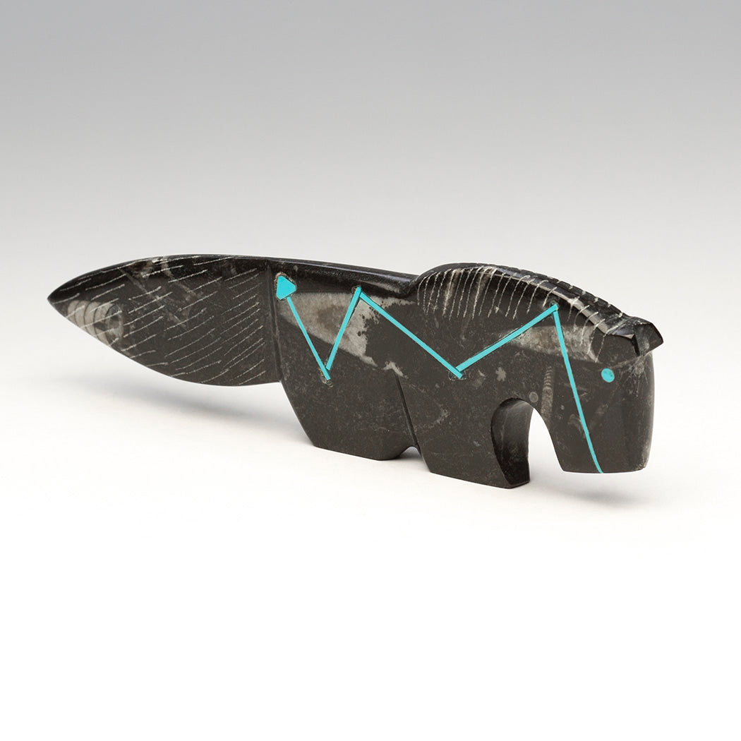 Ancient orthoceras cephalopods were tentacled hunters capturing food like trilobites and other small marine life making them active predators of Paleozoic seas. They left their mark as fossils lending a great sense of swiftness to Kenric Laiwakete's Horse. With a tail riding the wind, this speedy pony with a nicely etched mane is about 5 5/8" long, 5/8" wide and 1 5/8" tall. Eyes and an alternating heartline or breath path are from turquoise inlays.