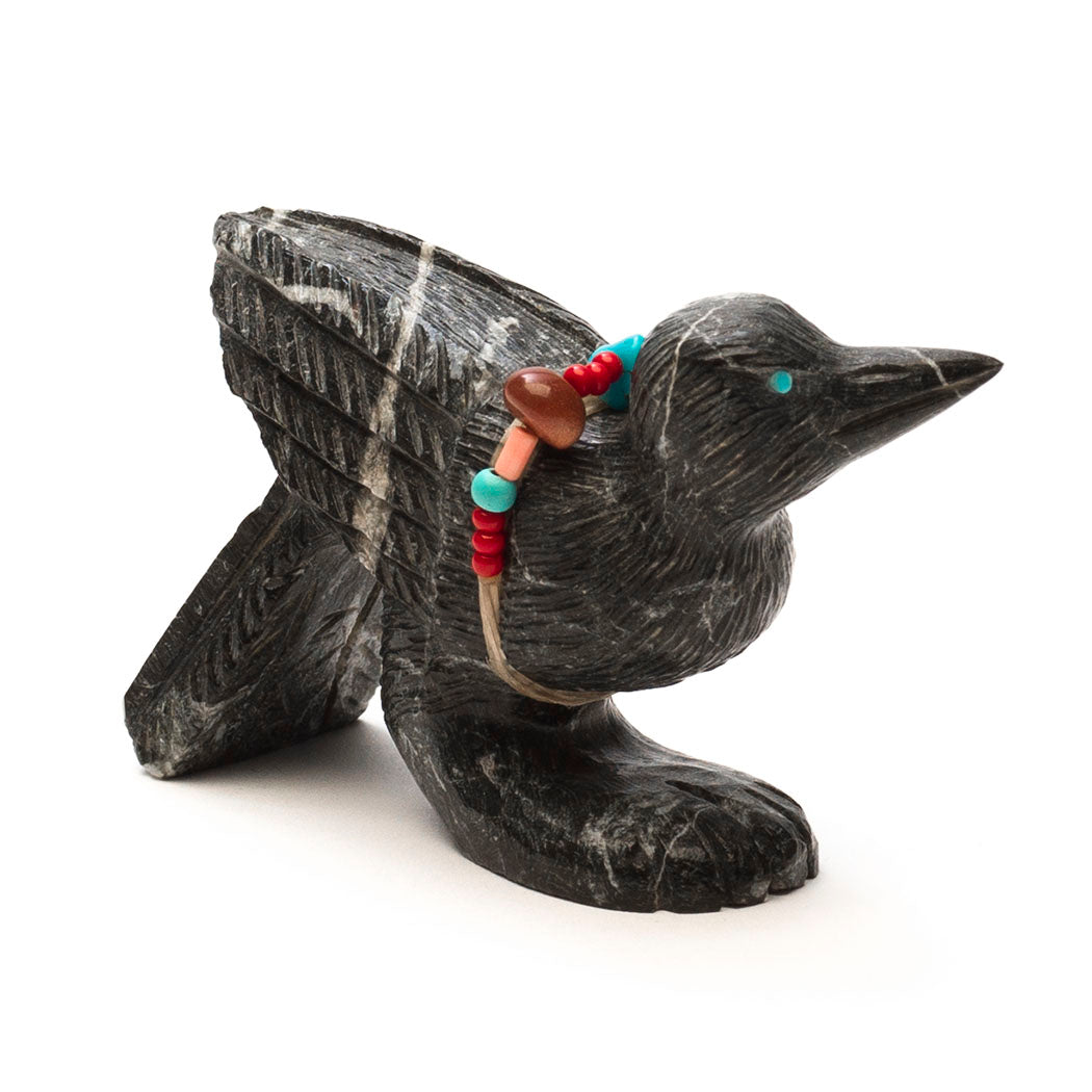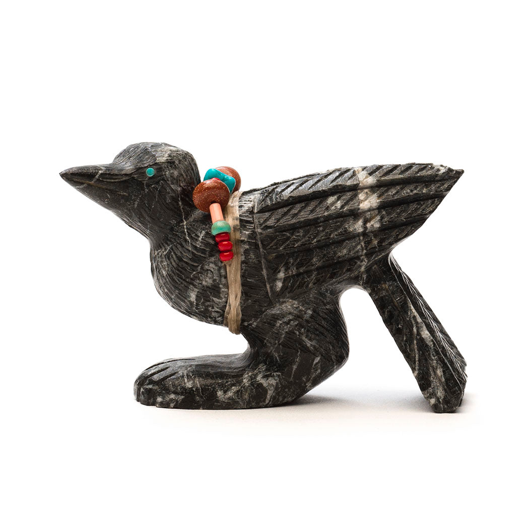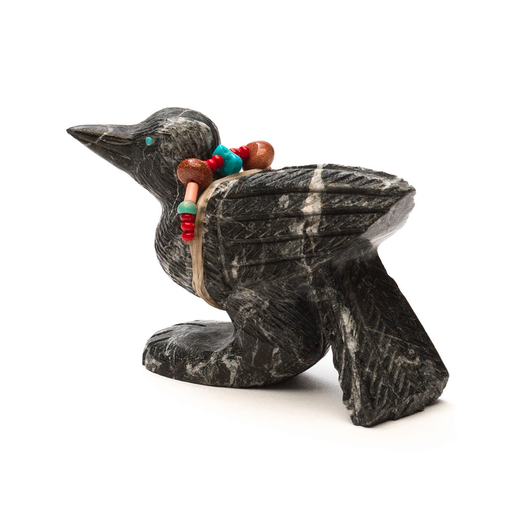 Crow's wisdom is woven into ancient Indigenous stories. Many knew crows could communicate with humans as well as their own kind, telling the flock if a human is a friend or foe. Crows make certain calls and bestow small gifts if you are kind to them. Super smart, they are effective scavengers acting as Mother Earth's housekeepers. Douglas Martza's lively crow (or Raven) has stopped by for a quick visit carved from marble etched with handsome plumage. Sensing eyes are from turquoise inlays and a colorful offering bundle has brown sparkle gold stone, turquoise, red coral and melon shell beads in various shapes and sizes. About 2 5/8" long, 1" wide and 1 5/8" tall.