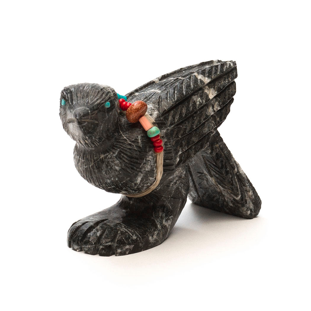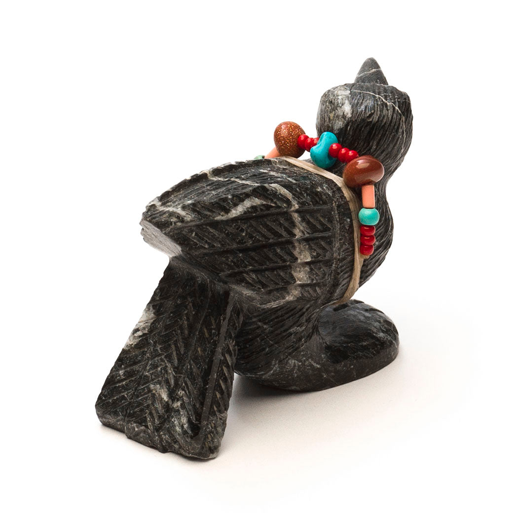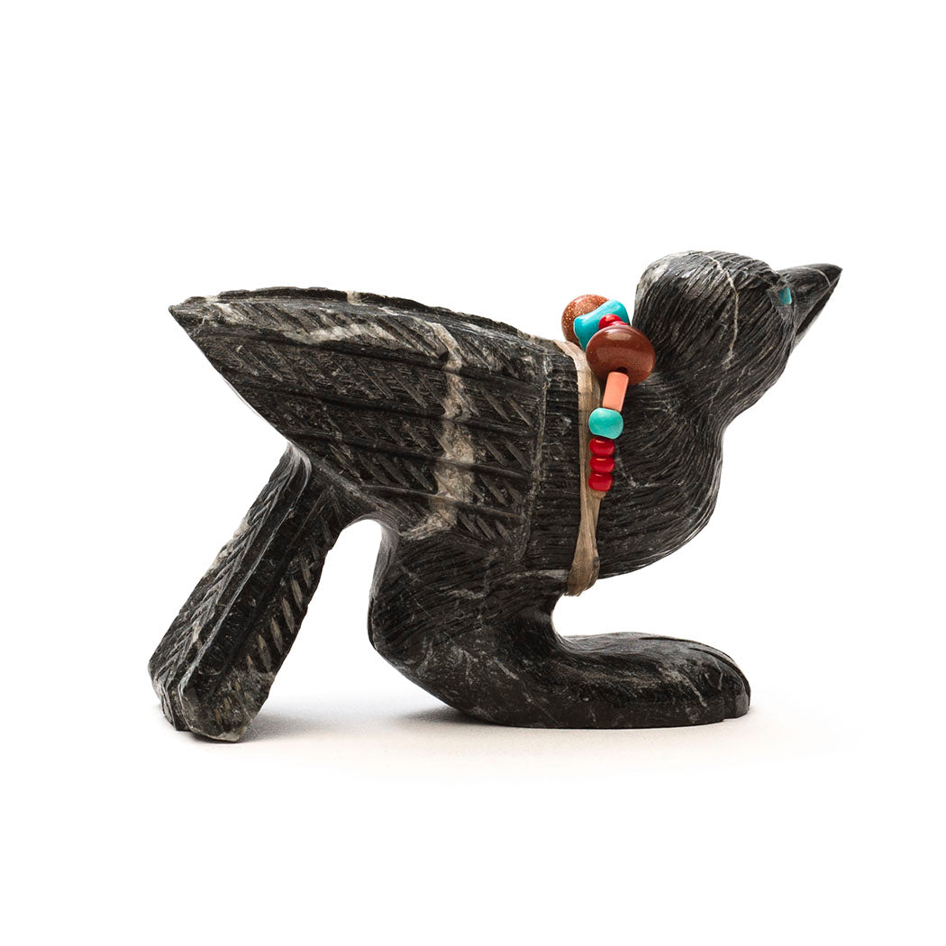 Crow's wisdom is woven into ancient Indigenous stories. Many knew crows could communicate with humans as well as their own kind, telling the flock if a human is a friend or foe. Crows make certain calls and bestow small gifts if you are kind to them. Super smart, they are effective scavengers acting as Mother Earth's housekeepers. Douglas Martza's lively crow (or Raven) has stopped by for a quick visit carved from marble etched with handsome plumage. Sensing eyes are from turquoise inlays and a colorful offering bundle has brown sparkle gold stone, turquoise, red coral and melon shell beads in various shapes and sizes. About 2 5/8" long, 1" wide and 1 5/8" tall.