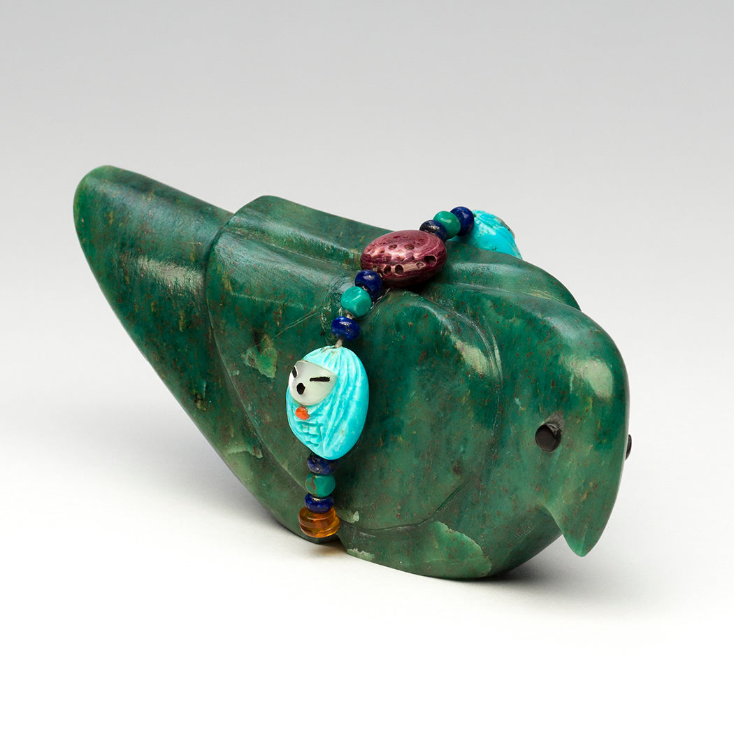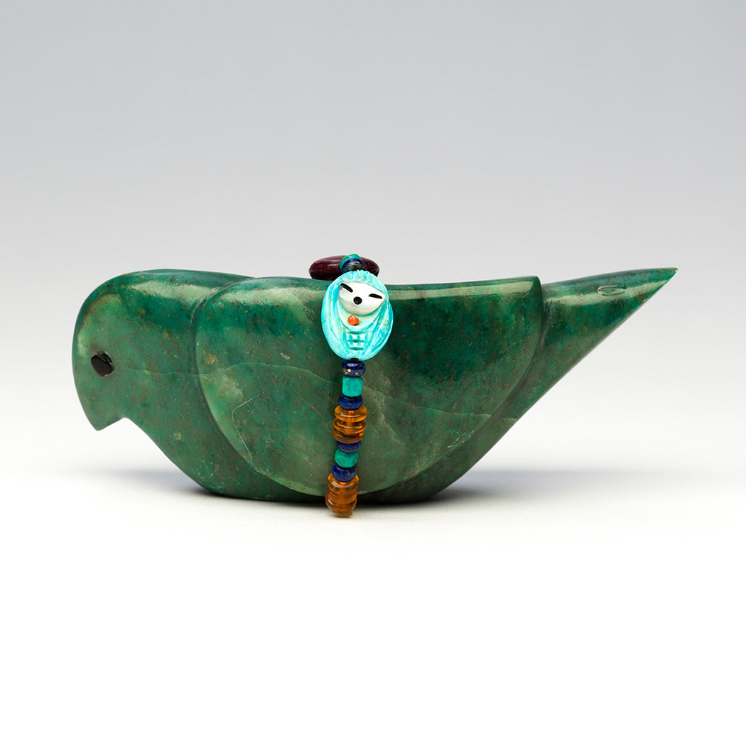 All living things possess special qualities that make them powerful beings including all feathered friends who always lift our spirits. When you can't go outside and watch the birds, Kateri Quandelacy Sanchez's feathered friend will keep you happy company. An offering bundle of thankfulness for our avian companions is from colorful beads like purple spiny oyster shell, lapis lazuli, sky blue turquoise and warm amber. Two unique ones are from turquoise carved in the form of tiny Corn-Maidens with overlaid faces from iridescent mother-of-pearl. They're accented with red coral inlays. Sculpted from a stunning green granite, this perched wonder with sweet eyes from jet inlays is roughly 4 1/8" long, 1 3/4" wide and 1 3/4" tall.