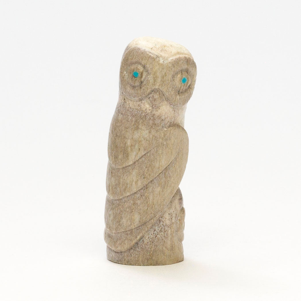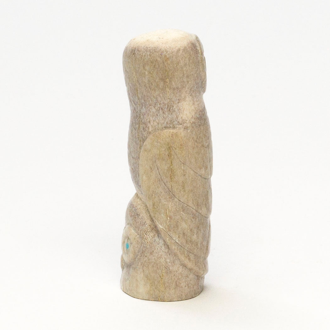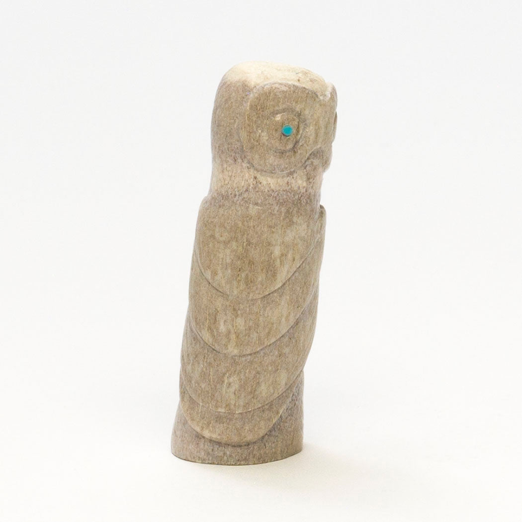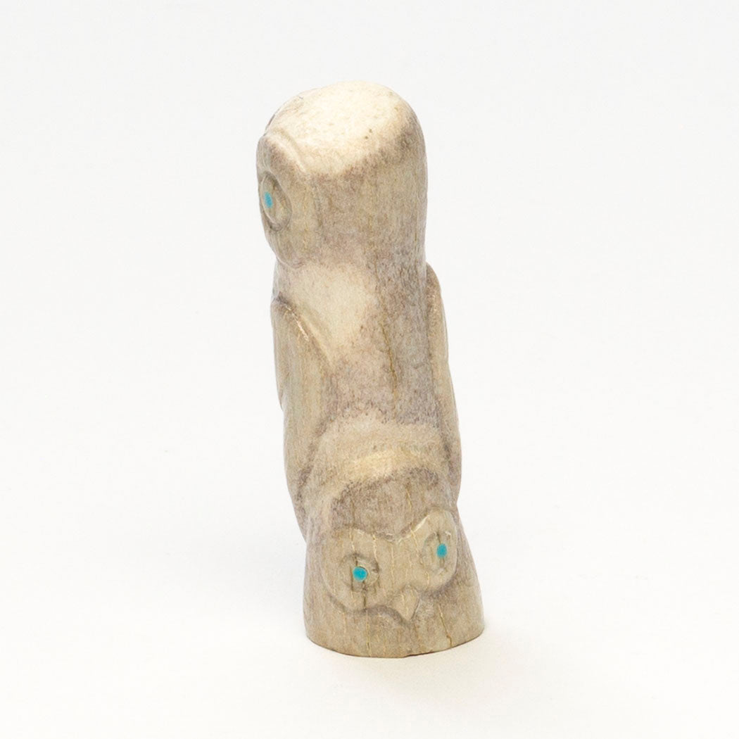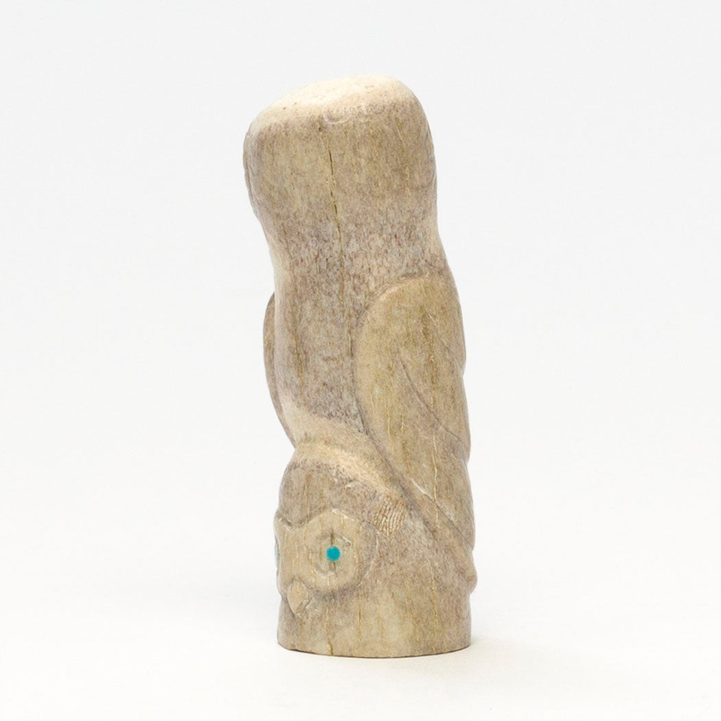 Maxx Laate's antler Owls are like the quintessential raptors of fairytales and storybooks, wonderfully mysterious in deep-hooting voices and quiet ways. The A:Shiwi (The People) call the owl “the Night Grandfather” because he does his work at night. Ever-watchful eyes are from turquoise set to rounded eye sockets, while softly sculpted plumage is beautifully layered. Guardian bird and owlet measure approximately 2 5/8" tall, 7/8" wide and 7/8" deep.